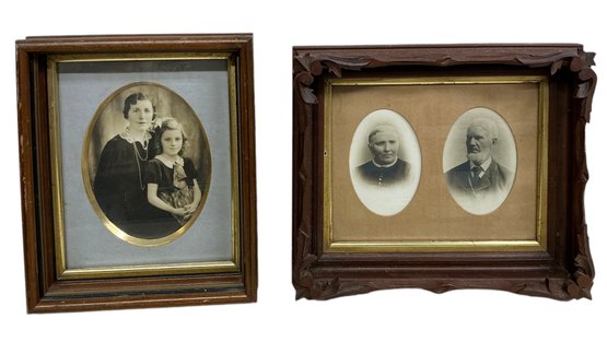 Two Antique Victorian Deep Frame Wooden Picture Frames With Ancestor Portraits One Carved. Each in good condition. The larger frame is approx. 11.5” by 13.5” by 2.25.”