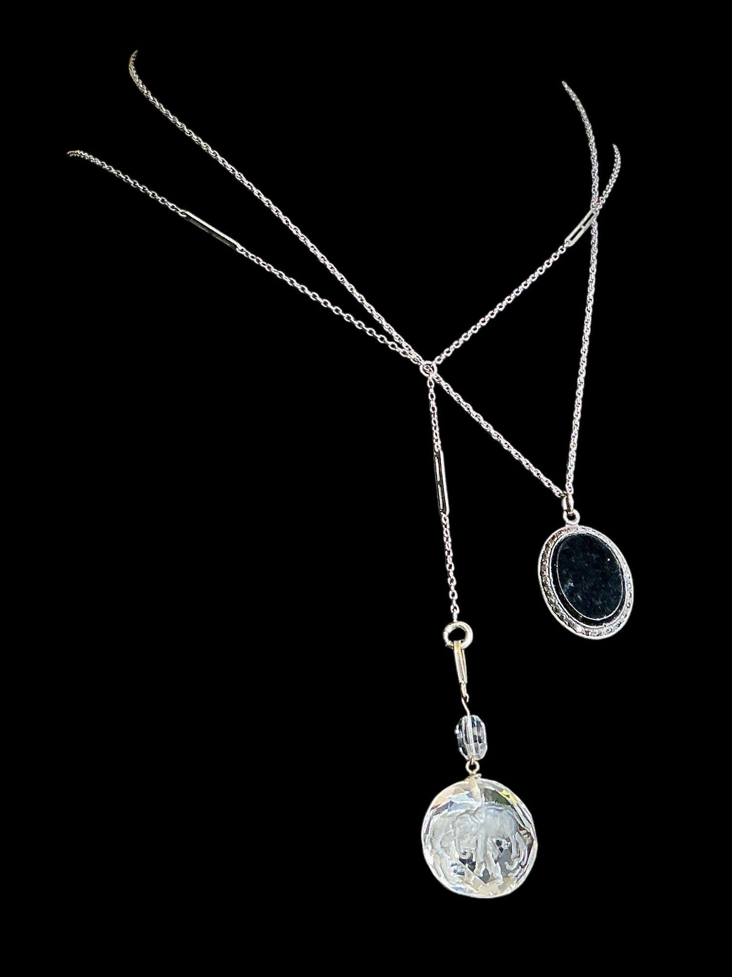 Two Antique Victorian Pendant Necklaces Elephant In Crystal Pendant, two unique antique necklaces. Metal is unmarked on both necklaces.