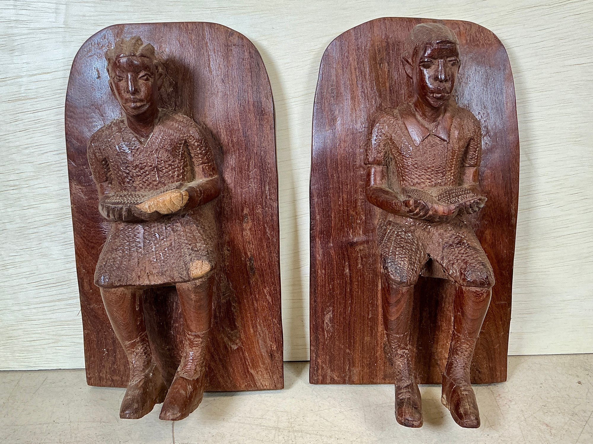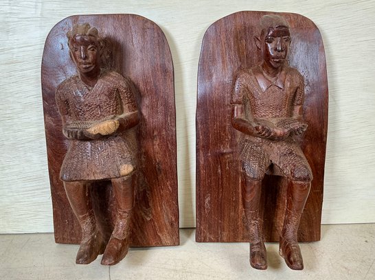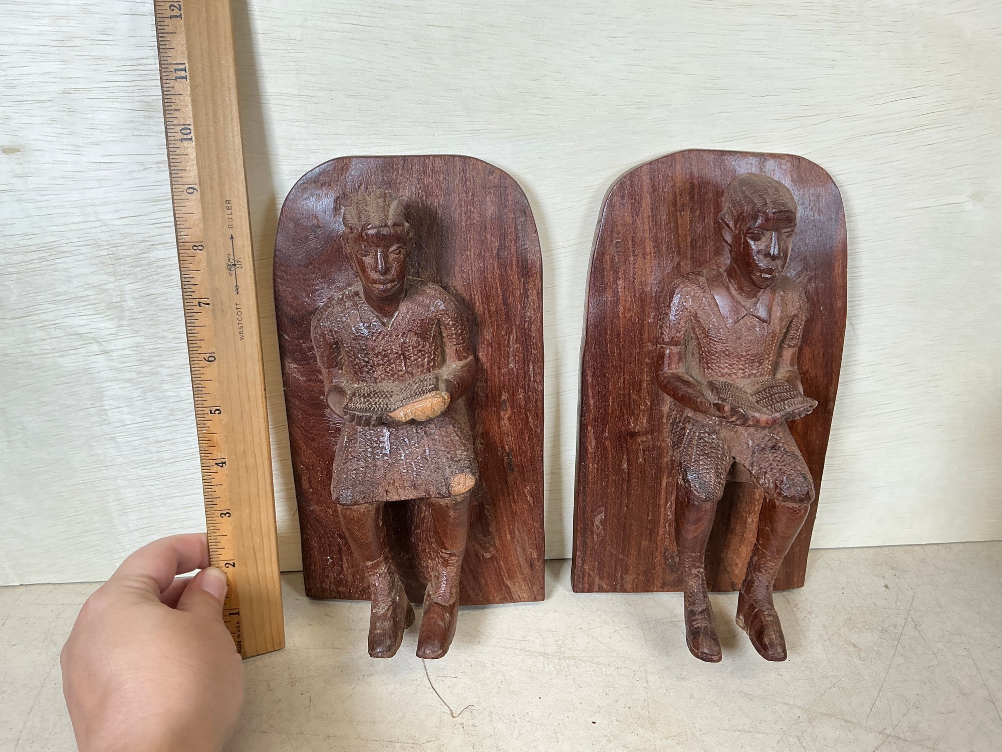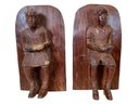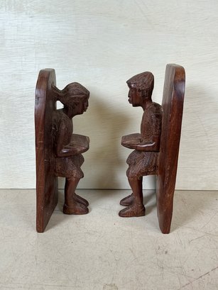 Two Carved Folk Art Wooden Bookends Reading Figures, these measure 9.5” tall.