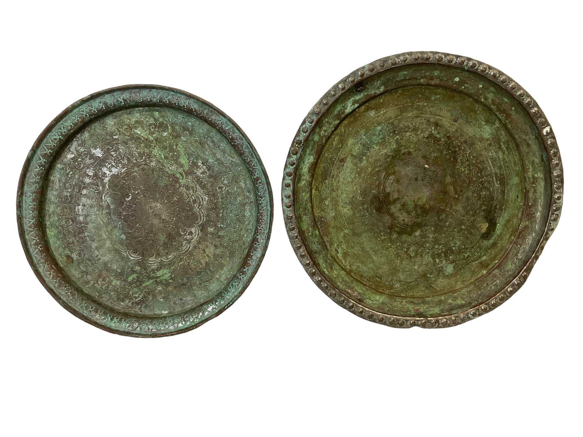 Two Distressed Middle Eastern Metal Trays Plant Under Trays Garden Decor. Both in fair used condition with wear, dents and some nice patina. The largest is approx. 12.5” in diameter.