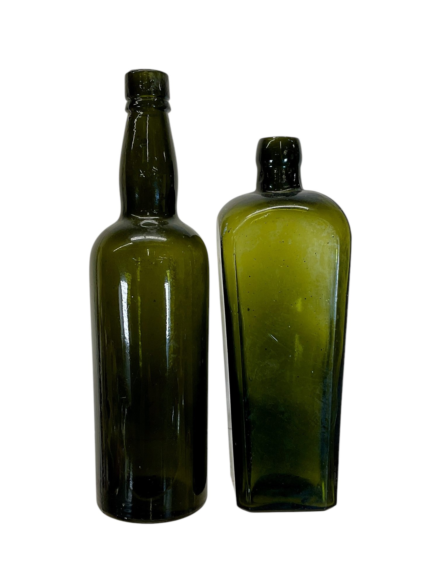 Two Large Green Antique Glass Bottles, taller is 11.5” tall. No chips or cracks on either.