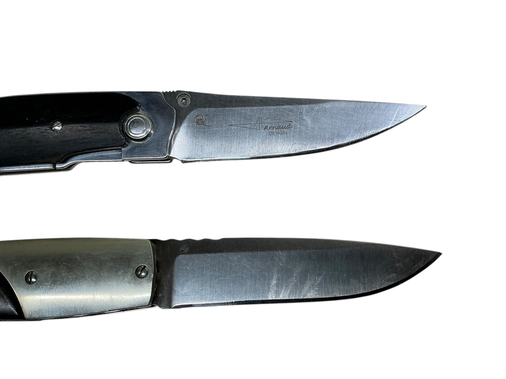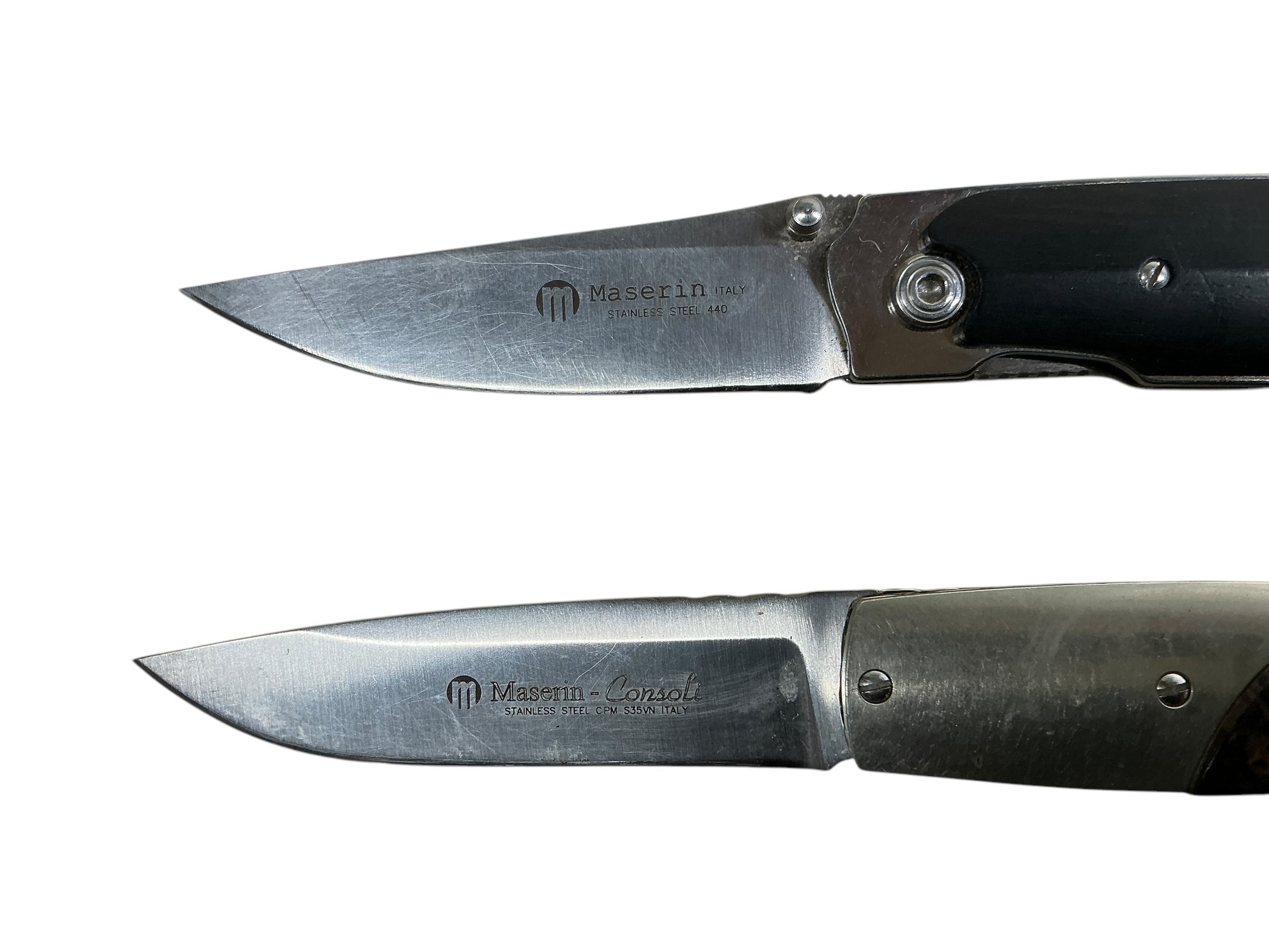 This is for a lot of Two Maserin Folding Pocket Knives Arno Line Jean Marc Arnaud And Consoli. Both in good used condition with obvious wear. Longest knife fully open is approx. 7”.