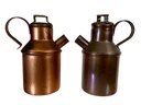Two Miniature Antique Or Vintage Copper Milk Or Cream Jugs, 6.5” tall, one has a broken rivet where the handle connects.
