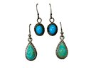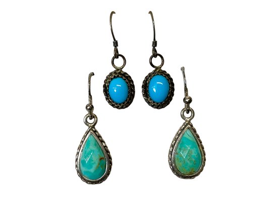 Two Pairs Of Sterling And Turquoise Drop Earrings Native American Made, the smaller pair come with a small backing giving Native American provenance. Both are marked sterling and guaranteed. Larger pair measures just over 1” in total length.