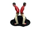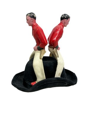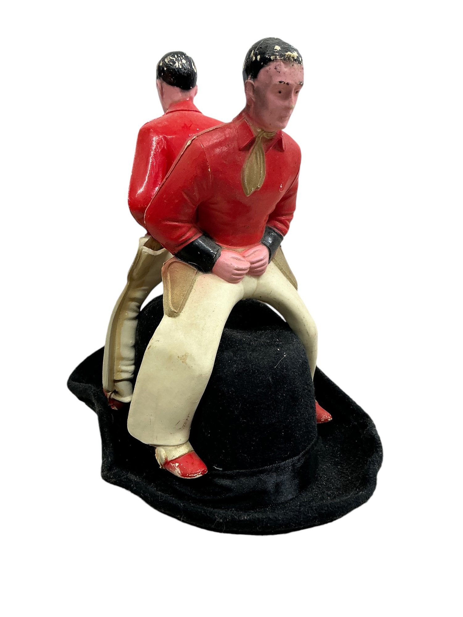 Two Plastic Cowboys Astride A Miniature Hat Outsider Art Assemblage. In good used condition with some minor wear and paint loss to the plastic figures. It is approx. 7.5” tall.