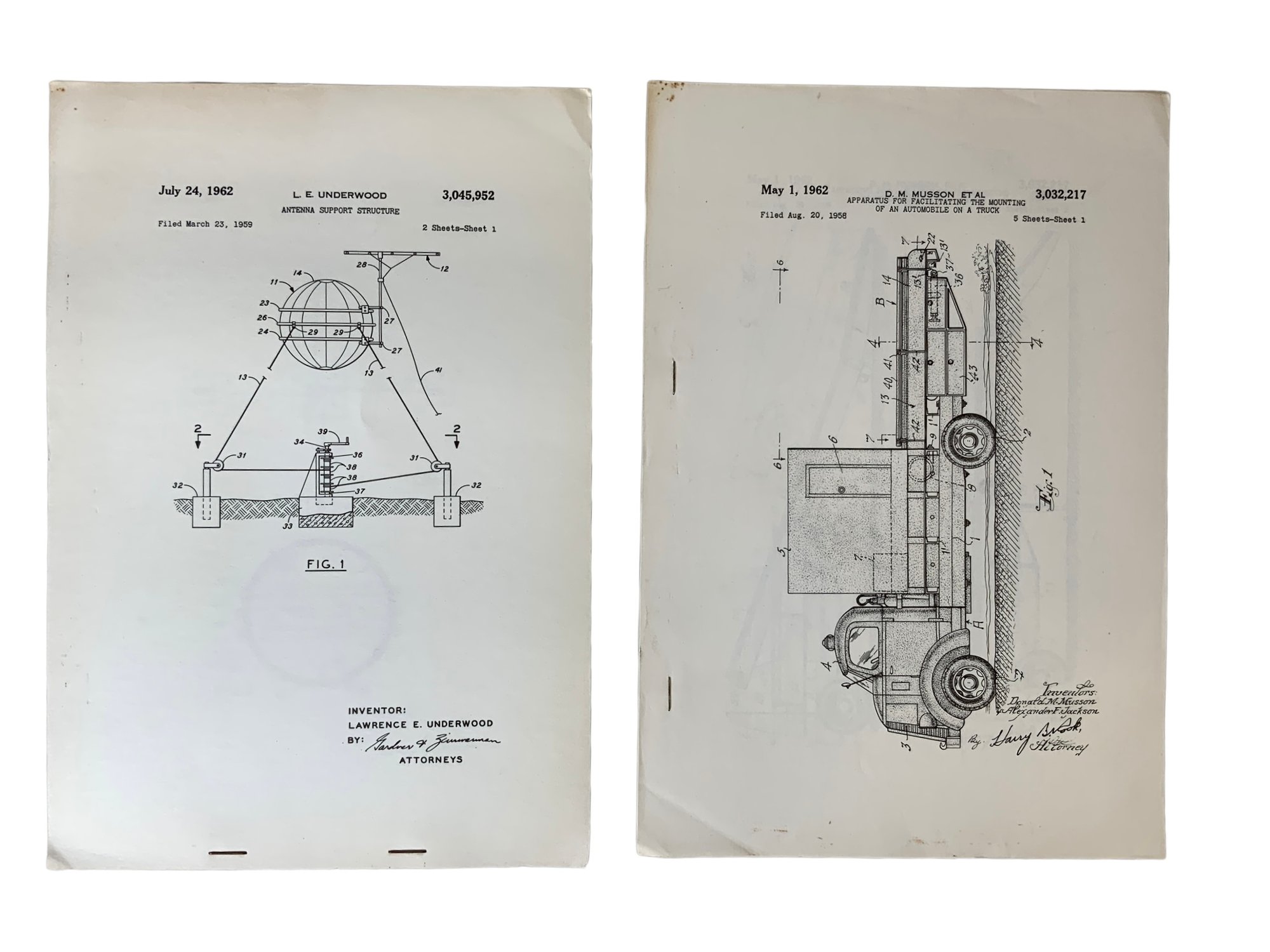 Two Vintage 1962 Patents Apparatus For Mounting An Automobile On A Truck And Antenna Support Structure. In good condition. Each is approx. 11.25” by 8”.