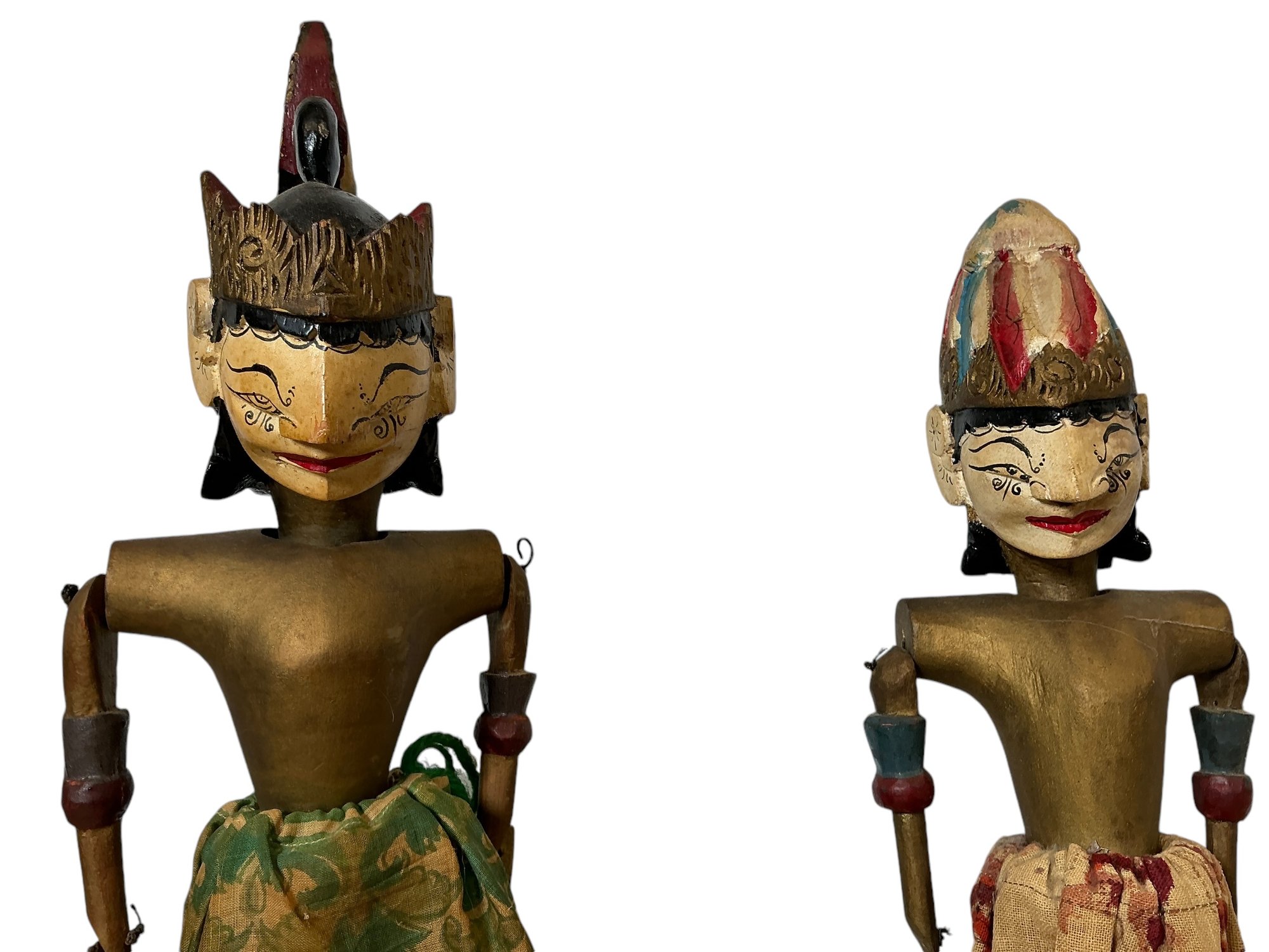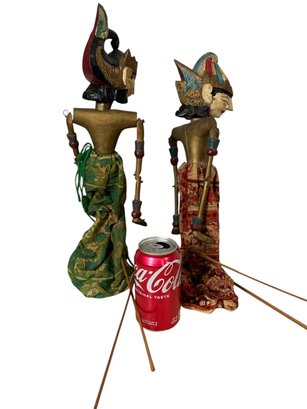 Two Vintage Indonesian Stick Puppets. One has a stand the other one does not have a stand. Tallest is approx. 17.”