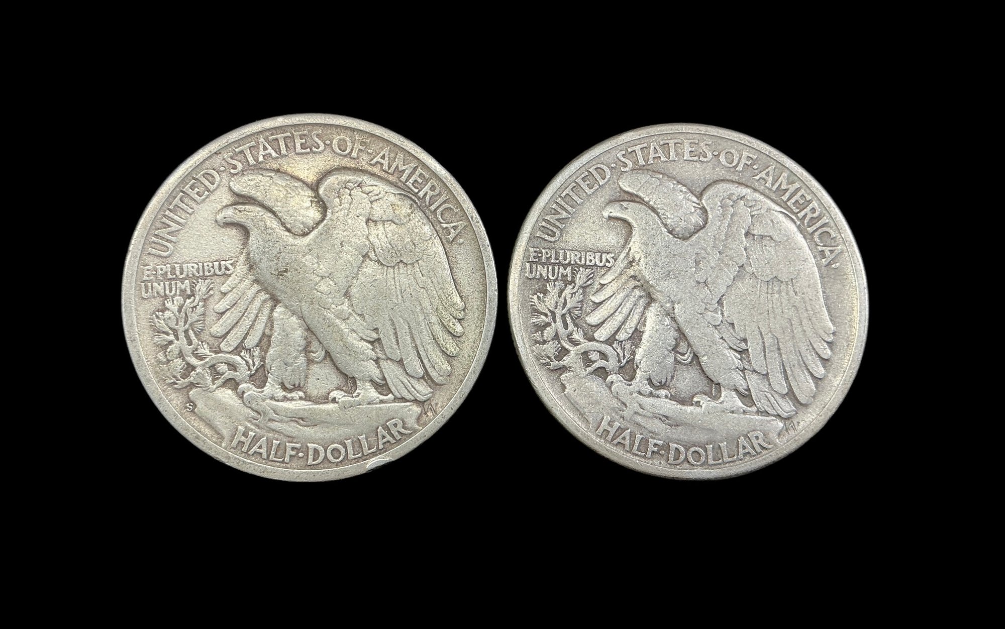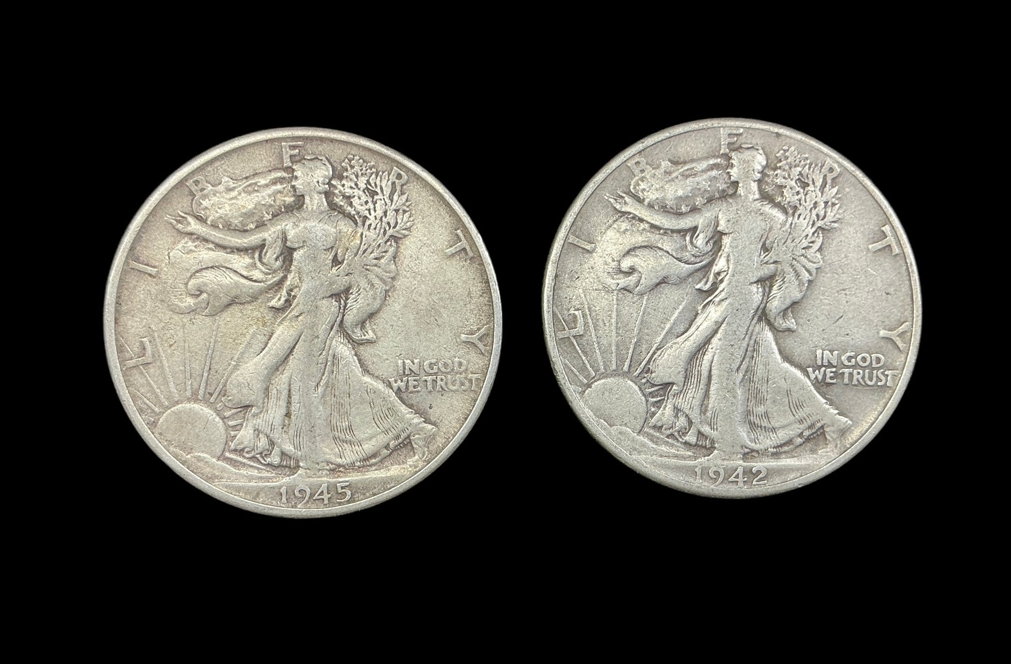 Two Vintage Walking Liberty Silver Half Dollar Coins 1942 And 1945 S. See pics for condition.