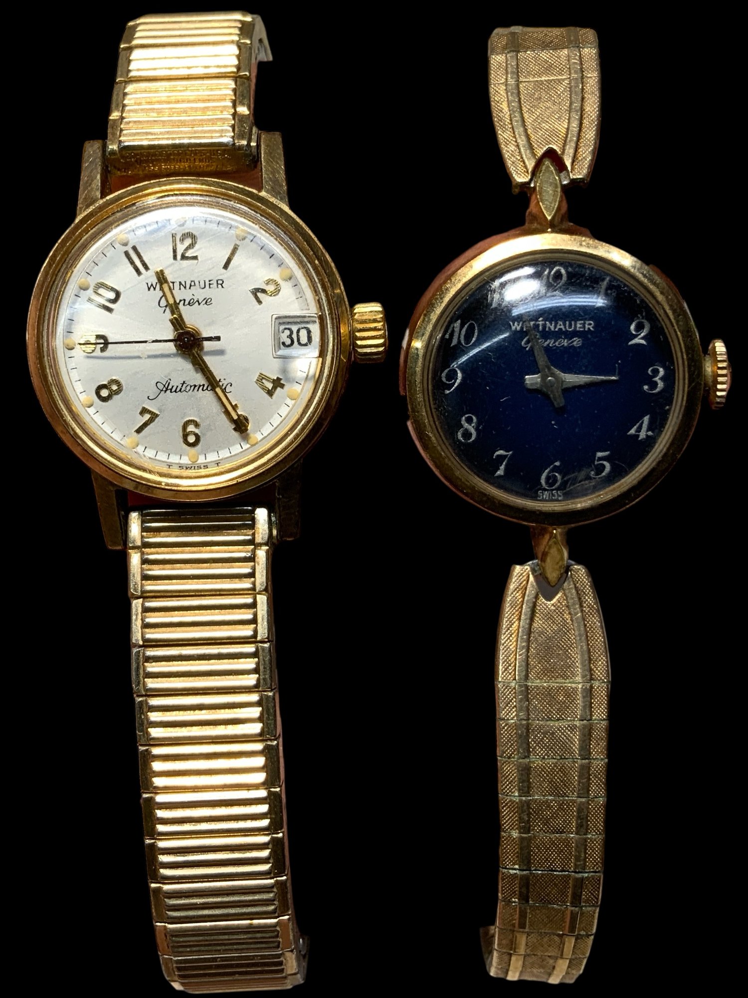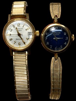 Two Wittnauer Ladys Wrist Watches One Running, the one with the white watch face is running, not timed for accuracy. The one with the navy blue watch face does not appear to be running.