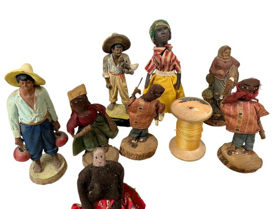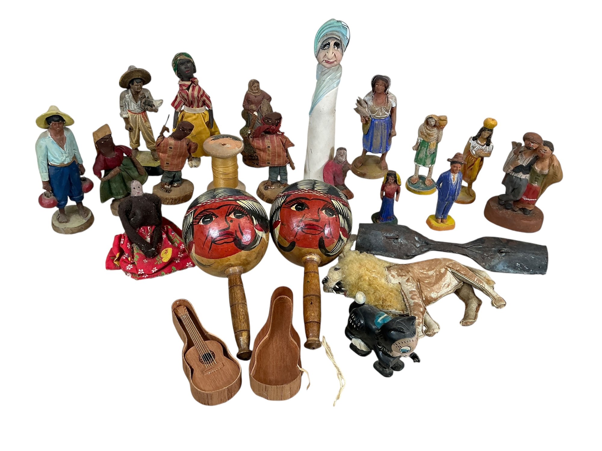 Various Folk Art Bits And Bobs Dolls Figurines Maracas Toys Etc. All in fair to good condition, please see photos. The largest is approx. 9” tall.