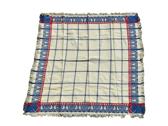 Vintage 1950s Jacquard Kitchen Cloth Table Cloth With Chicken And Tree Decorations. In good condition, please see photos. It is approx. 48” square.