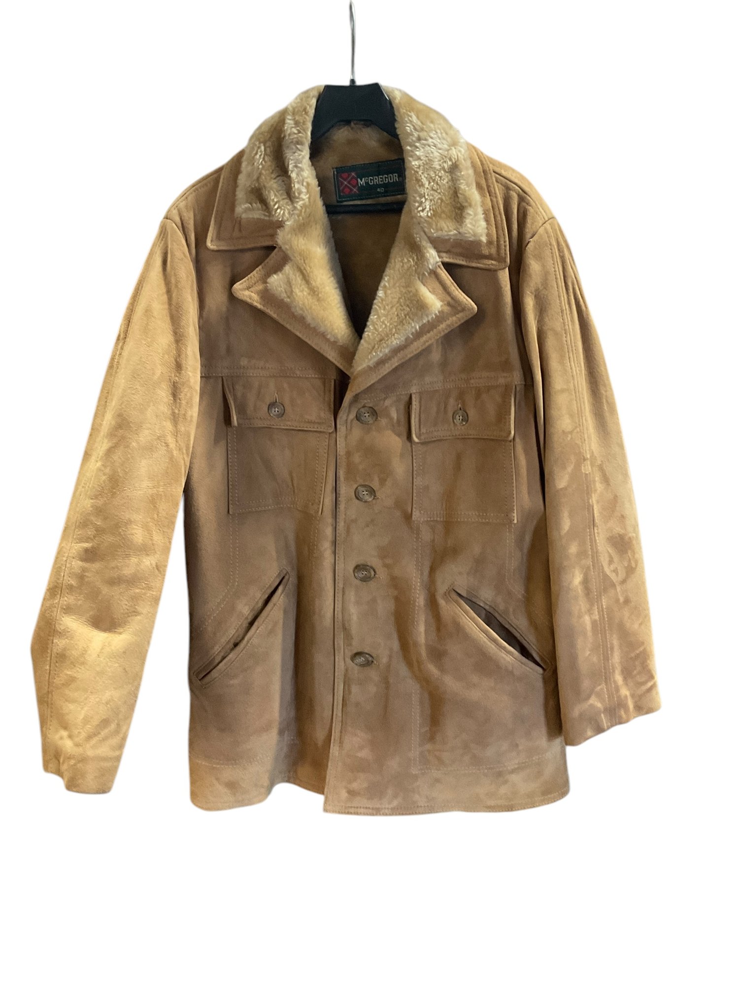Vintage 1970s Mens Tan Suede Leather Faux Fur Lined Jacket By McGregor Size 40. In fair used condition with one torn hole, please see photos. Lying flat armpit to armpit it is approx. 20” and collar to hem it is approx. 36”