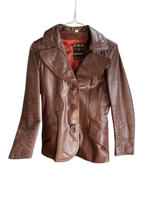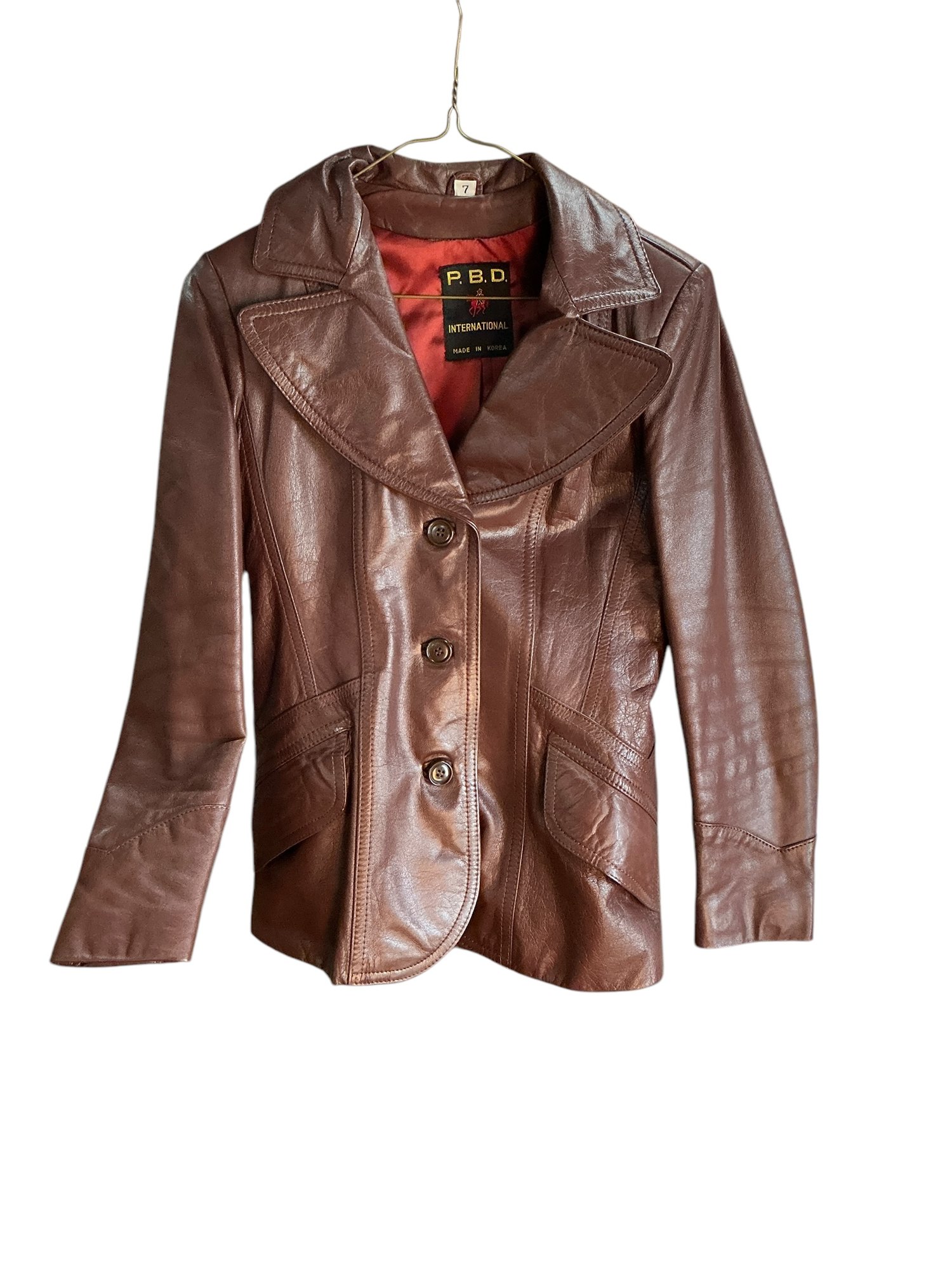 Vintage 1970s Womens Leather Jacket Size 7 PBD International Korea. In good used condition. Lying flat armpit to armpit it is 15” and collar to hem it is 26”.