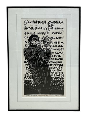 Vintage 1983 Peter Bodge Linocut Of Dizzy Gillespie Jazz Music. In very good condition. Sight size is approx. 16.5” by 9.5” and frame size is approx. 22” by 15.”