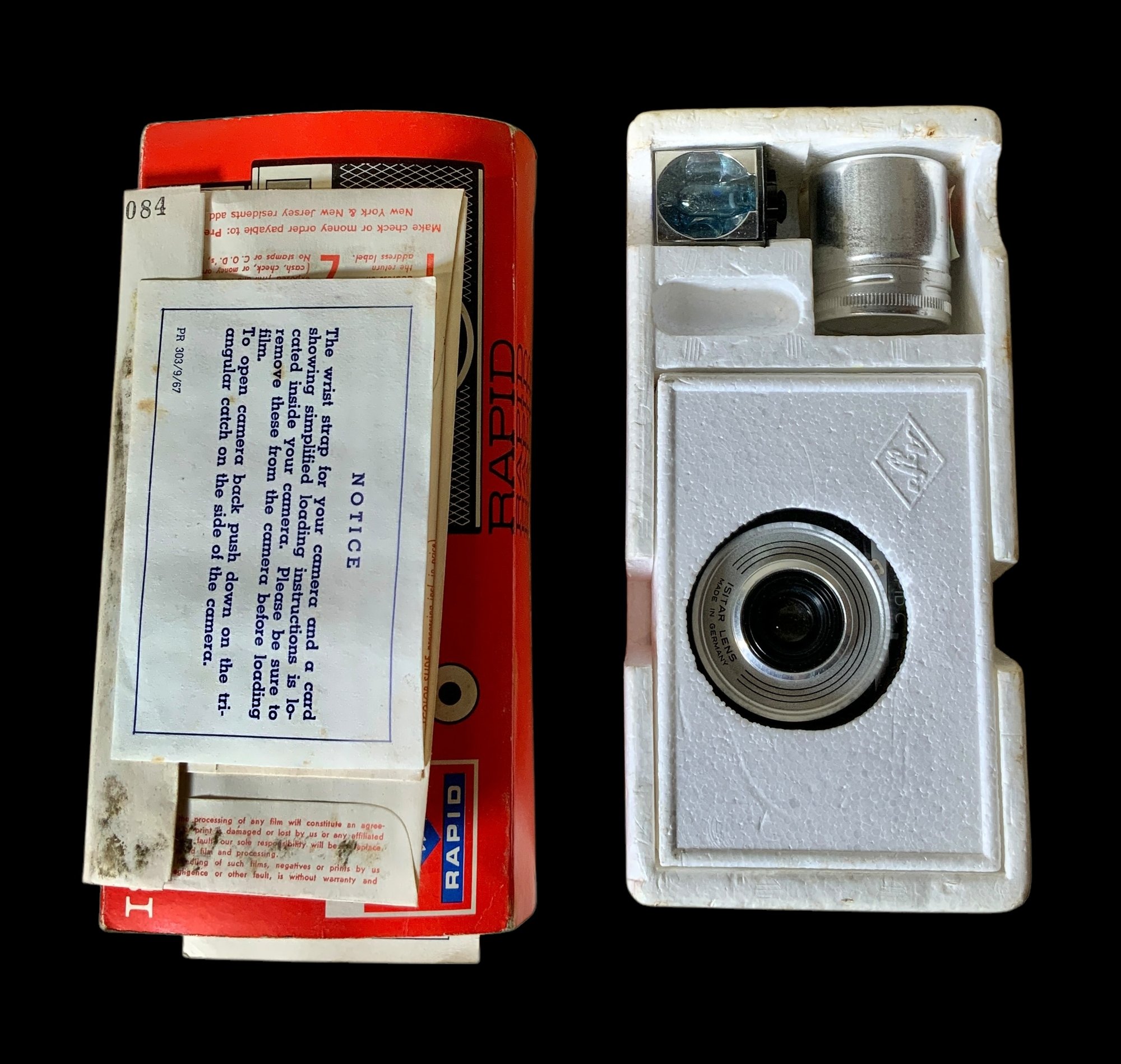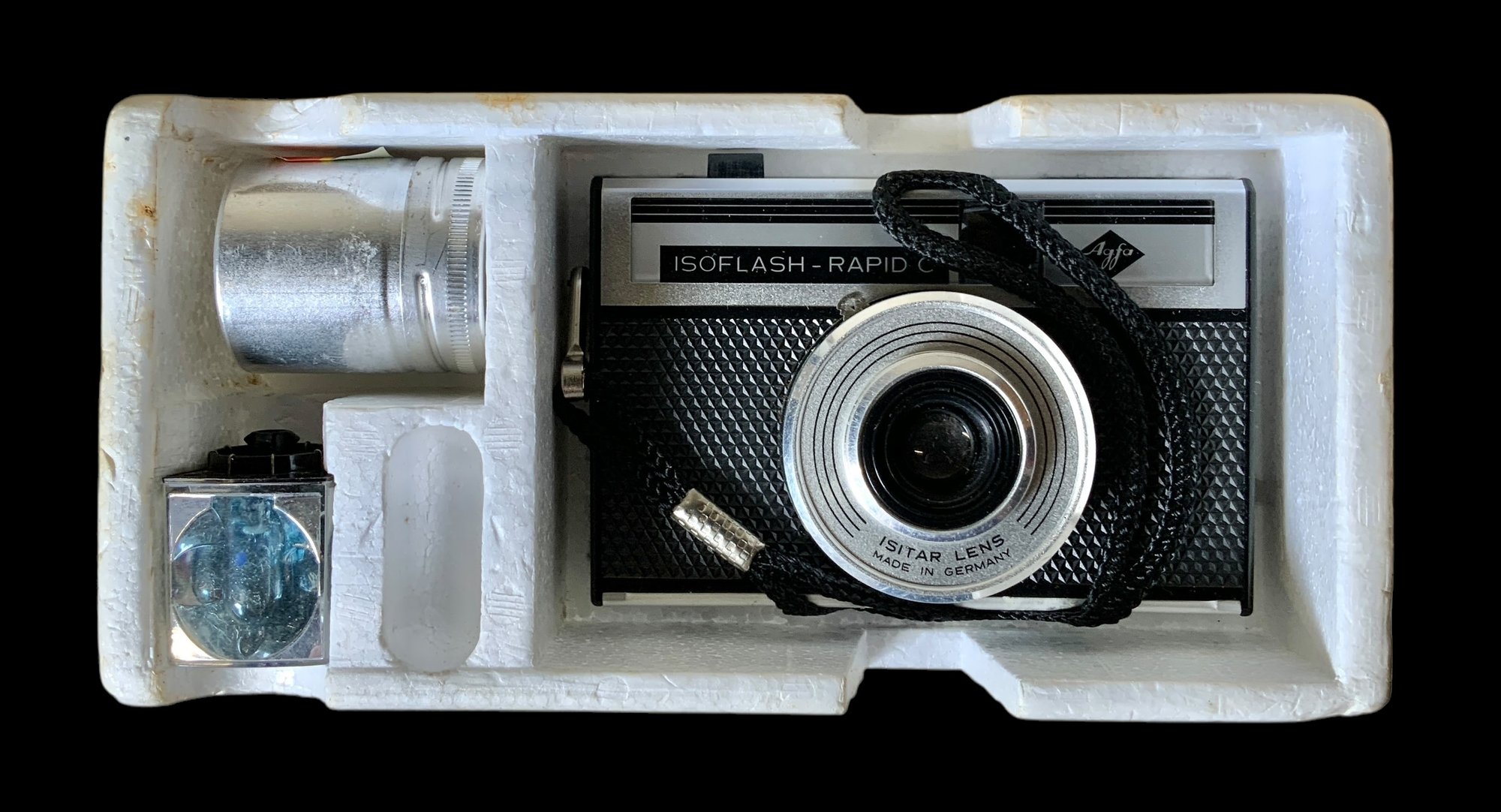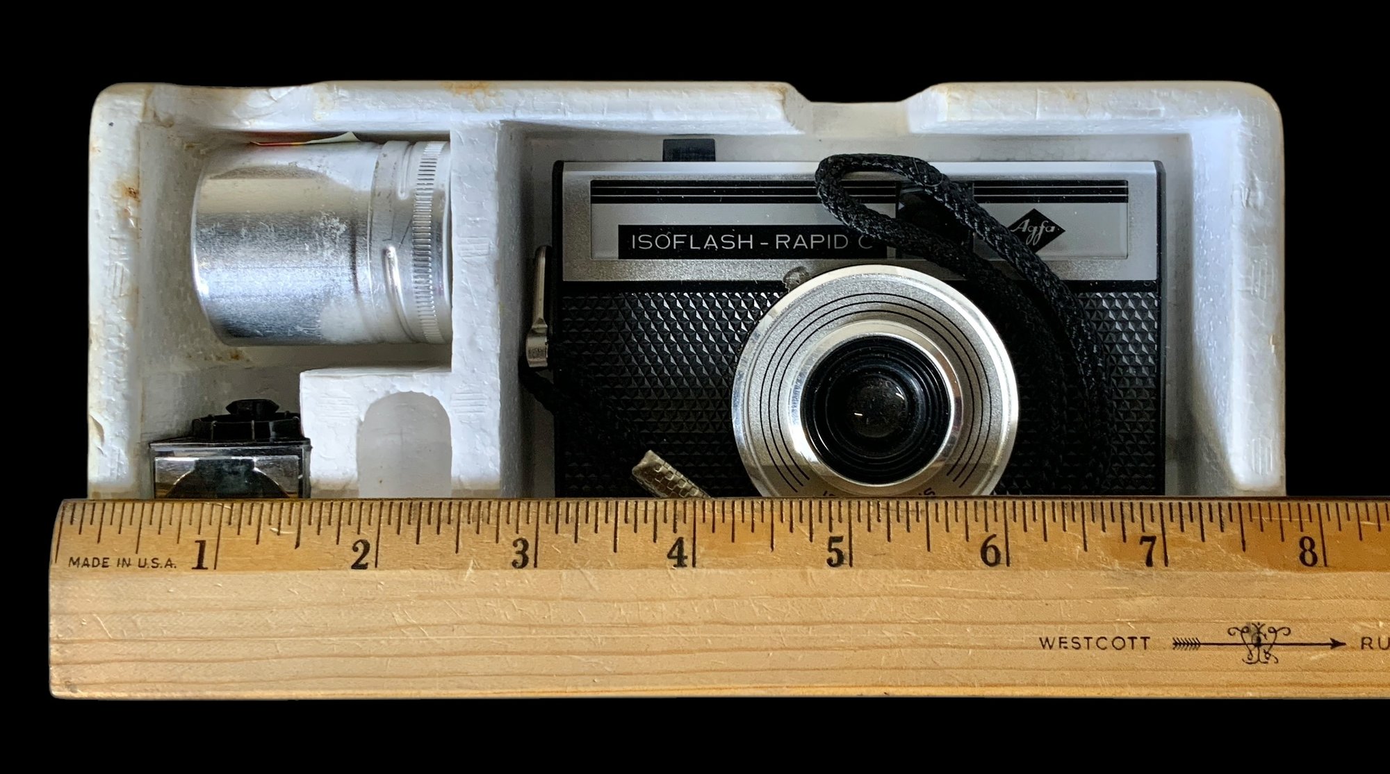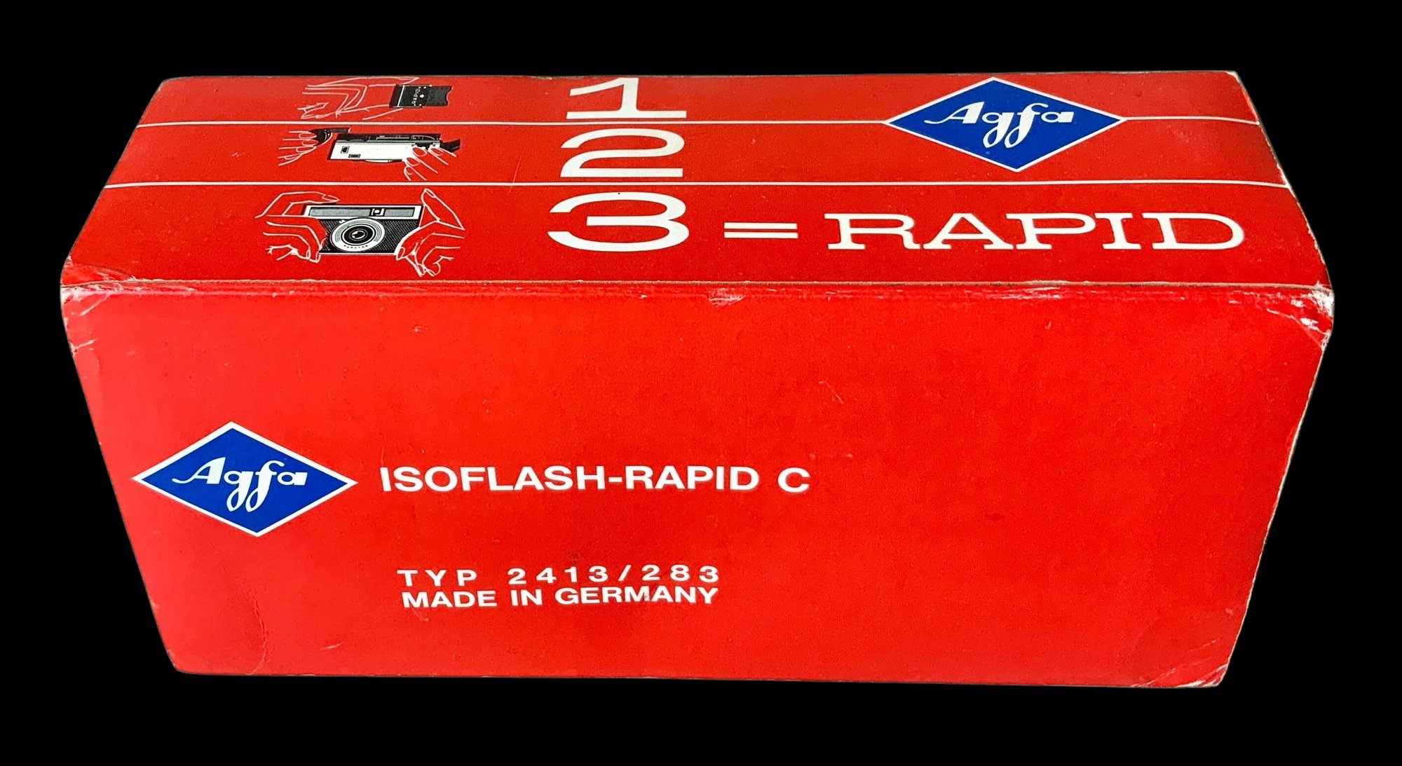 Vintage Agfa Isoflash Rapid C Rangefinder Camera In Original Box. Camera is still in original packaging. Box measures approximately 7.75” long. Please see photos for more details. Untested.