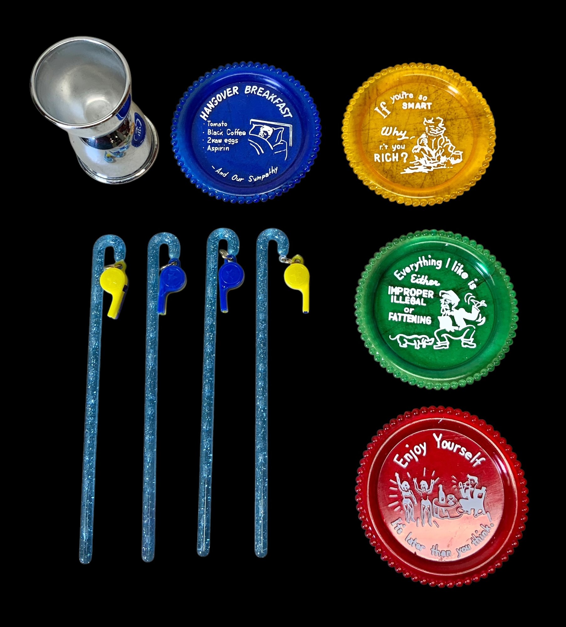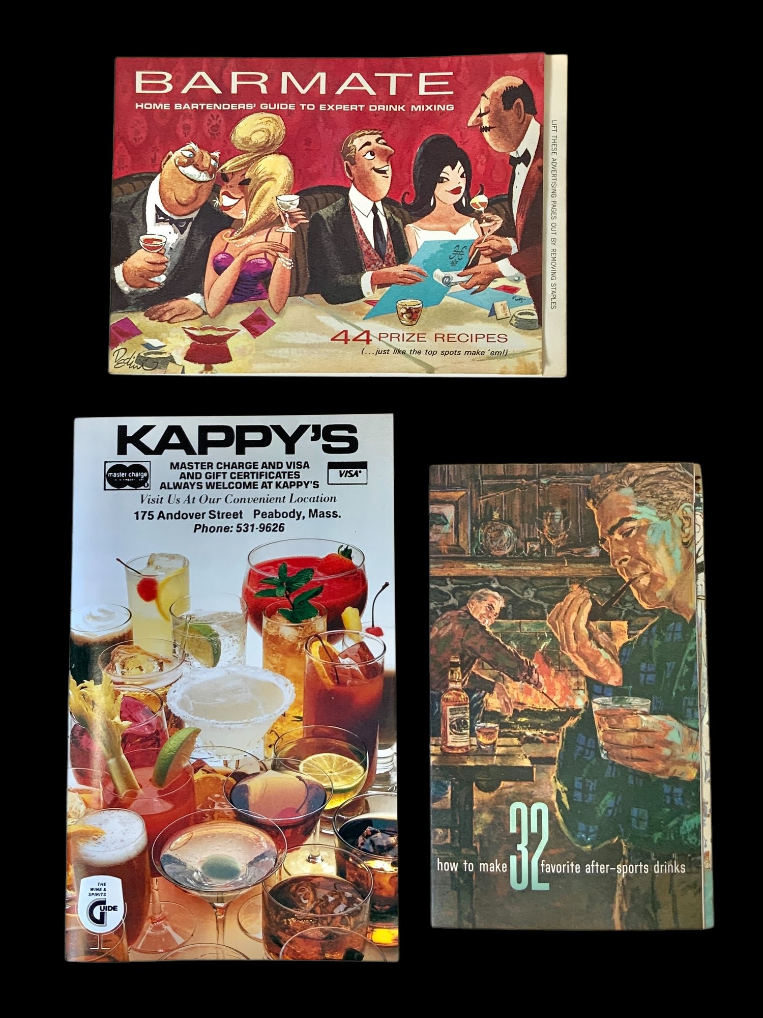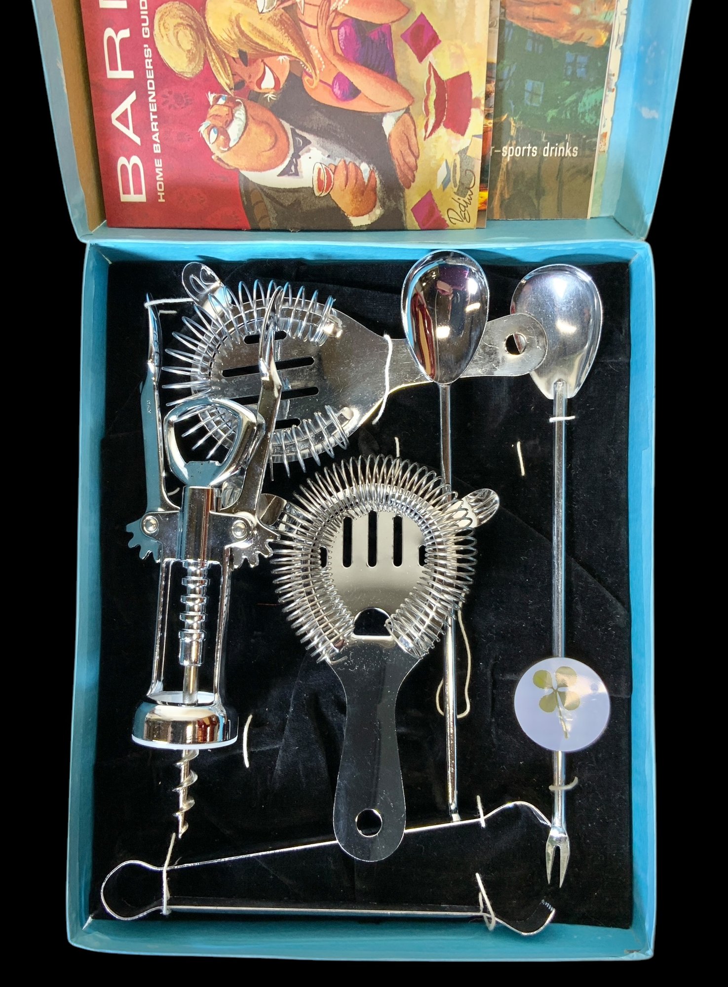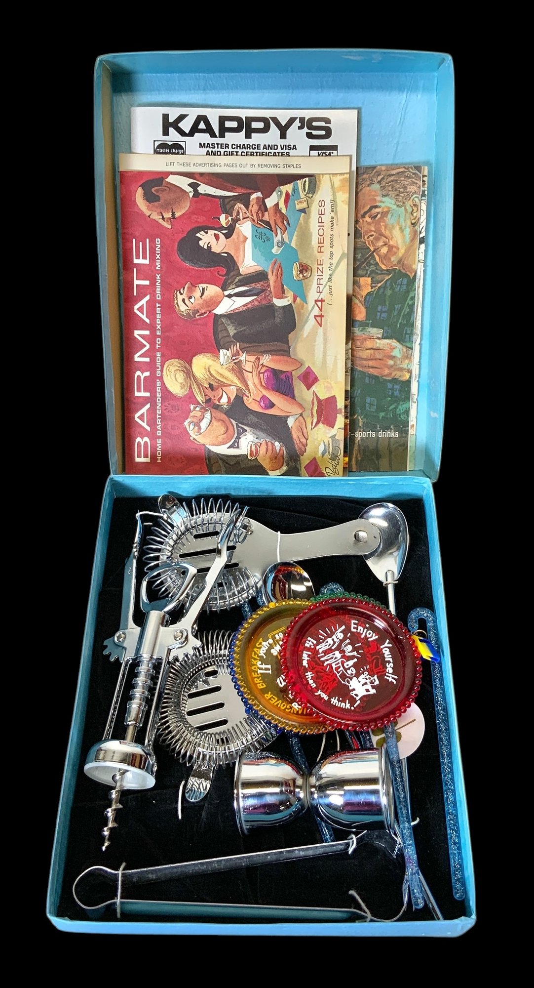 Vintage Barware Set In Box With Bartending Guides. Includes two bartending guides from the 1960s and a 1982/1983 Kappy’s guide. Please see photos for more details. Set comes in a blue box which measures approximately 7.75” wide by 9.5” long.