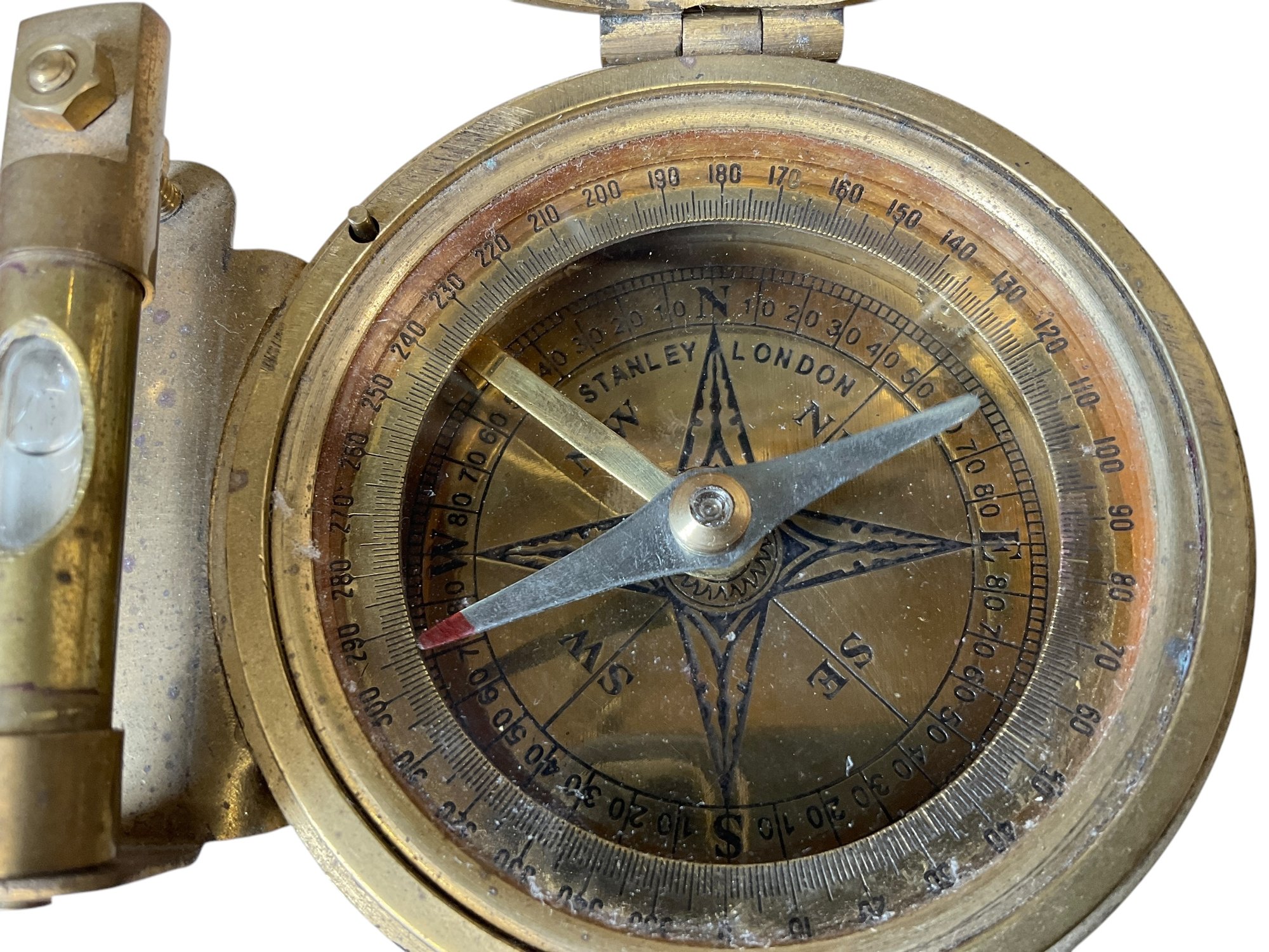 Vintage Brass Nautical Natural Sine Compass Made By Stanley London. In good used condition. It is approx. 3” in diameter.