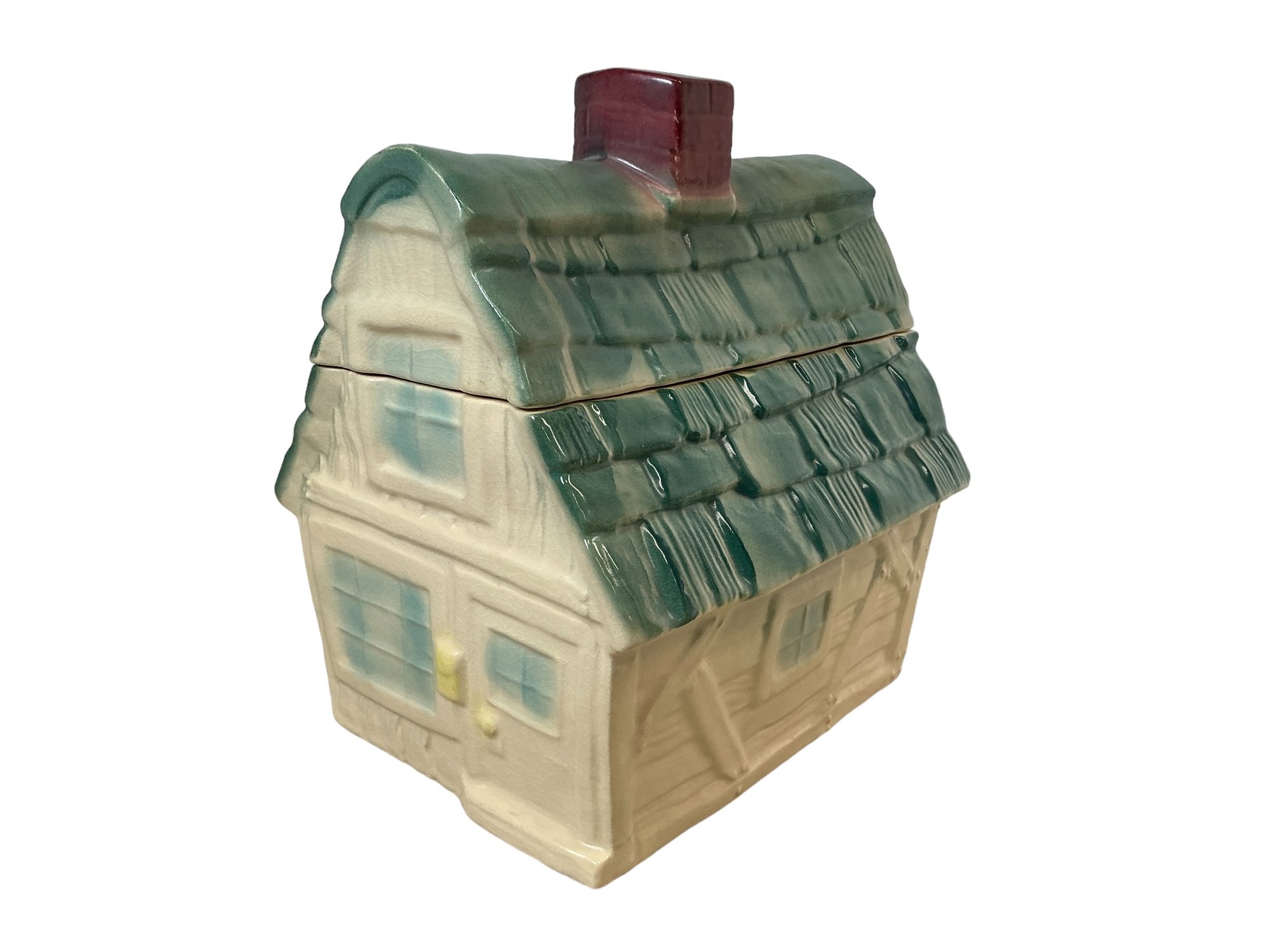 Vintage Brush McCoy Cookie Jar In The Shape Of A Cottage. In very good condition. It is approx. 10.5” by 9” by 7.5”.
