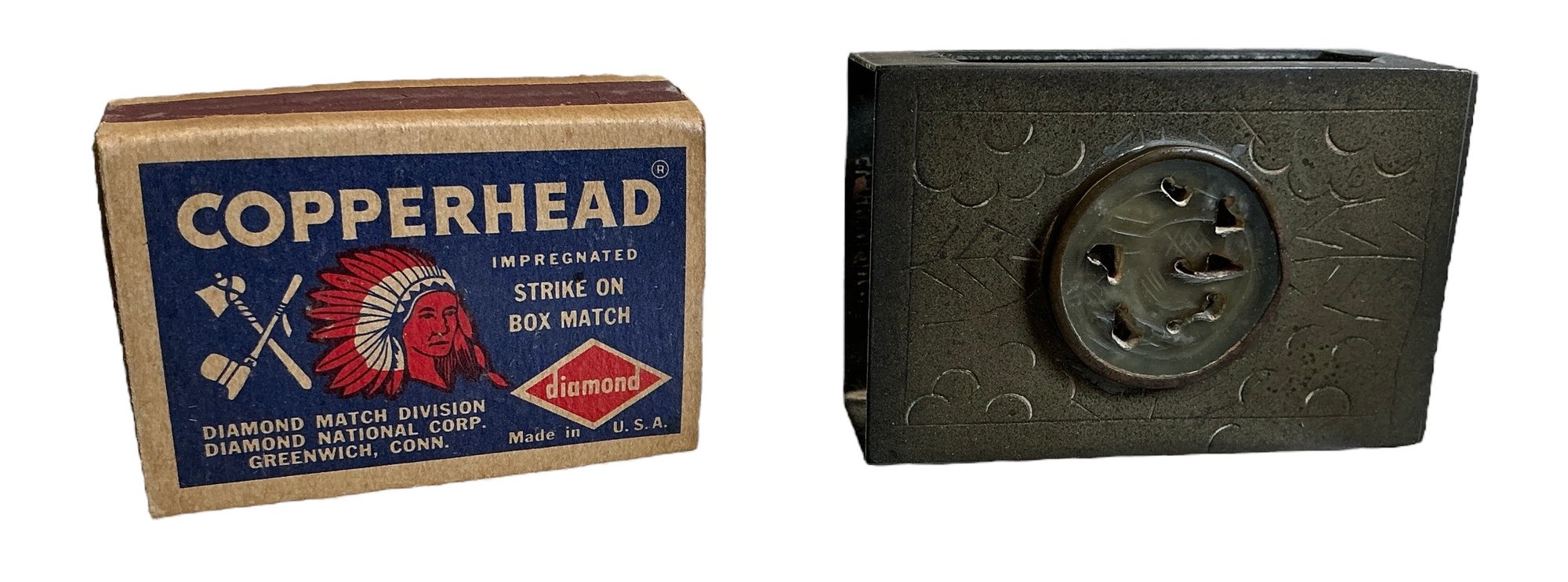 Vintage Chinese Brass And Soapstone Matchbox Holder With Copperhead Matchbox. In good condition. The matchbox is empty. It is approx. 2.25” long.