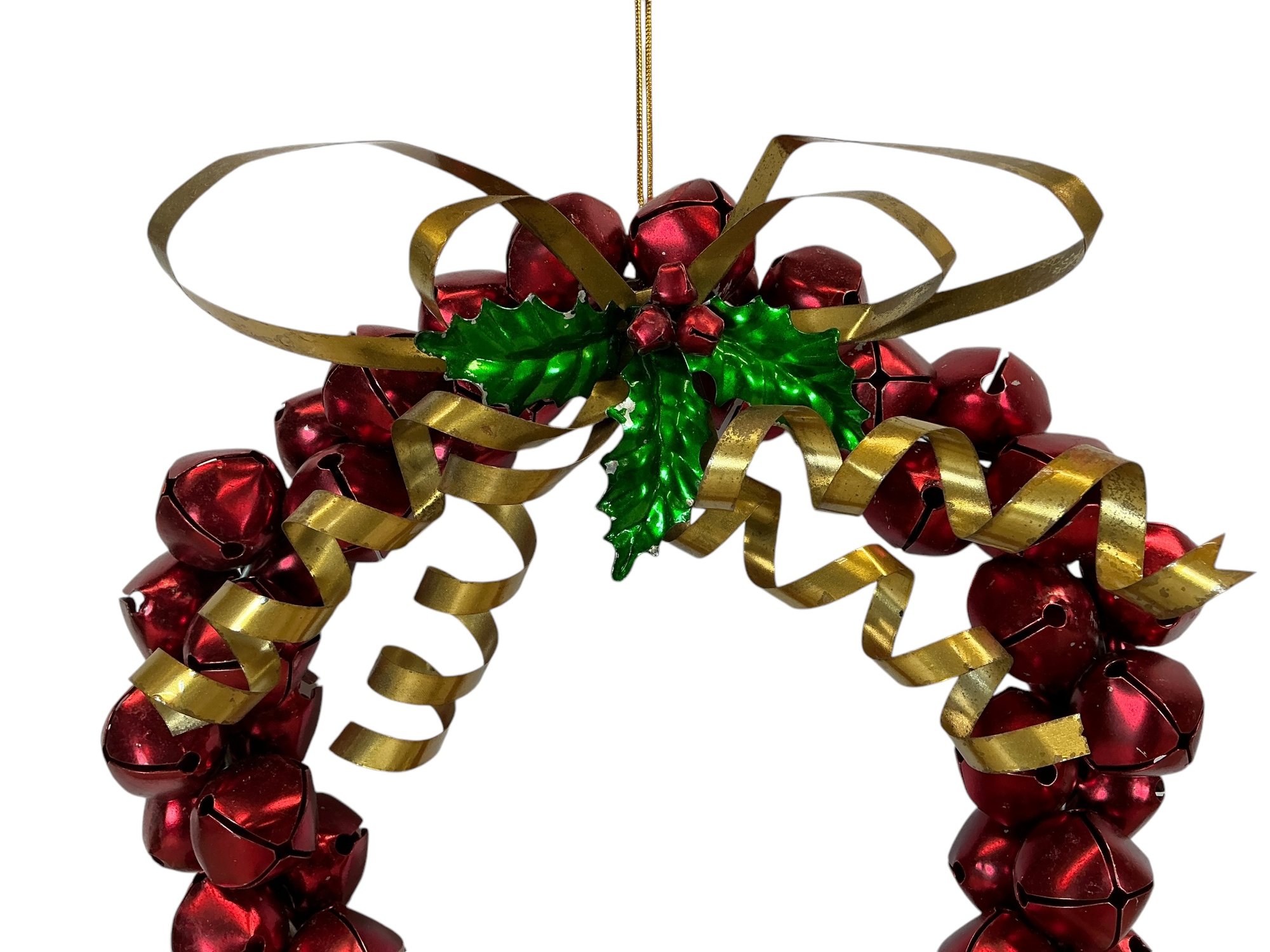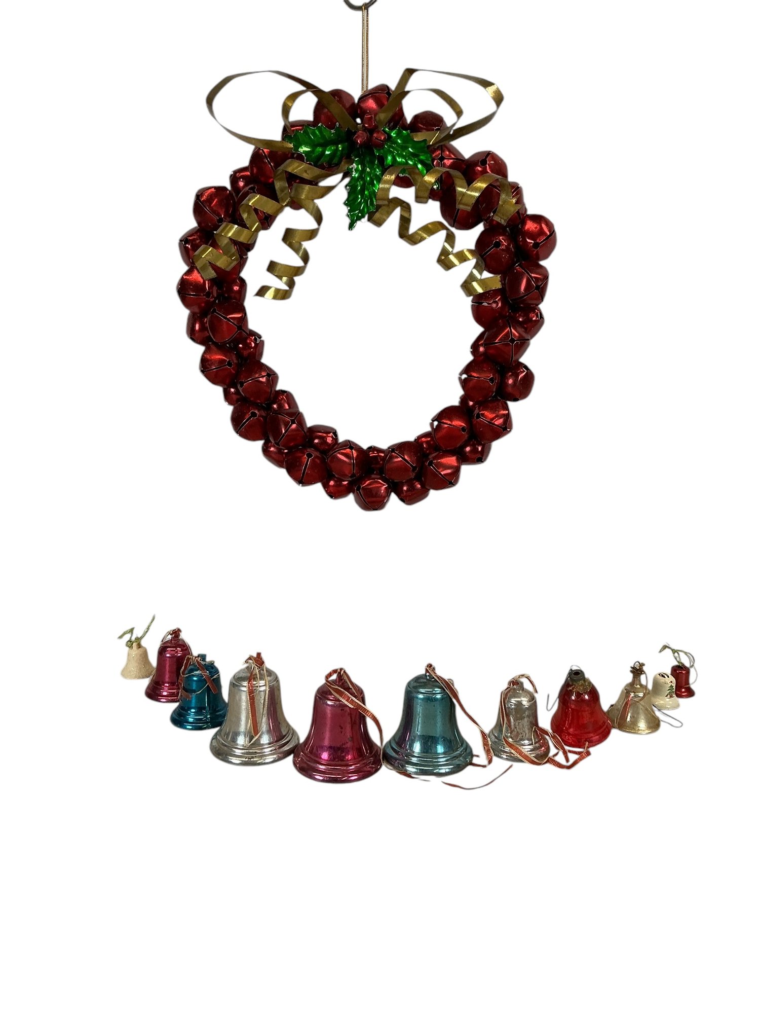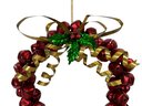 Vintage Christmas Metal Bell Wreath And Bell Ornaments. In good used condition with some minor wear. The wreath is approx. 12.5” in diameter.