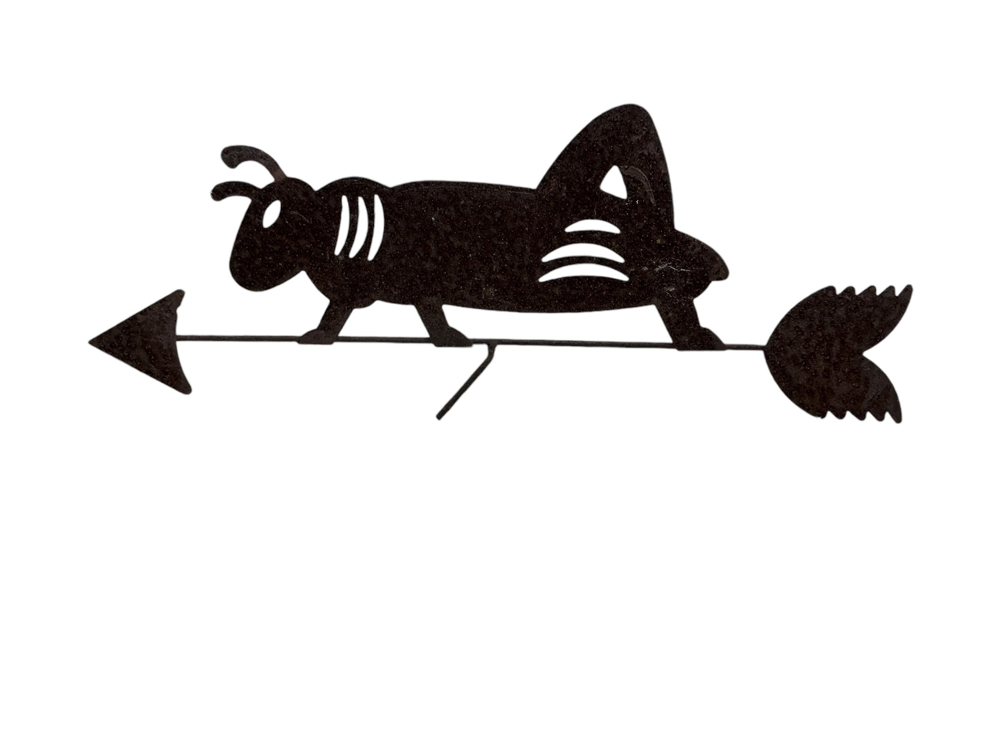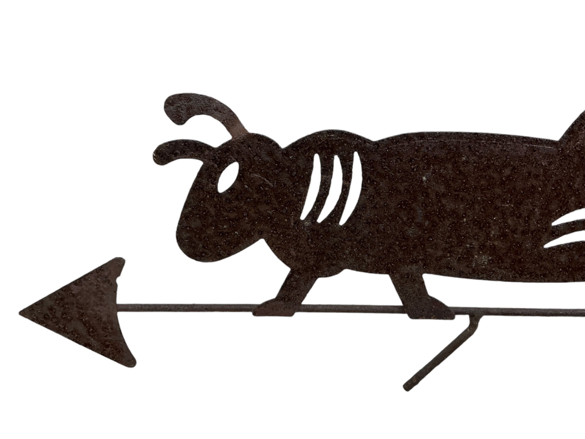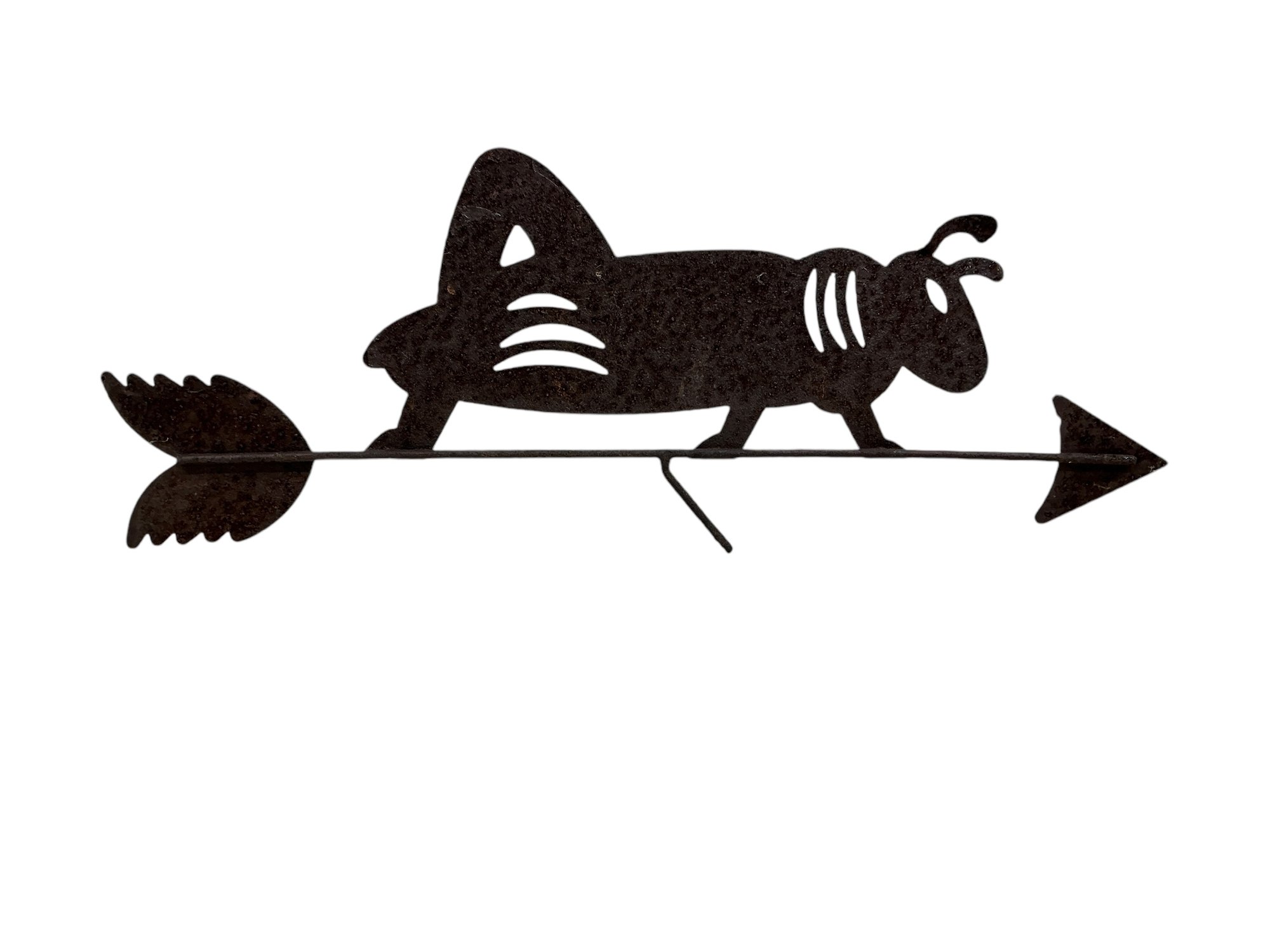 Vintage Folk Art Cut Steel Small Cricket Weathervane. See photos, has all-over surface corrosion, which definitely adds to its charm. It is approx. 13” by 5."