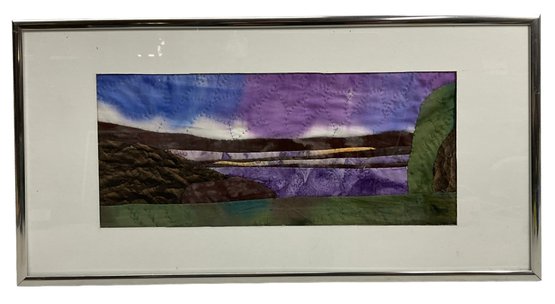 Vintage Framed Landscape Textile Quilt Art Landscape By June Durocher 2002 Topsfield Fair 3rd Prize. In good condition. Sight size is approx. 6” by 14”.