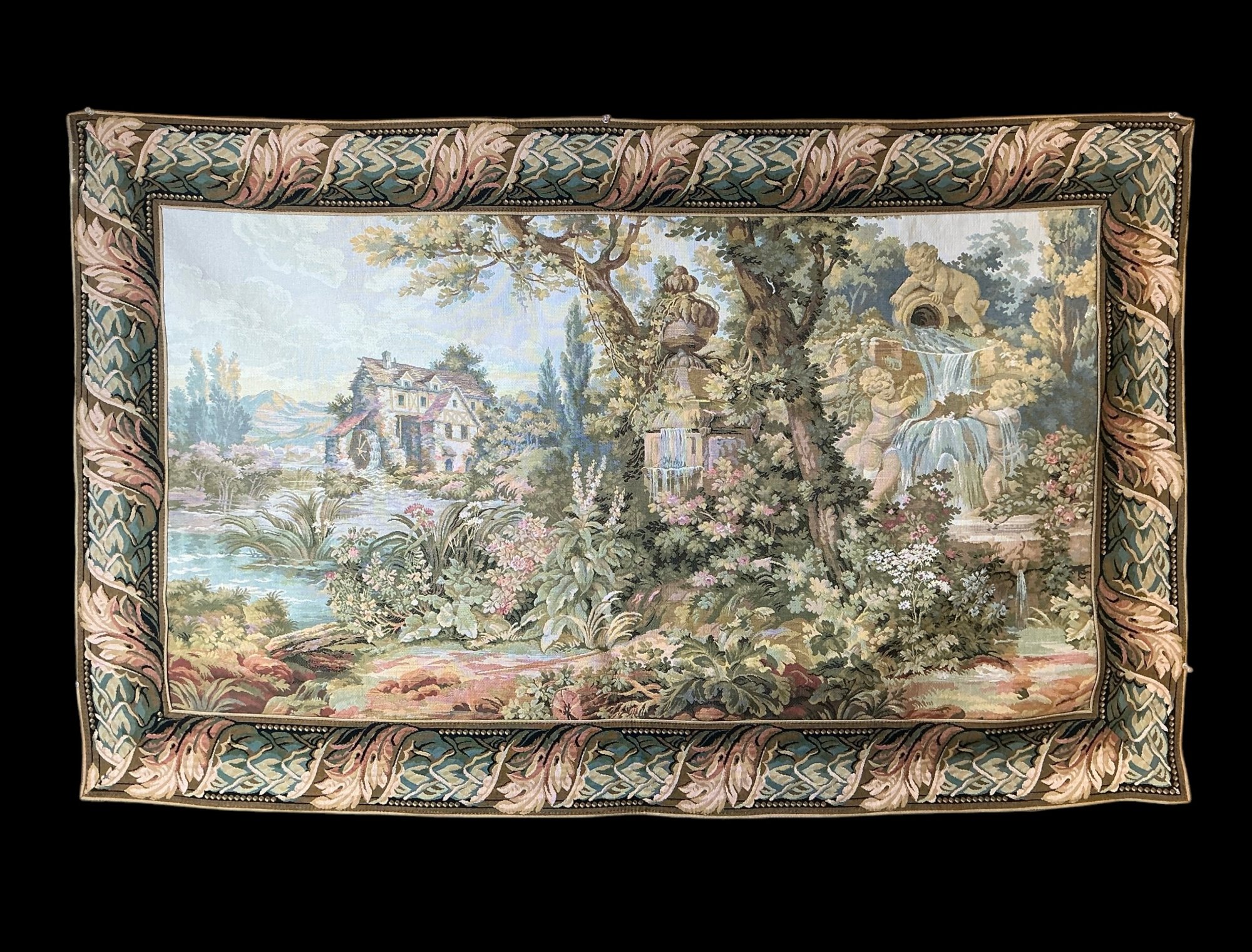 Vintage French Landscape Tapestry After Francois Boucher. In good used condition, it has some washers affixed with adhesive to the bottom edge to make it hang flat, please see photos. It is approx. 35” by 57.”