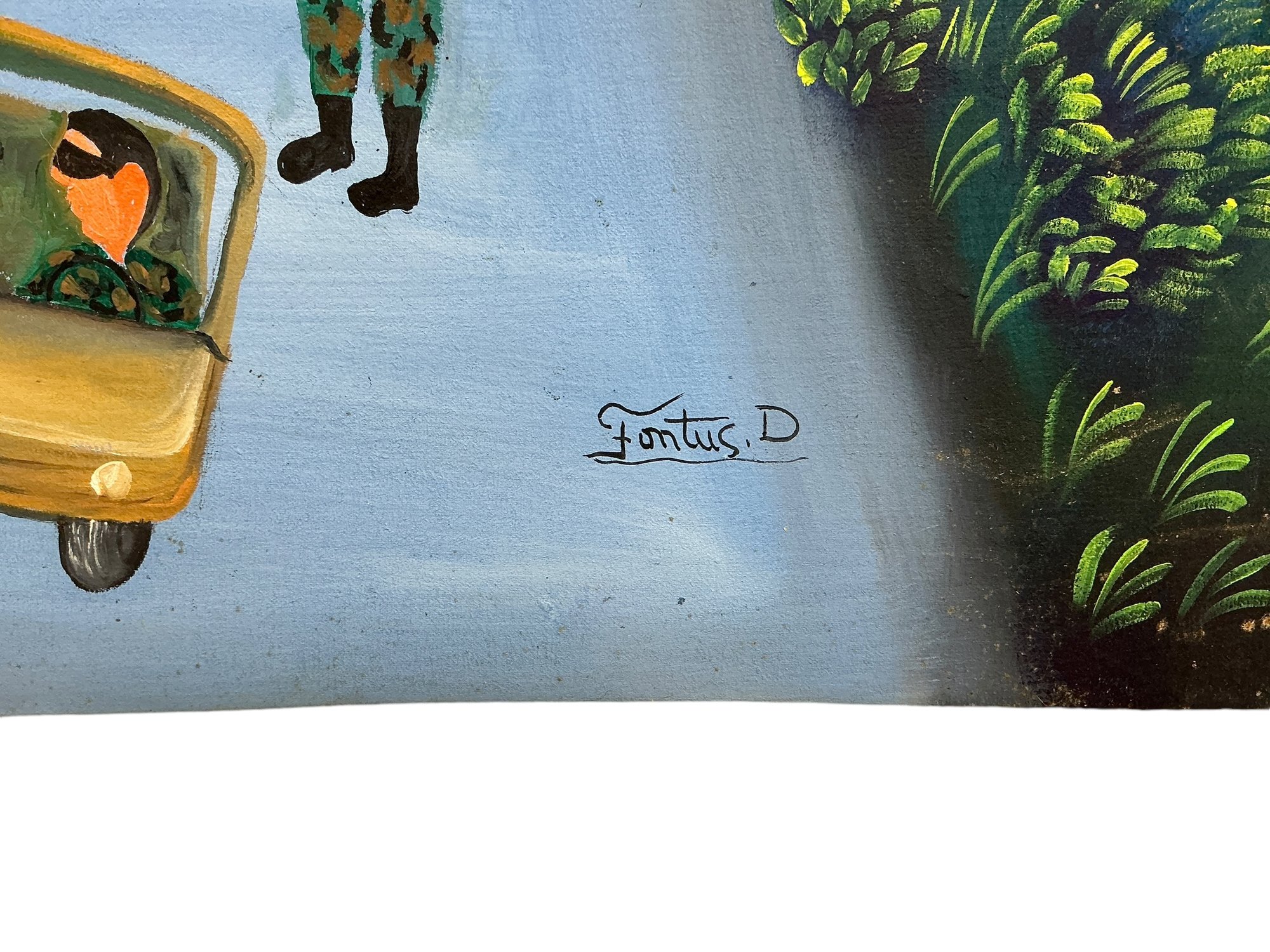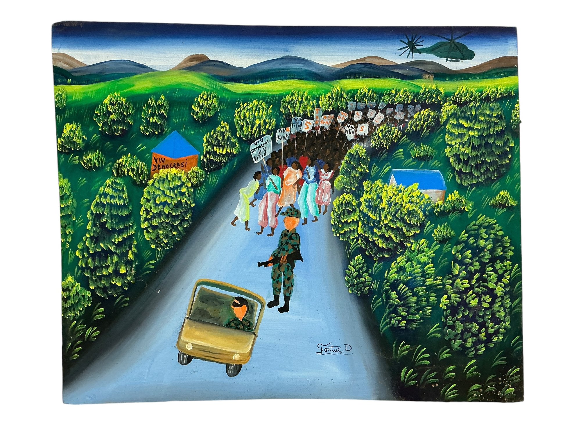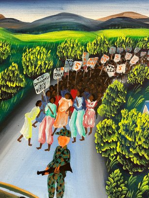 Vintage Haitian Oil On Fabric Of Protest March Signed Fontus D. In good condition. It is approx. 14.5” by 20.”