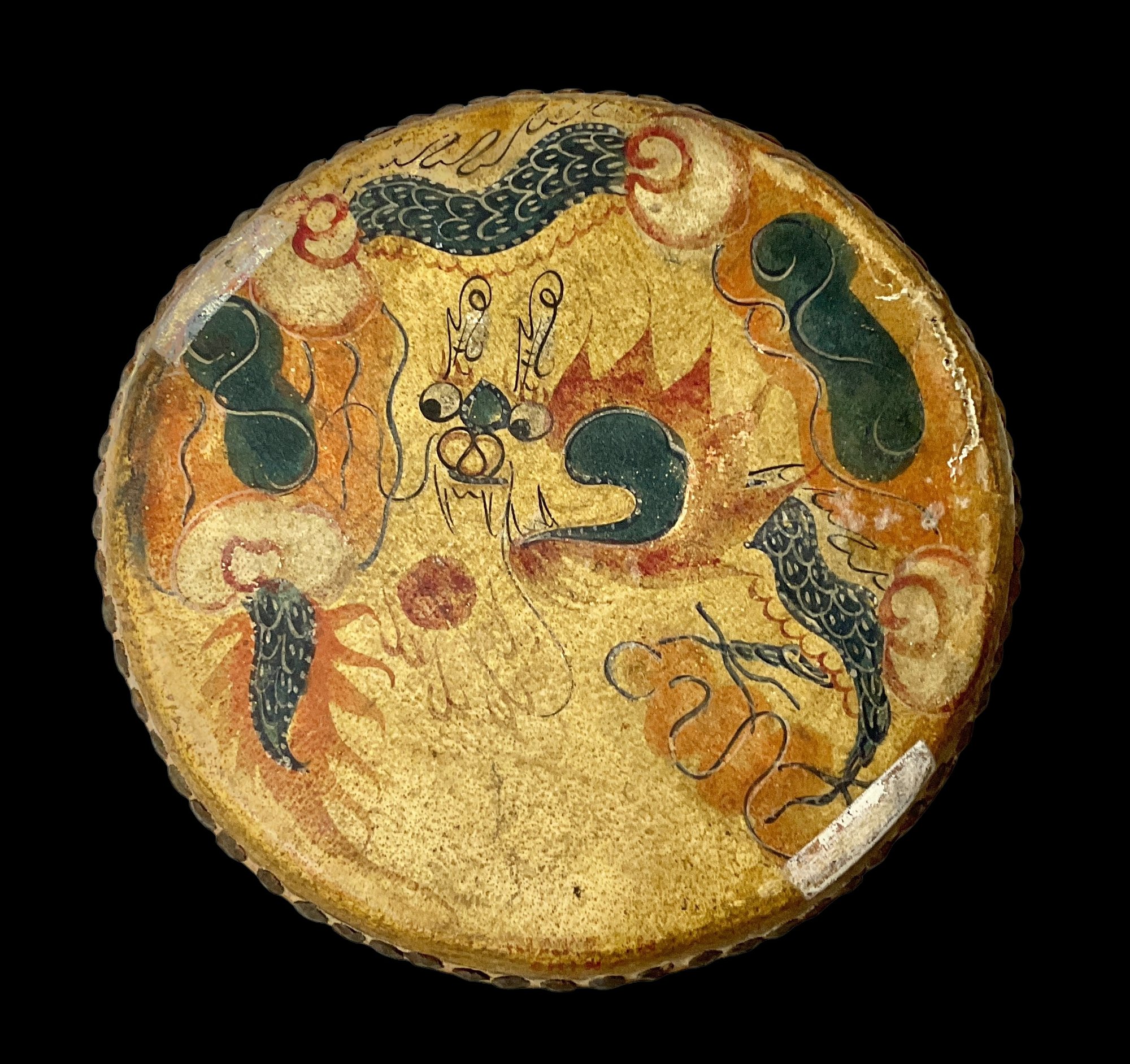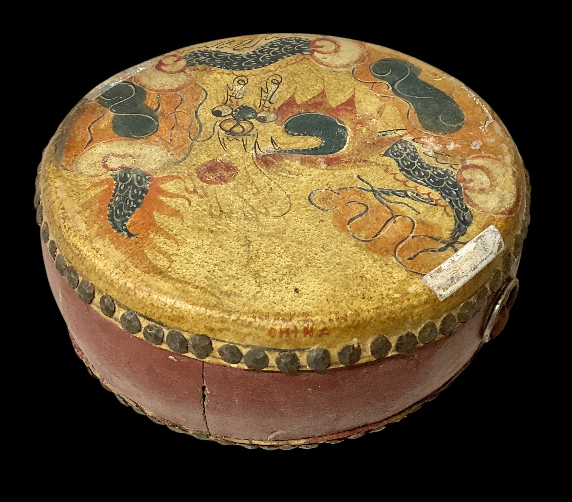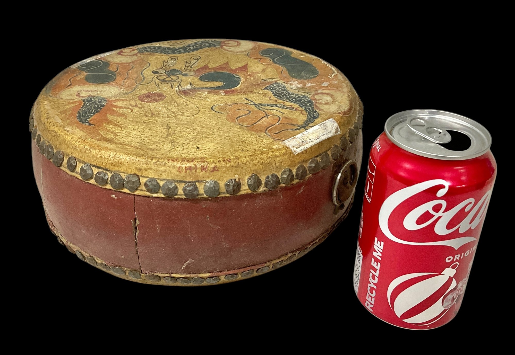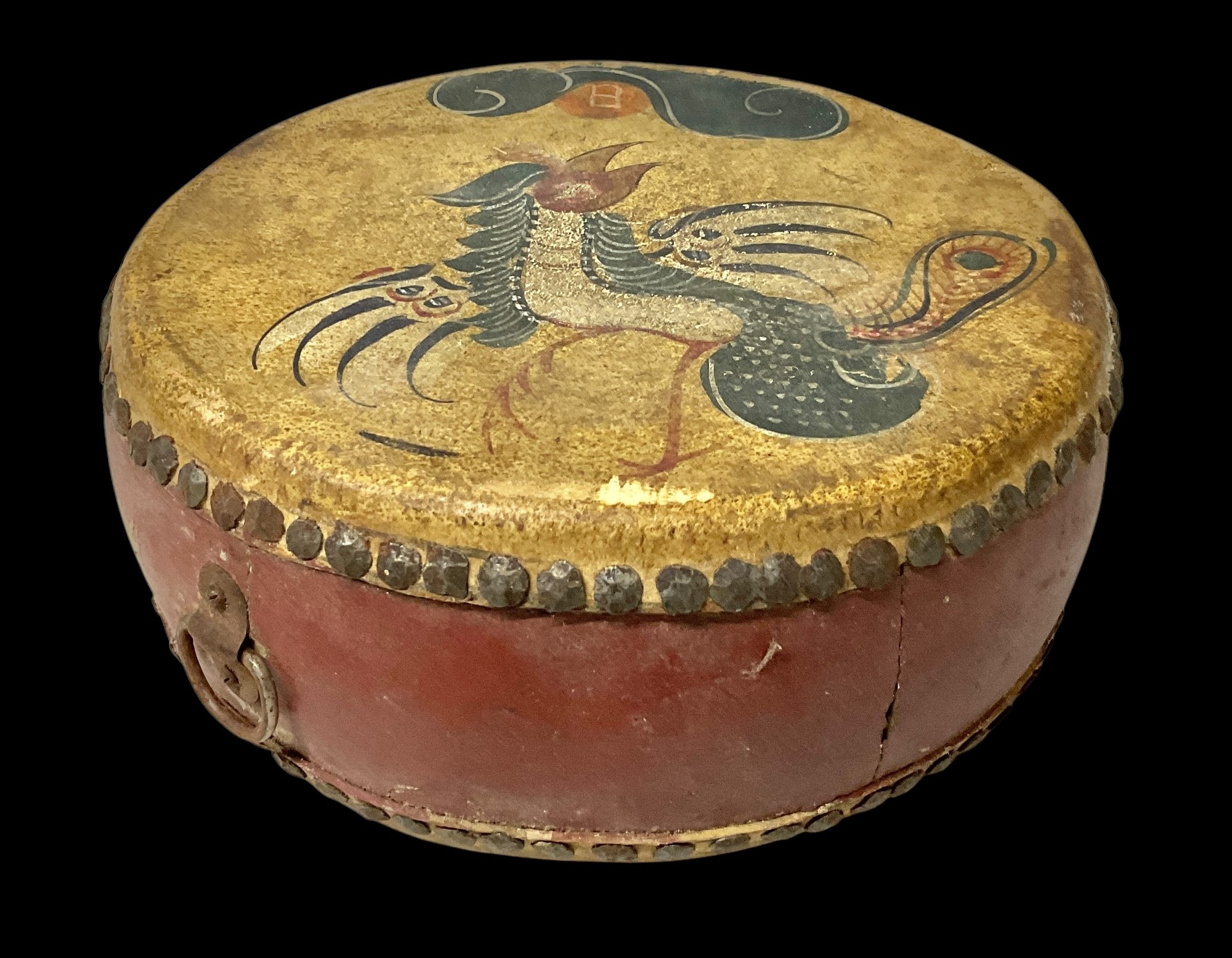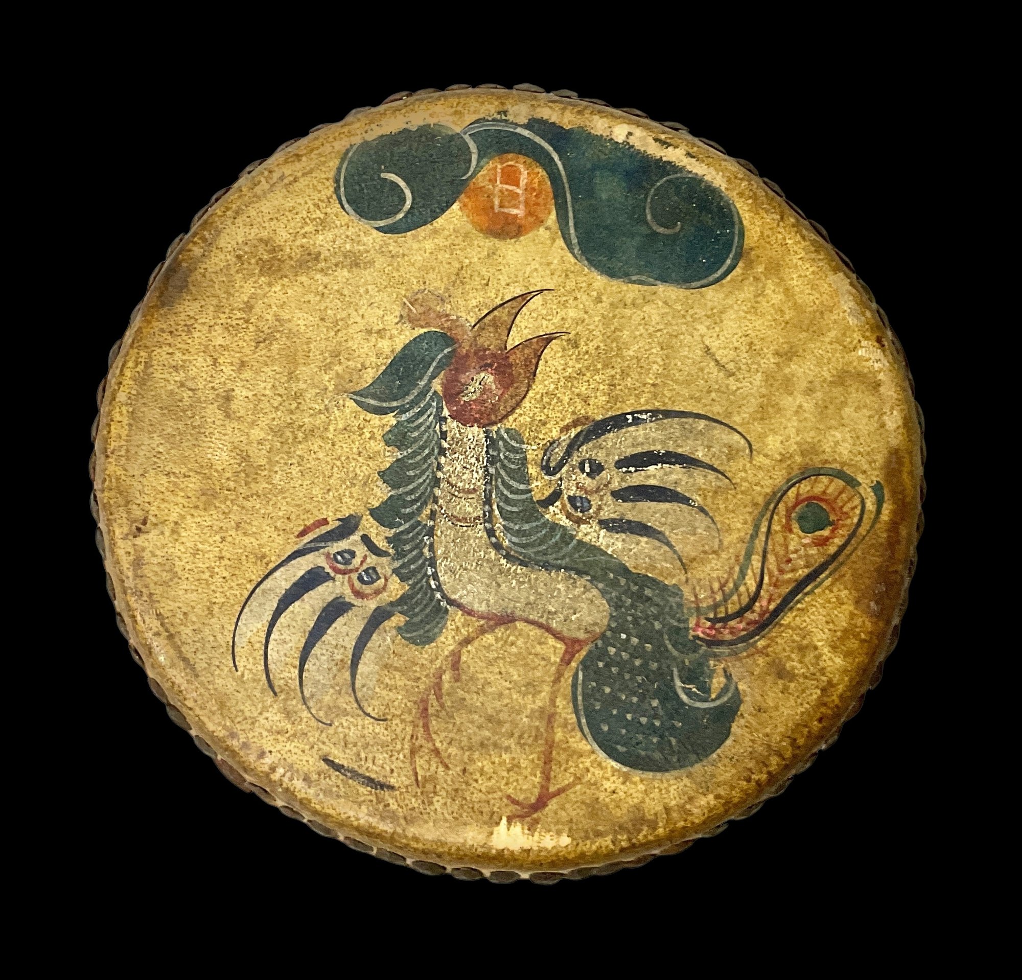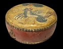 Vintage Hand-Painted Wood And Leather Chinese Drum. One side features a phoenix and the other side features a dragon. No holes on the leather. Please see photos for condition. Drum measures approximately 4” tall with a diameter about 9” wide.