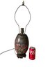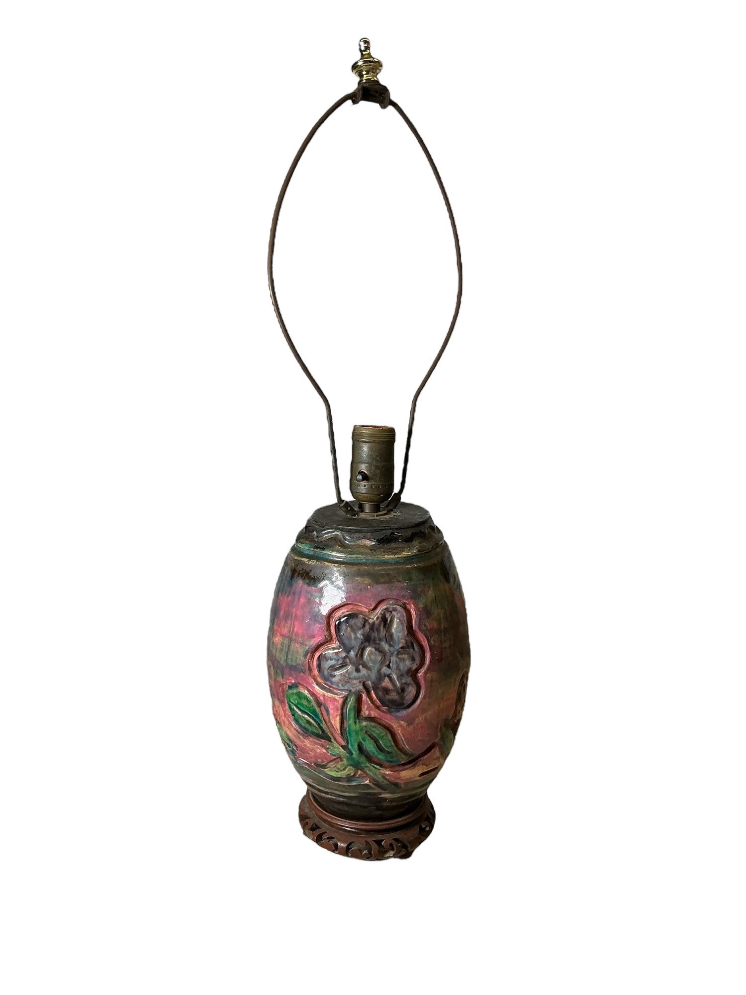 Vintage Krames Of Rockport Porcelain Glazed Floral Lamp. In good used condition but the wooden base has some loss and the porcelain has been drilled through the bottom please see photos. The lamp is untested. It is approx. 22.5” tall to the top of the finial.