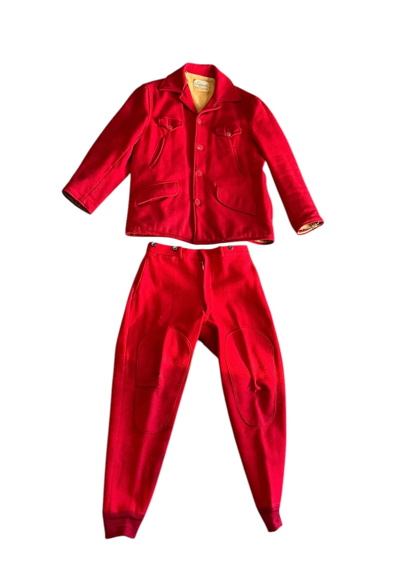 Vintage Hunting Red Wool Chippewa Coat And Woolrich Trousers. Both in fair used condition with the coat having a split at the right shoulder seam and both pieces have light wear and stains and some fraying to the lining, please see photos. The coat lying flat is approx. 22.5” and collar to hem it is approx. 32”. The pants lying flat are 16.5” across and the leg from the ewaist band to the bottom hem is approx. 40”.