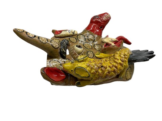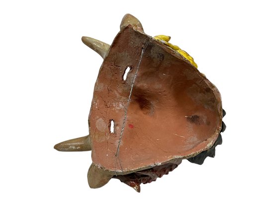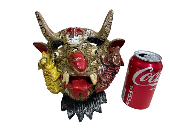Vintage Mexican Folk Art Glazed Terra Cotta Diablo Mask With Skull And Snake Decoration. In good condition. It is approx. 9” tall.