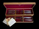 Vintage Mid Century Modern Gerber Legendary Blades Carving Meat Set Eight Pieces In Walnut Box Snickersnee. In good condition, it looks like it was never used. The box itself is approx. 18” by 5” by 3.25.”