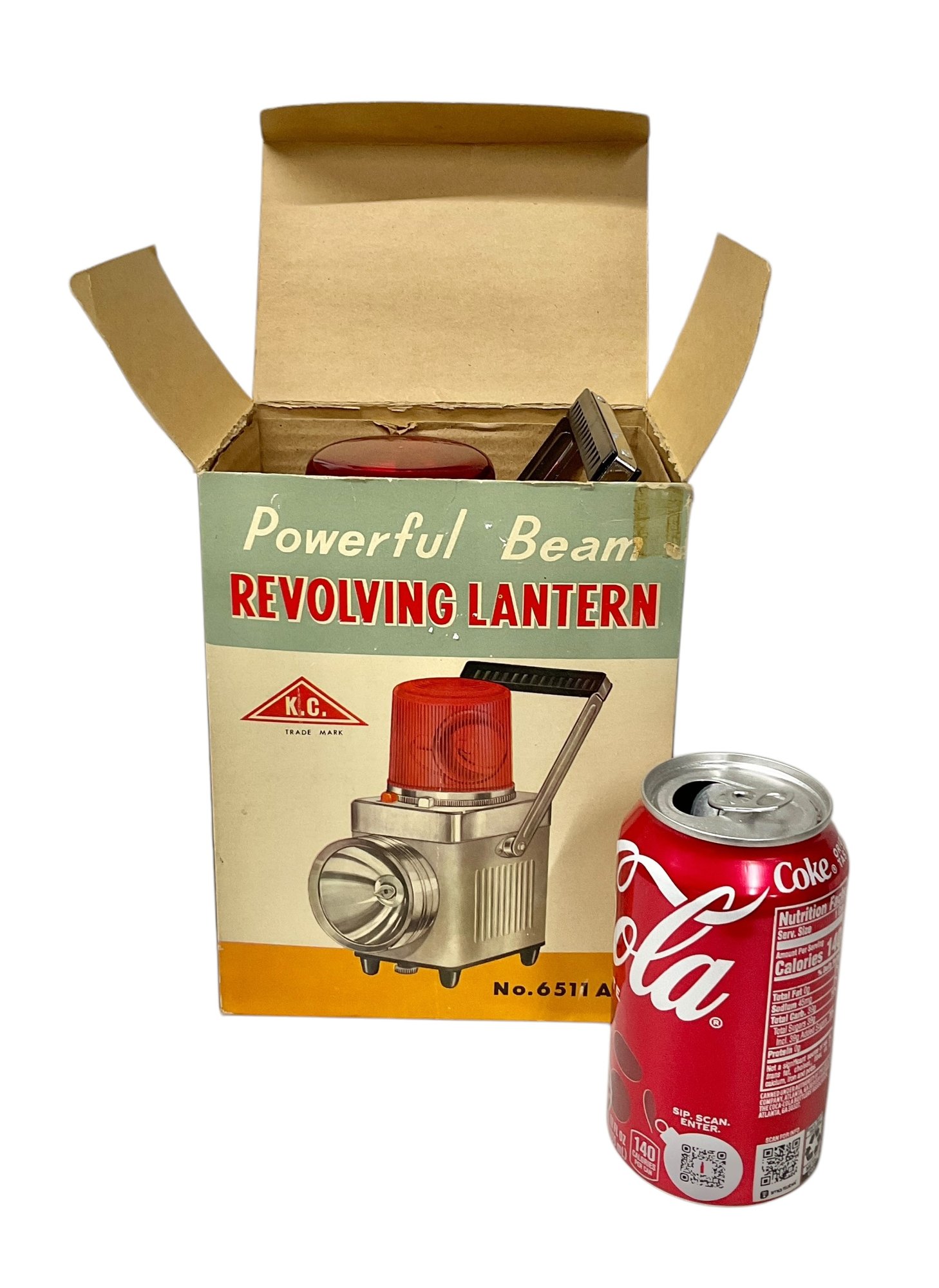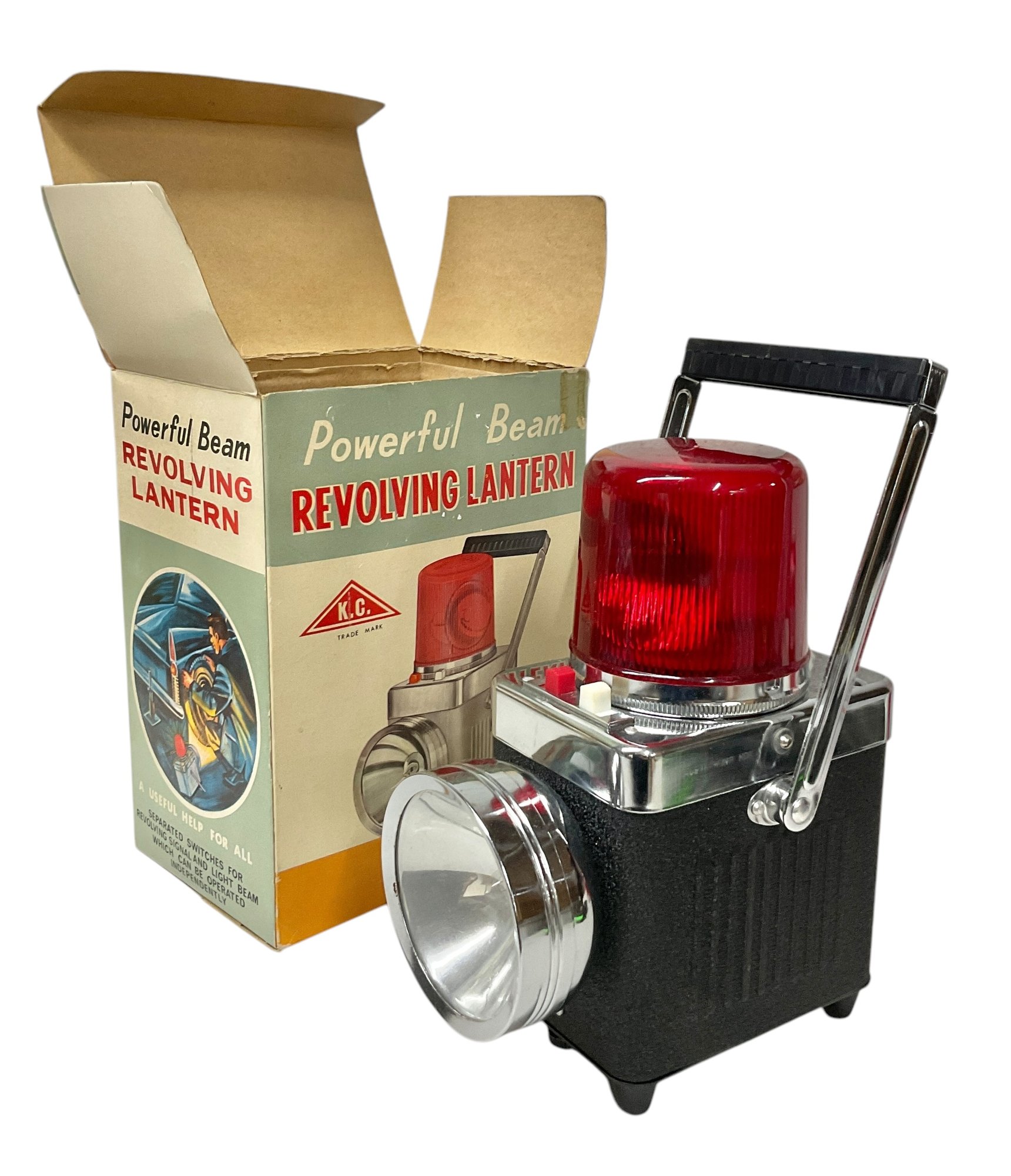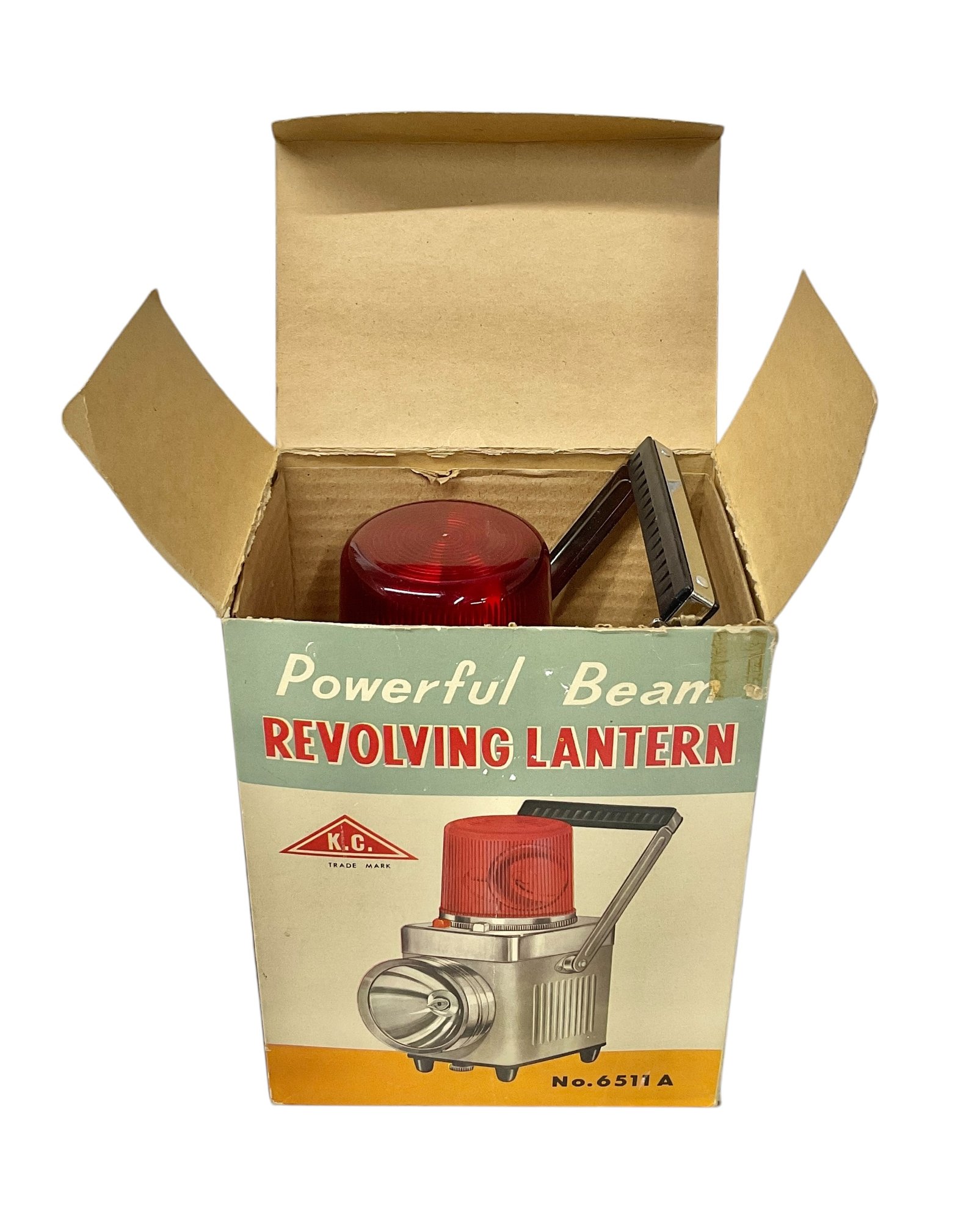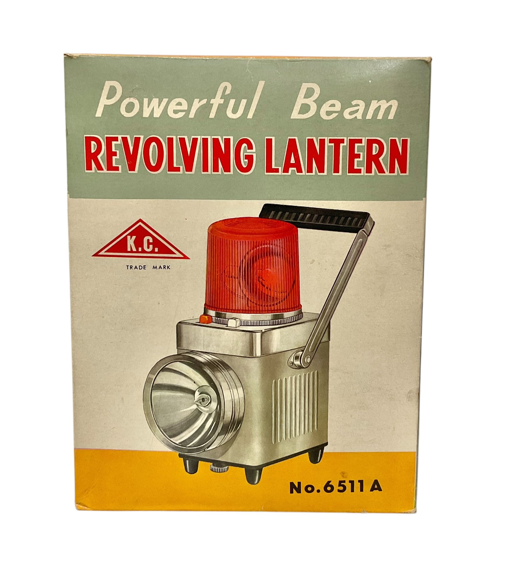 Vintage Midcentury Powerful Beam Revolving Lantern In Original Box. Lantern is in great physical condition, but untested. Trademark K.C. No. 6511 A. Lantern measures approximately 9” tall when handle is completely vertical.