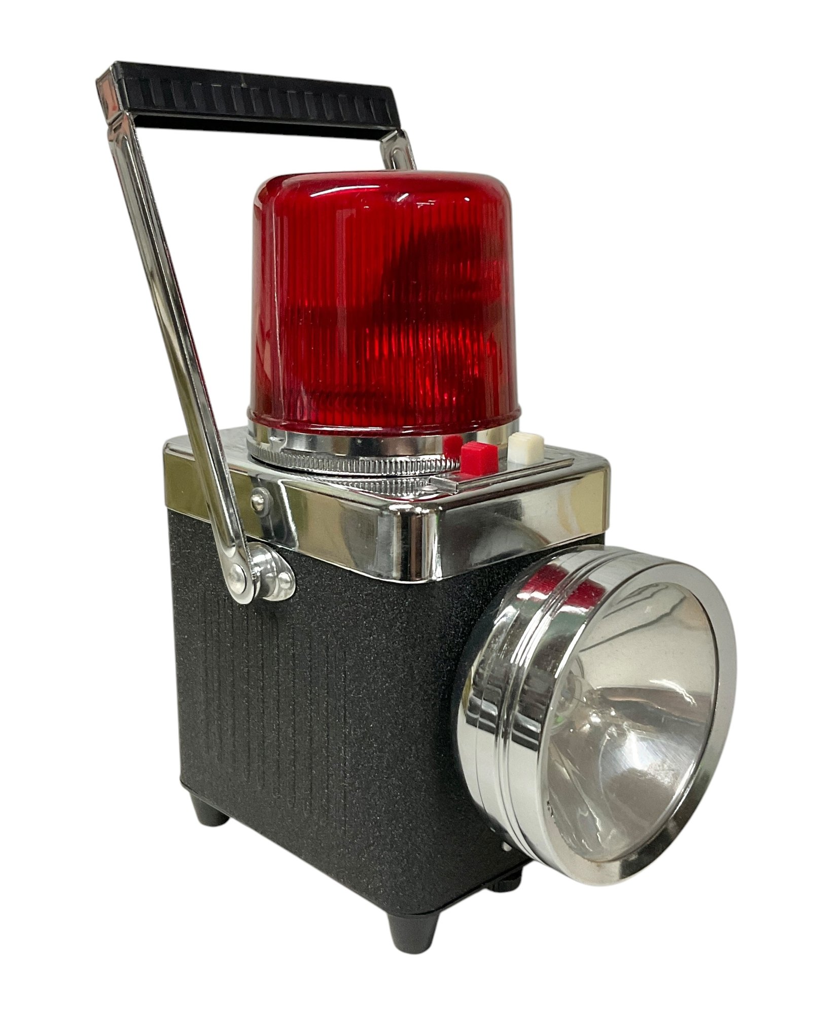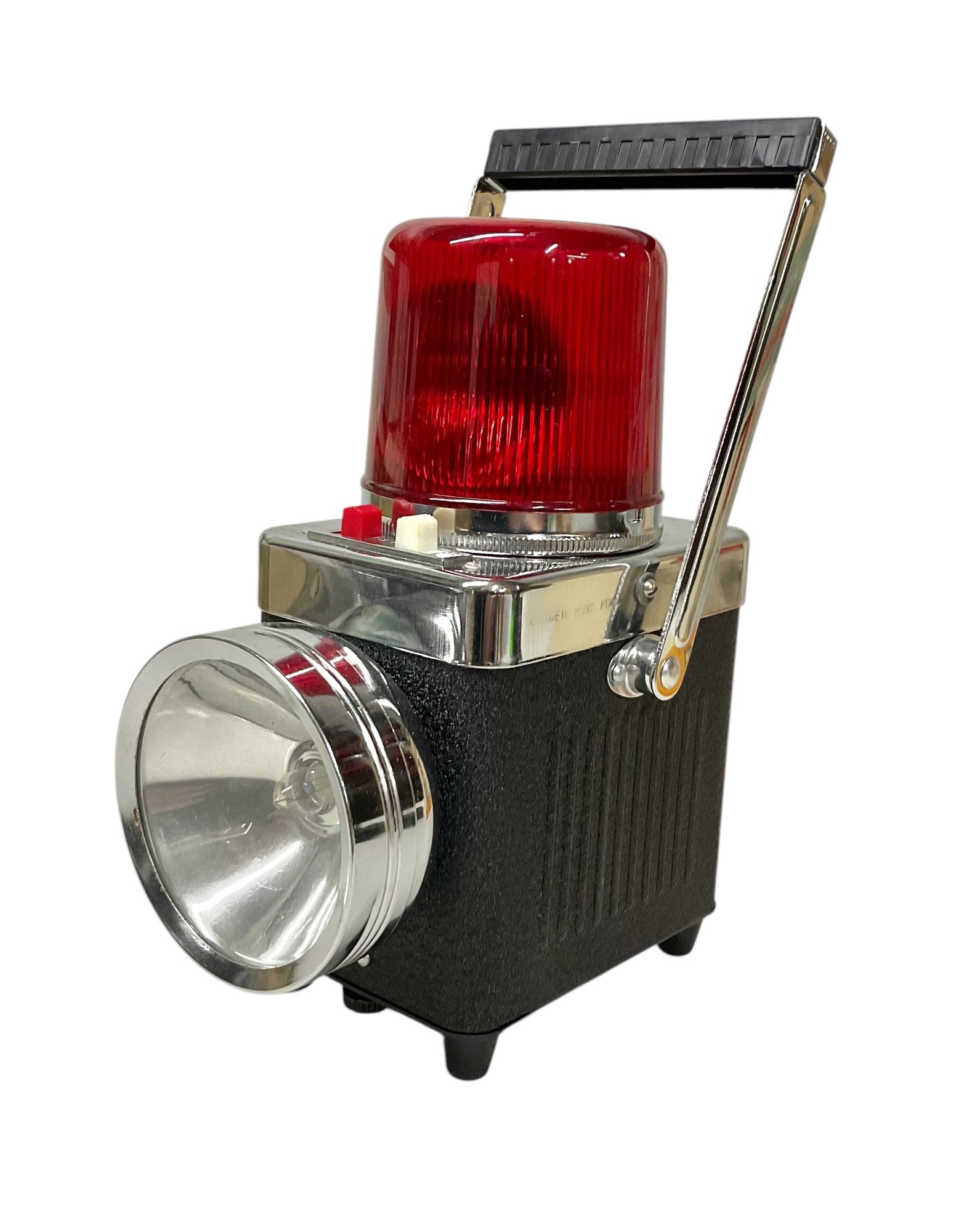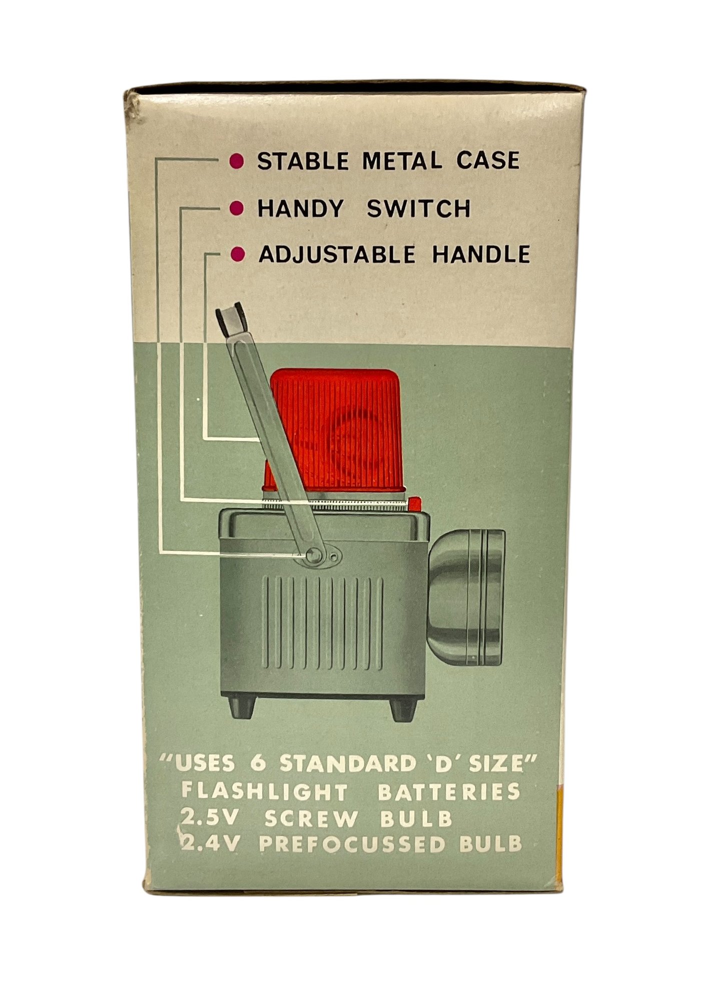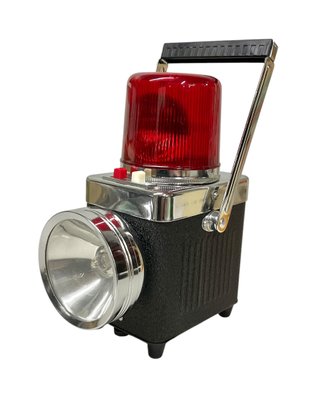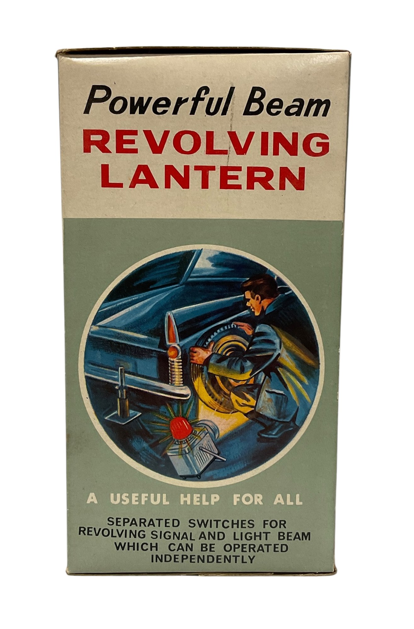Vintage Midcentury Powerful Beam Revolving Lantern In Original Box. Lantern is in great physical condition, but untested. Trademark K.C. No. 6511 A. Lantern measures approximately 9” tall when handle is completely vertical.