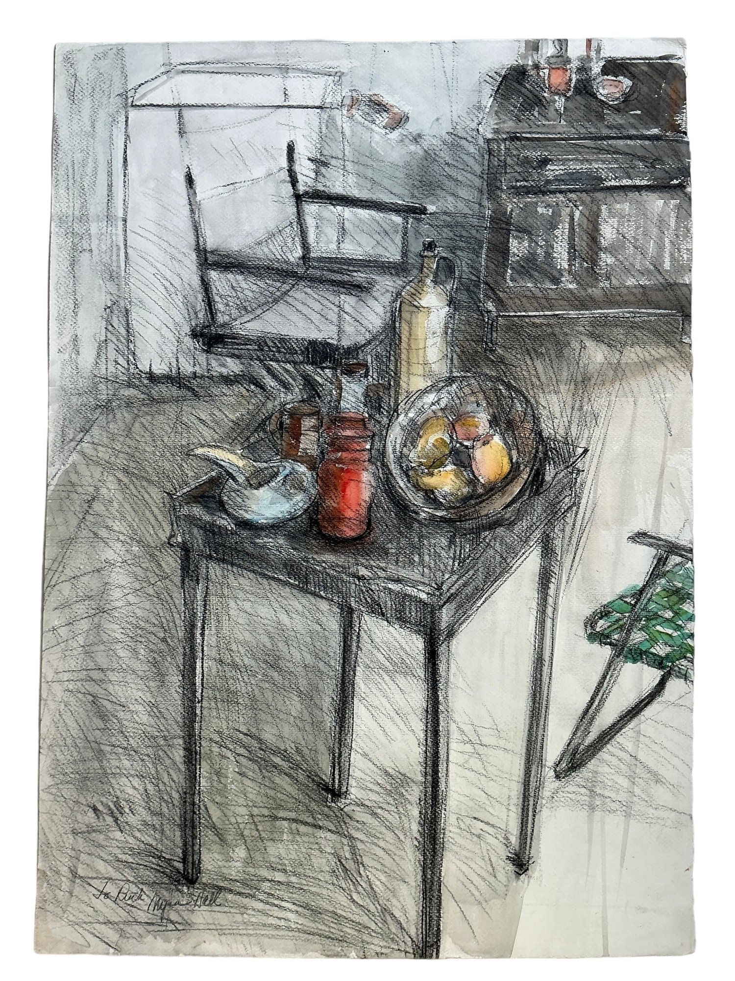Vintage Mixed Media Sketch By Myra Hall Titled Kitchen Table Signed Gloucester Artist. In very good condition. It is approx. 27.5” by 19.5”. Unharmed.