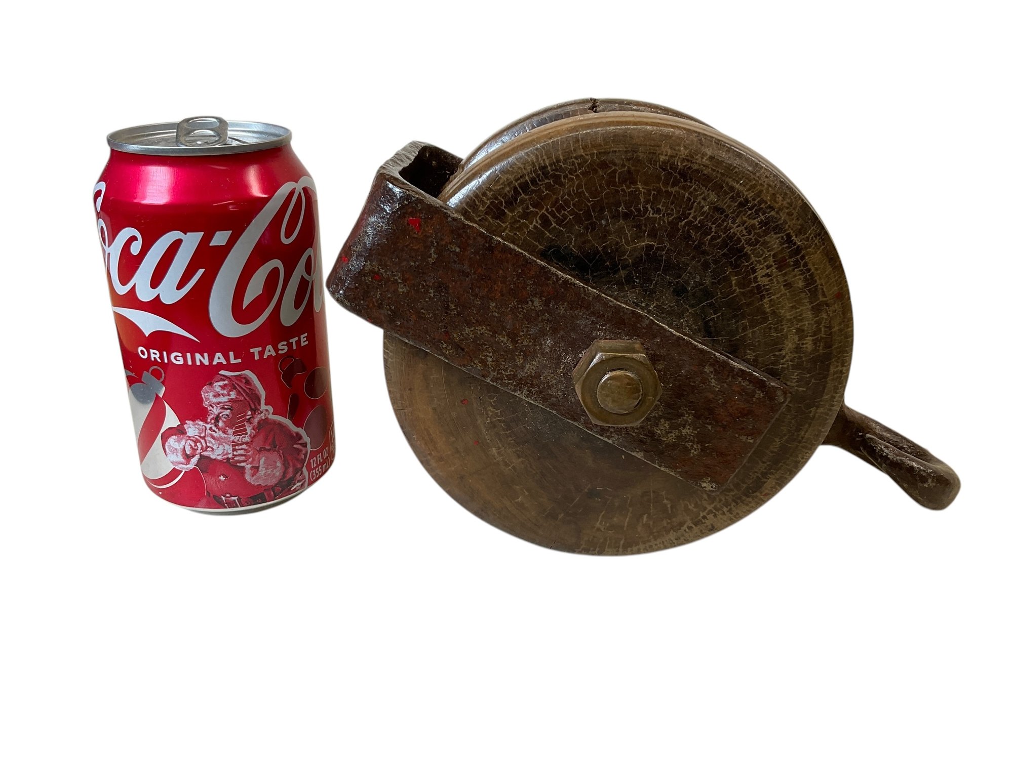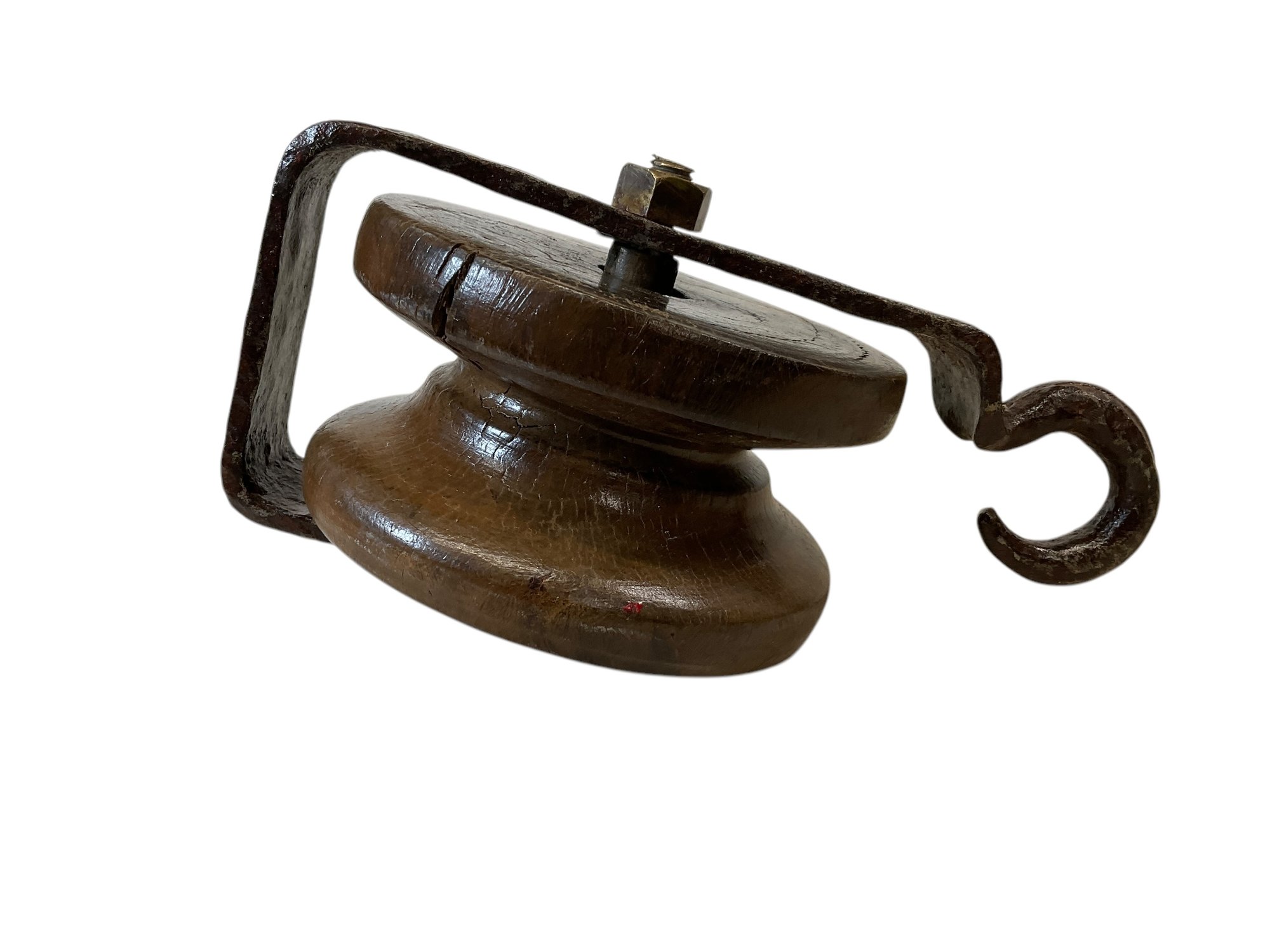 Vintage Nautical Hand Wrought Iron And Wood Pulley. In good used condition. It is approx. 9” tall.