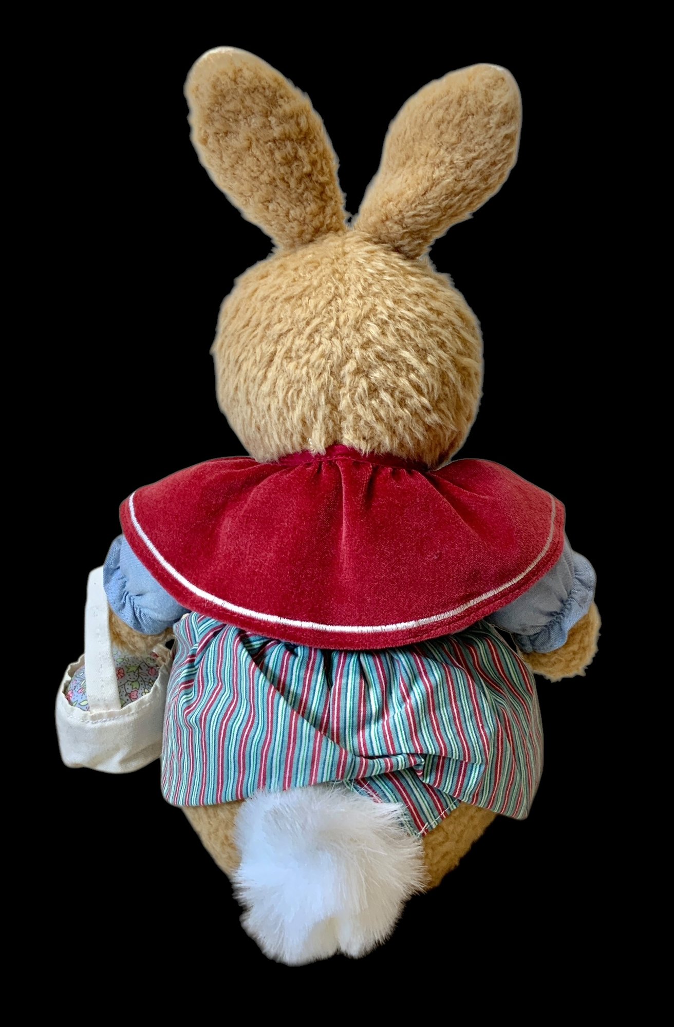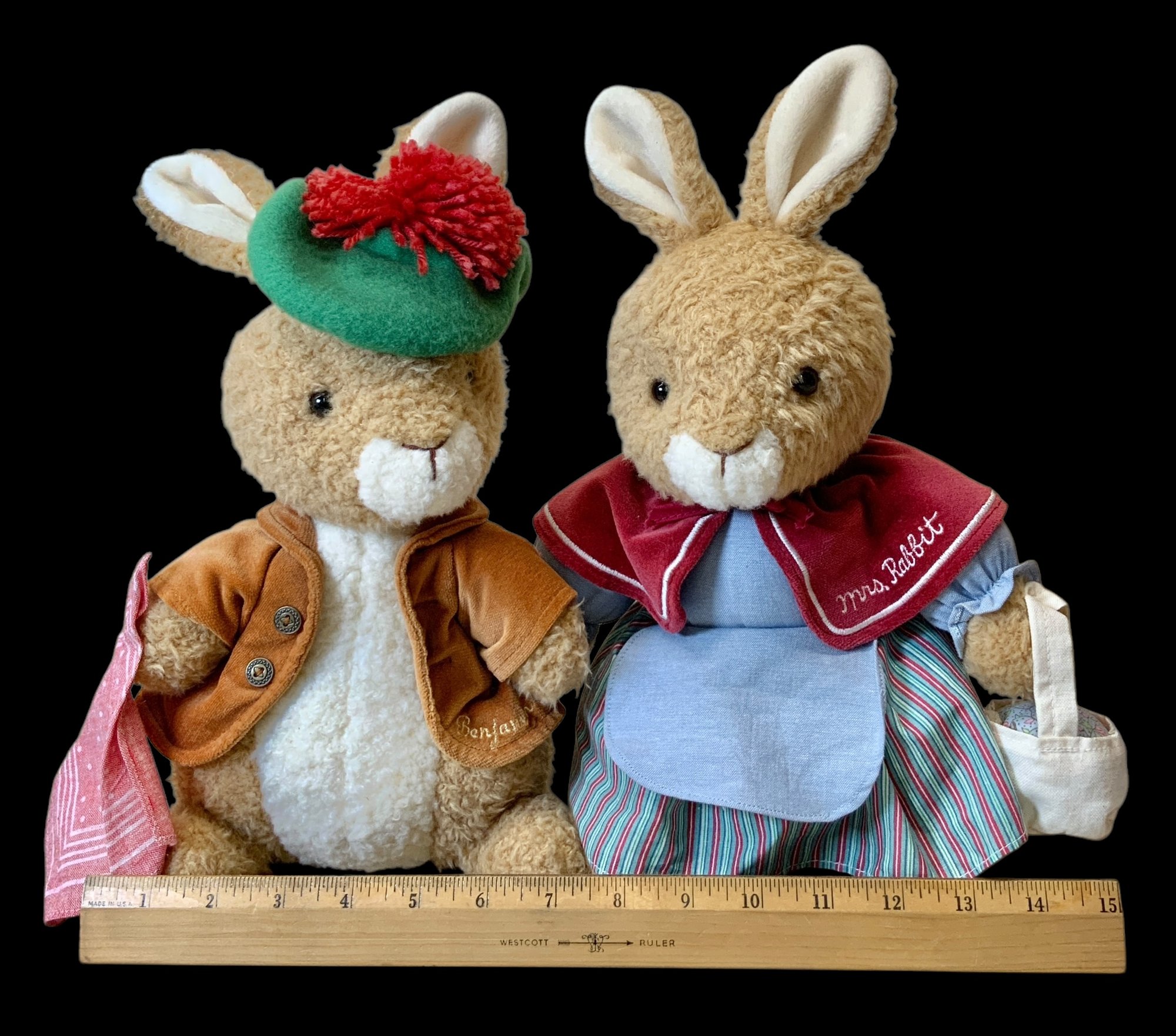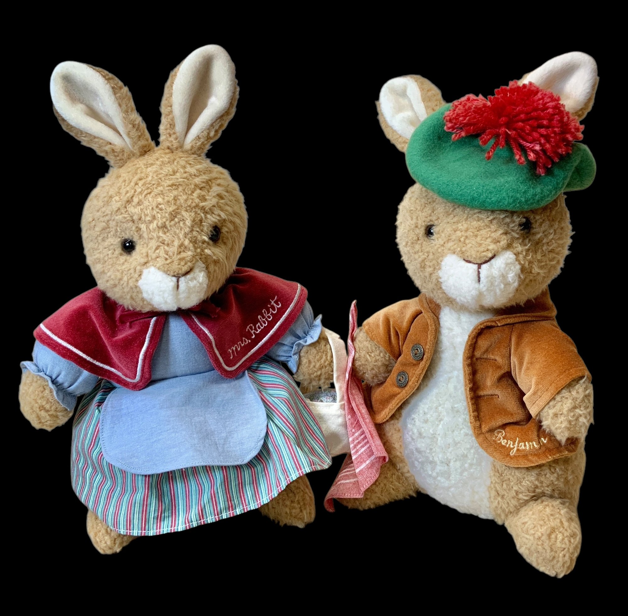 Vintage Pair Of Beatrix Potter Bunny Rabbit Stuffed Animals. Manufactured by Eden Toy Company. Includes Benjamin Bunny and Mrs. Rabbit, both Beatrix Potter characters, dressed in clothing and holding accessories. Good condition, please see photos for more details. Each measures approximately 13.5” tall.