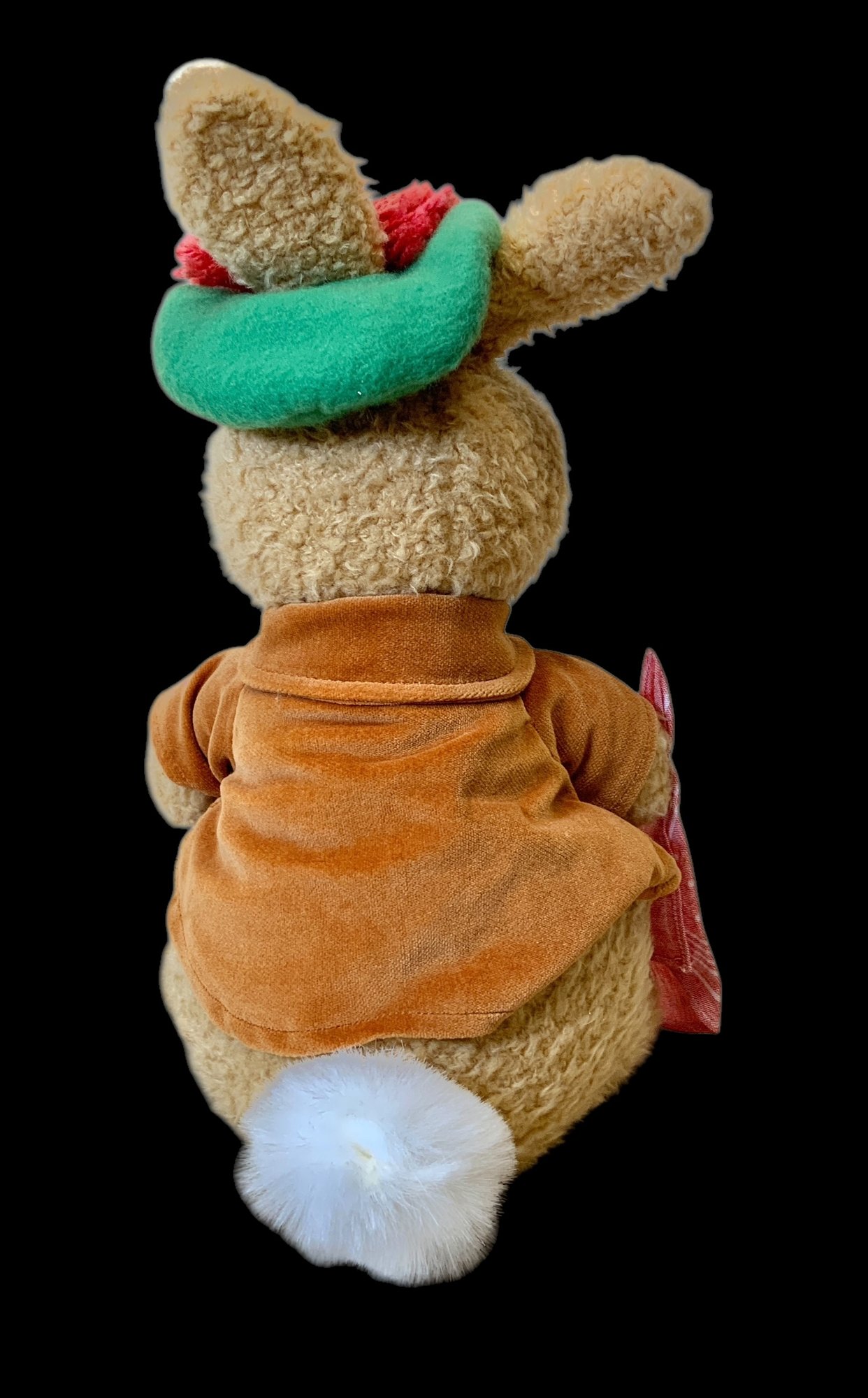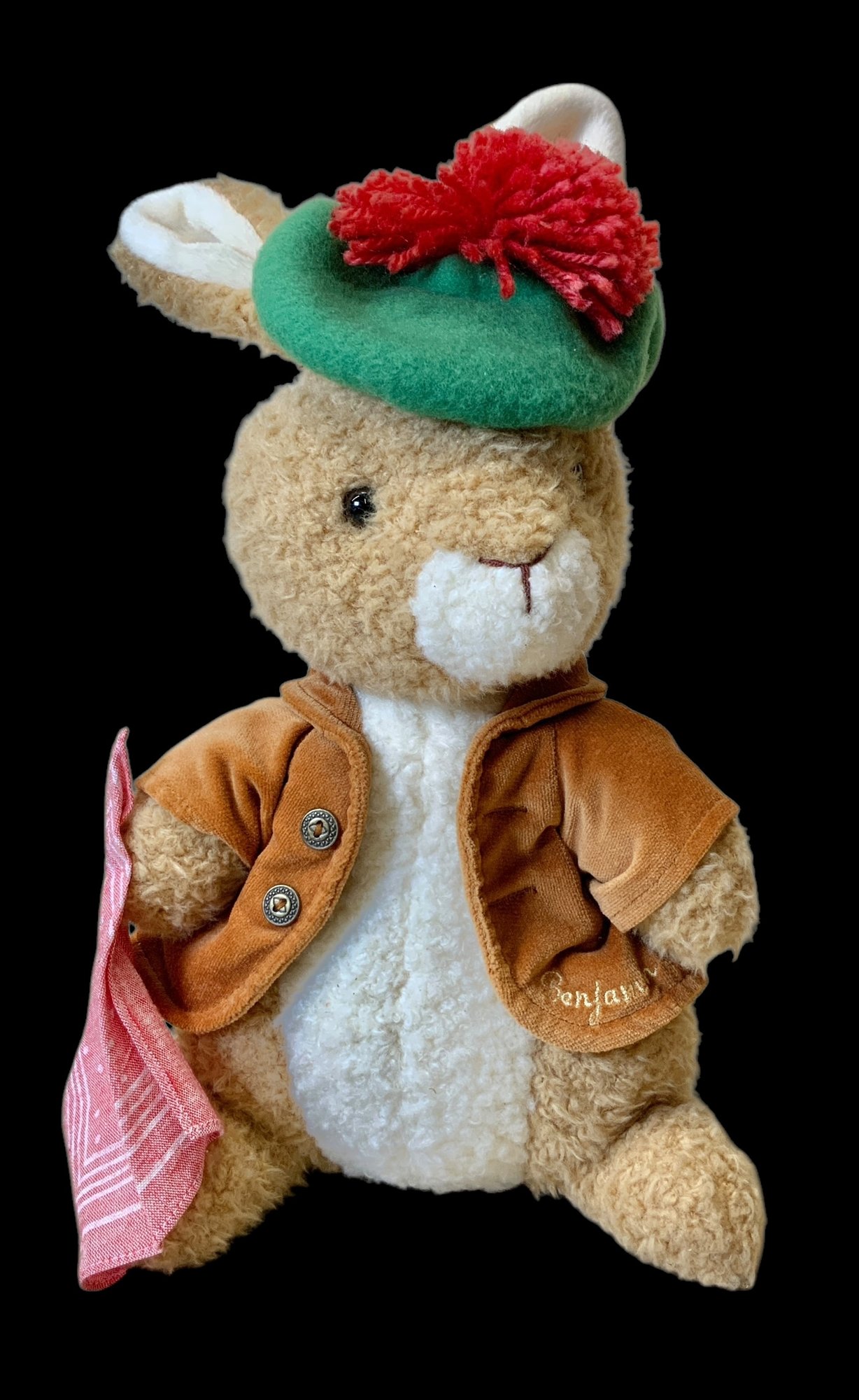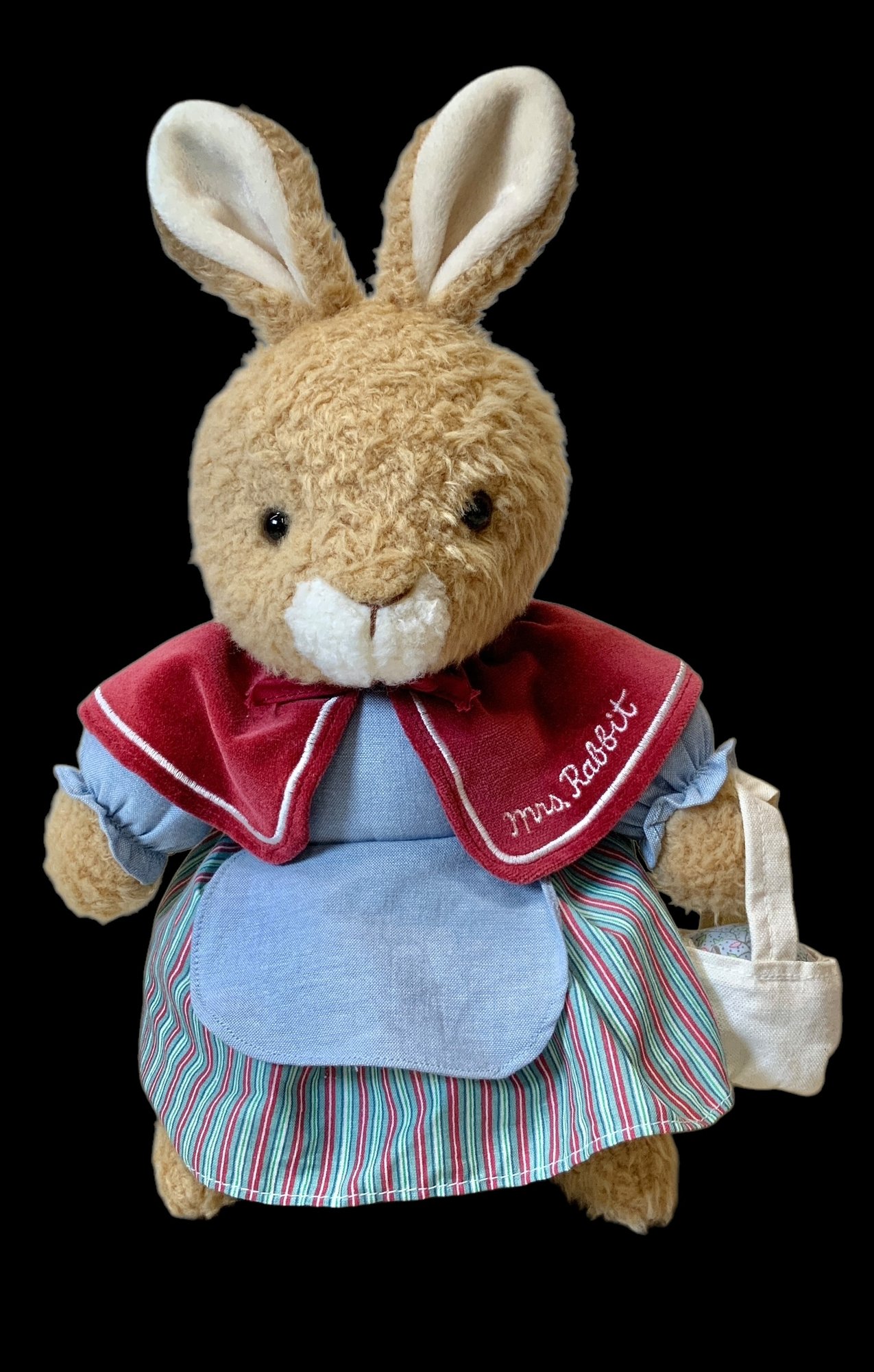 Vintage Pair Of Beatrix Potter Bunny Rabbit Stuffed Animals. Manufactured by Eden Toy Company. Includes Benjamin Bunny and Mrs. Rabbit, both Beatrix Potter characters, dressed in clothing and holding accessories. Good condition, please see photos for more details. Each measures approximately 13.5” tall.