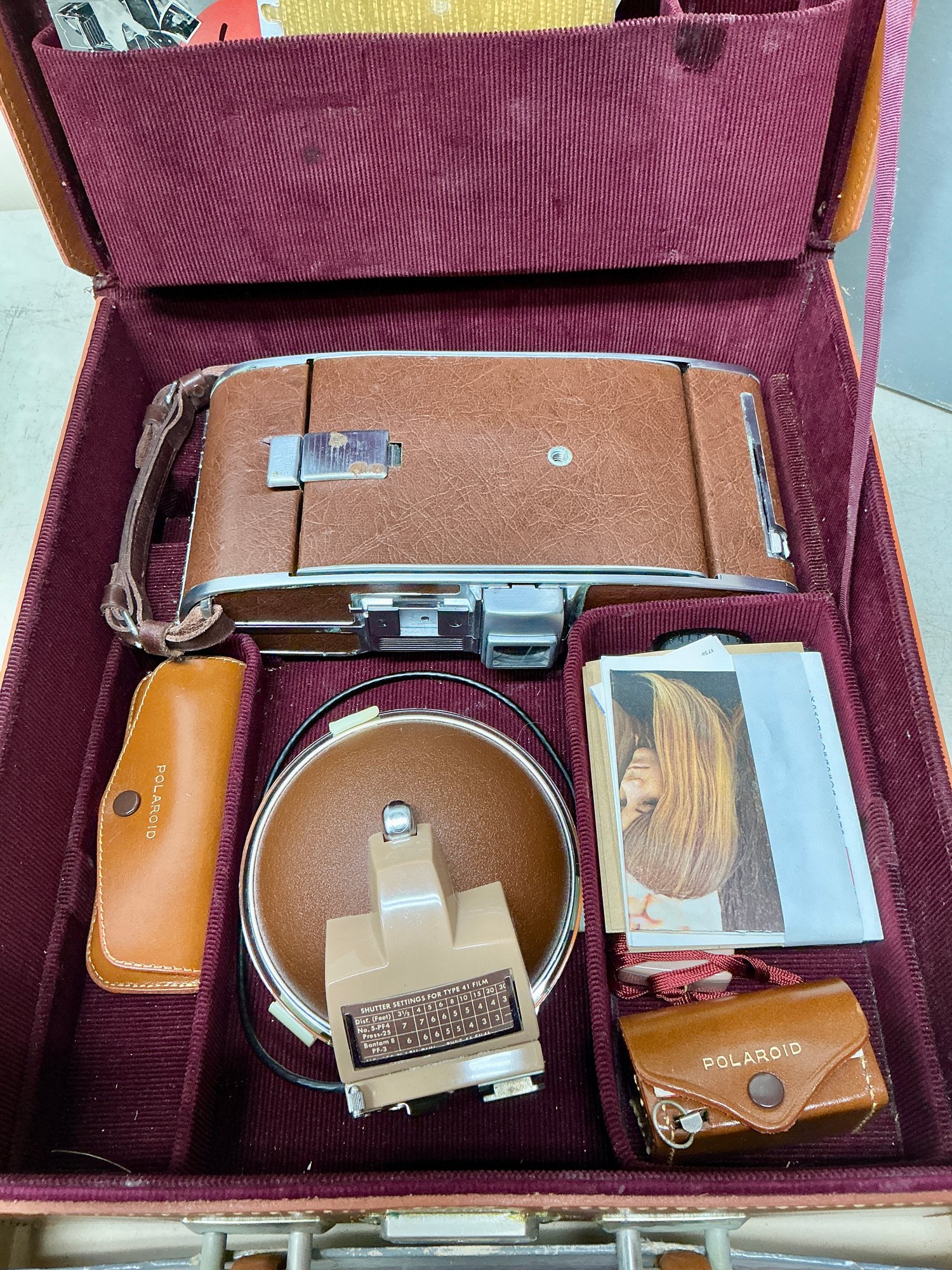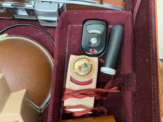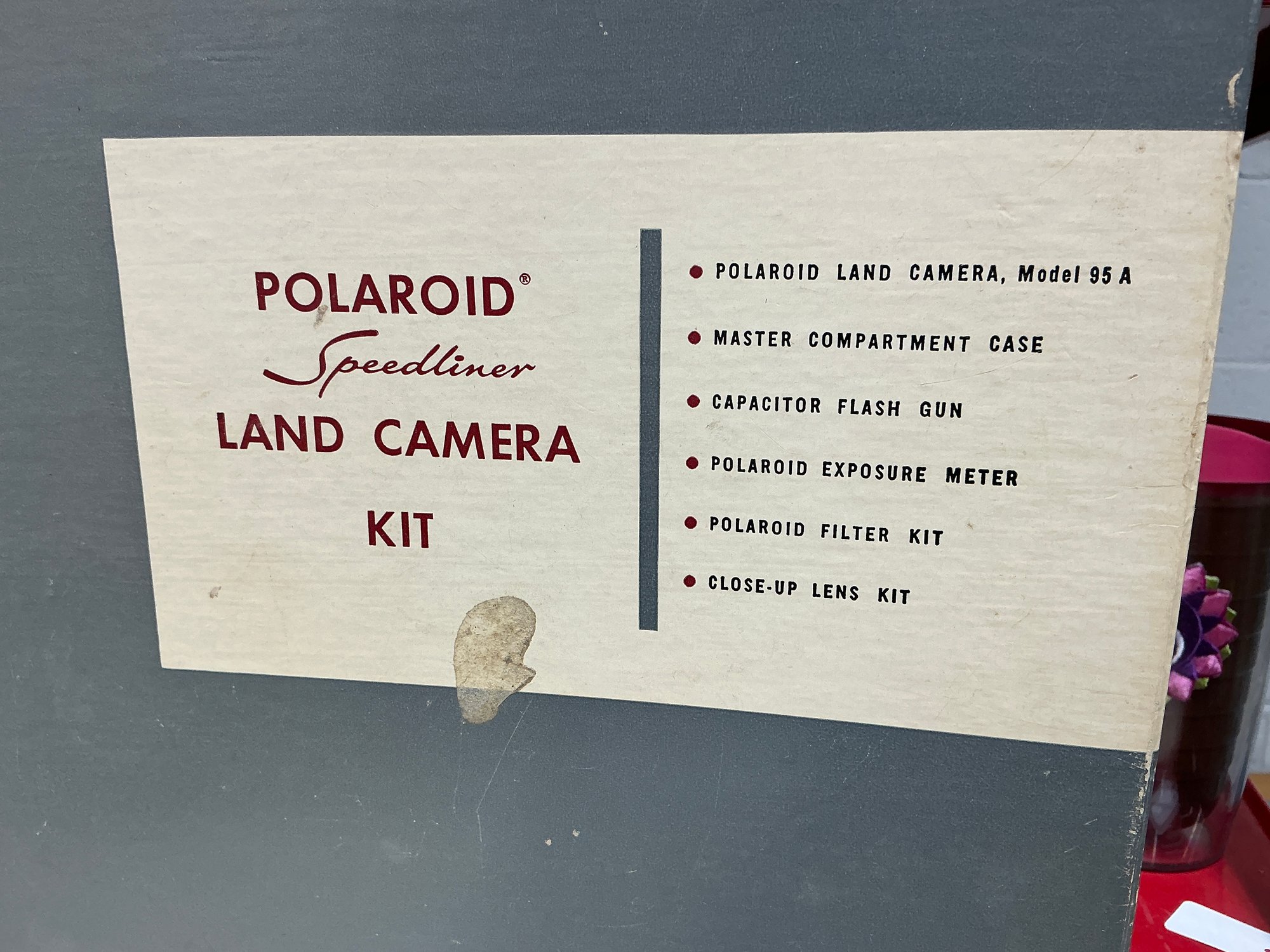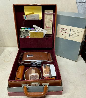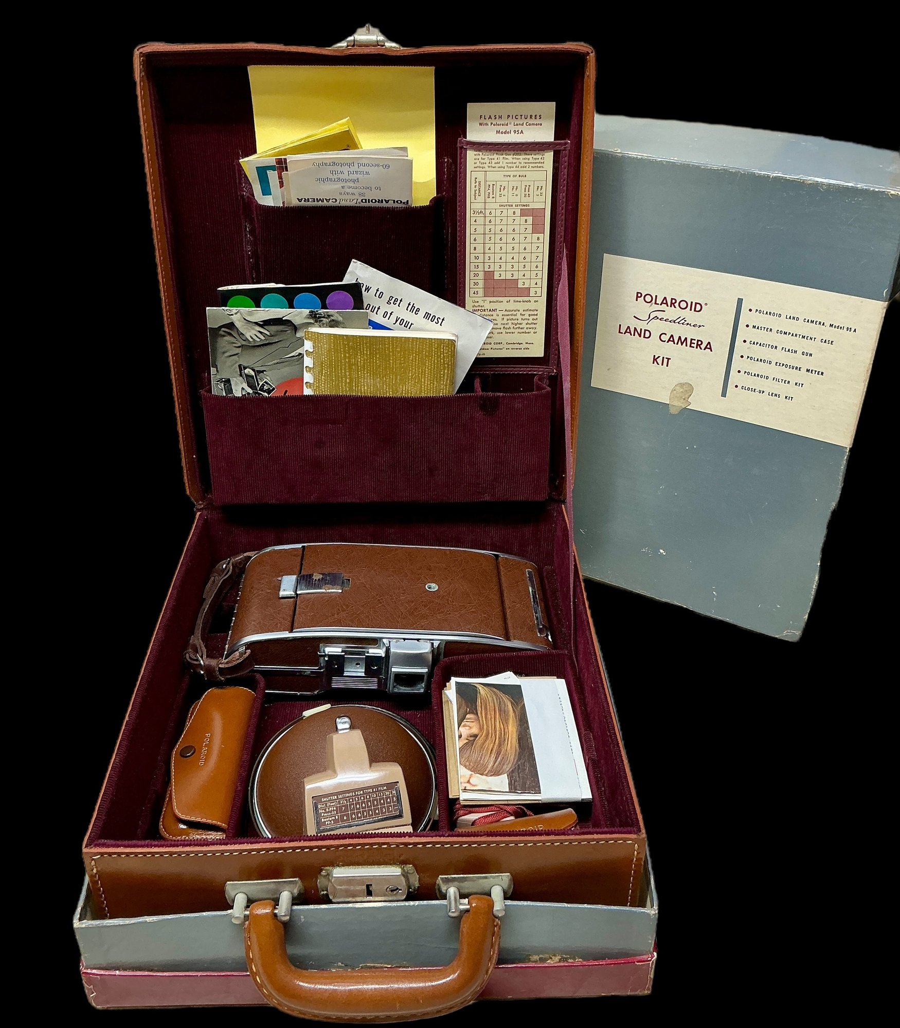 Vintage Polaroid Speedliner Land Camera Kit. Includes Leather Carrying Case, Polaroid Land Camera Model 95 A, Flash, Diffuser, Filters, Close-up Lens Kit, Etc. Comes with many instruction booklets. Excellent Condition, but untested.