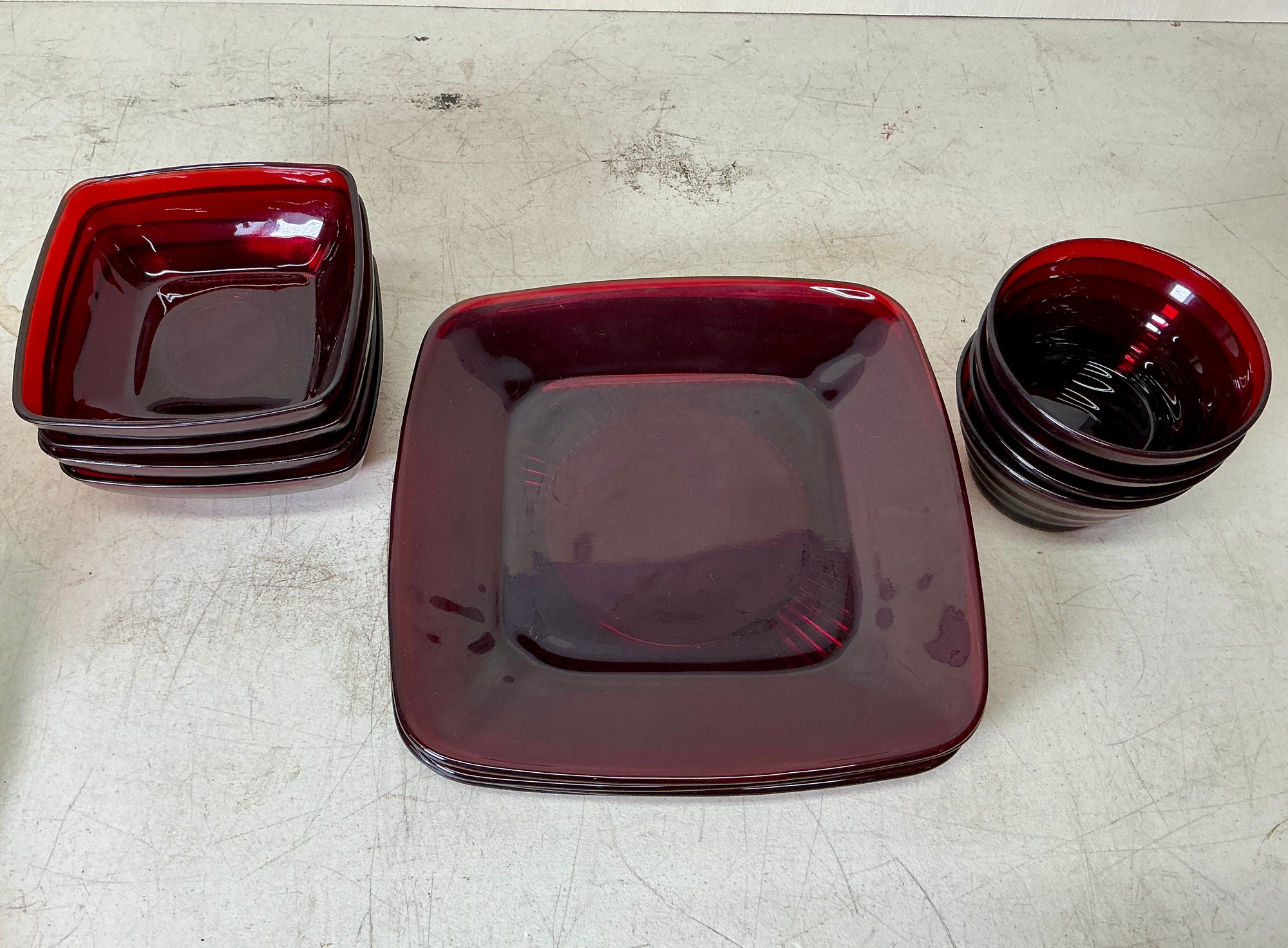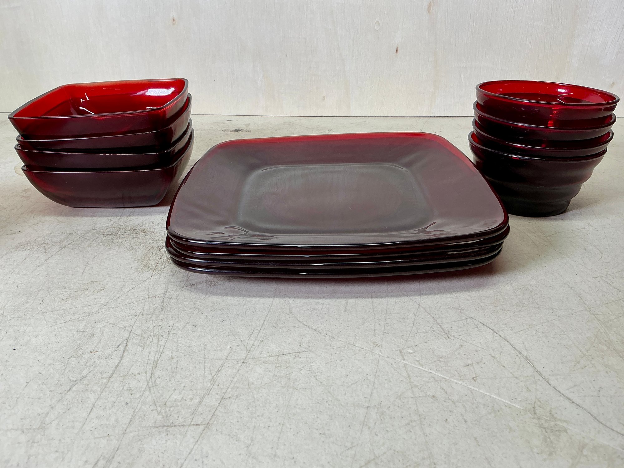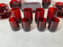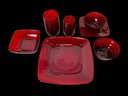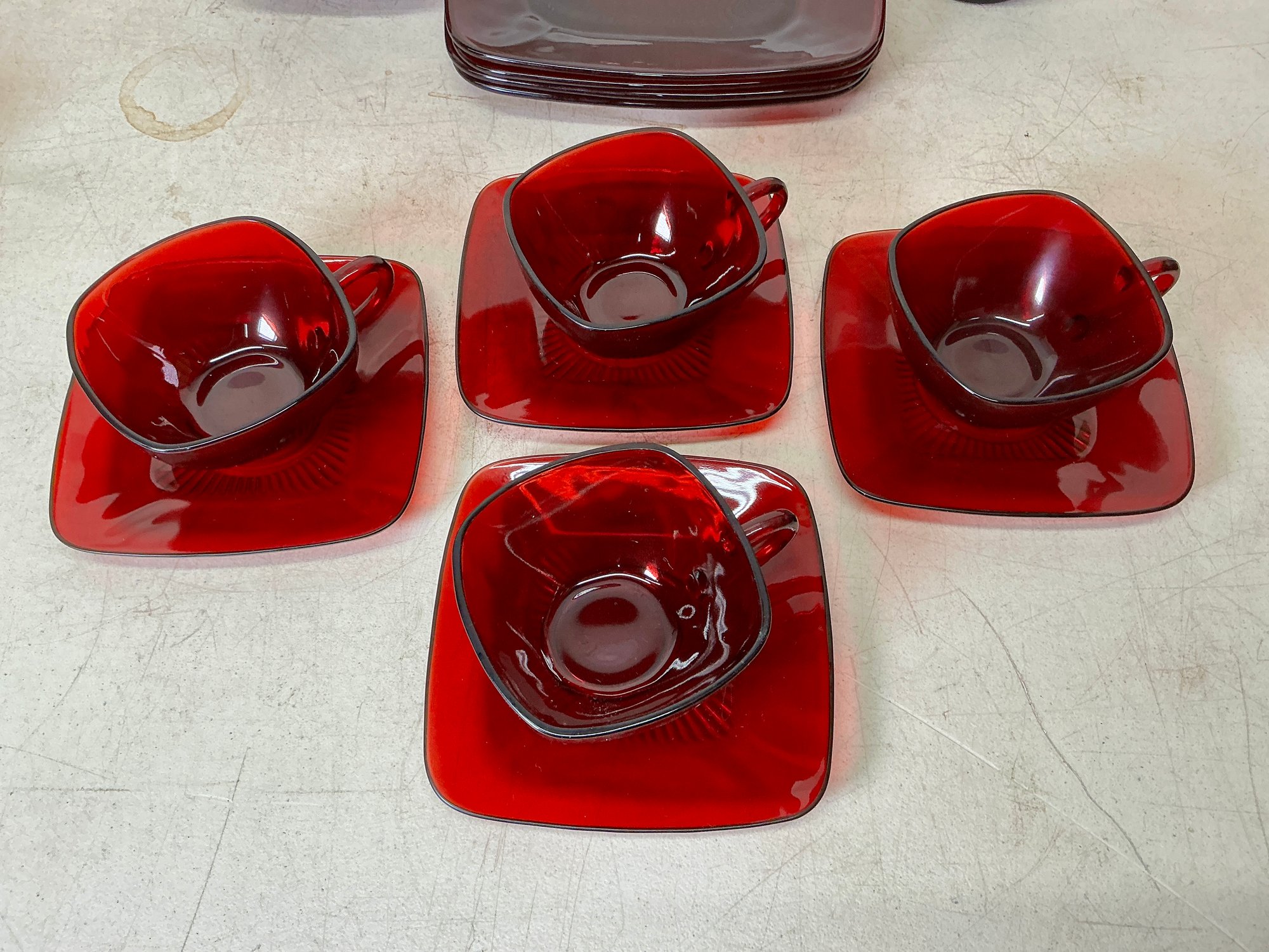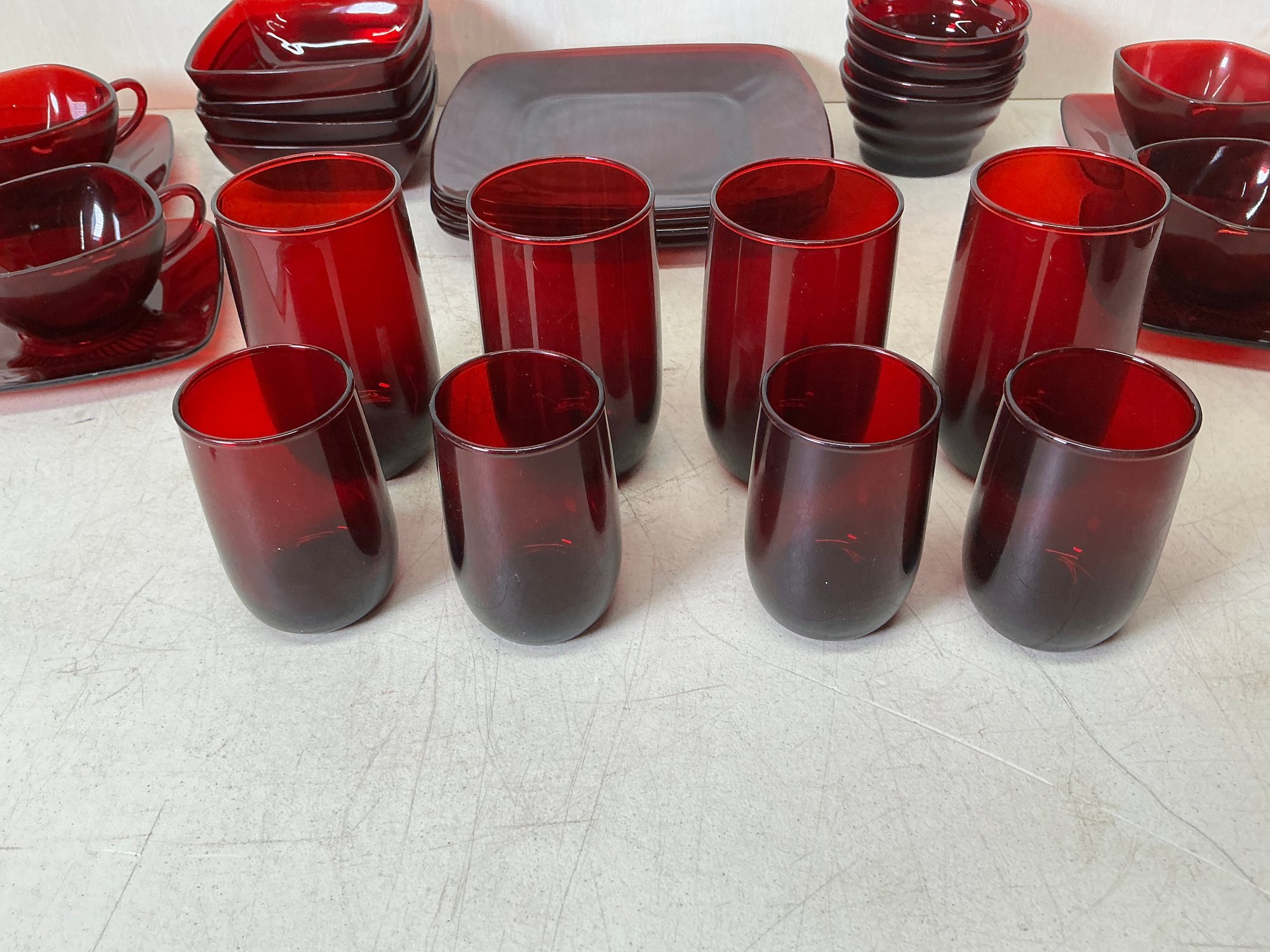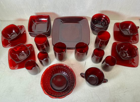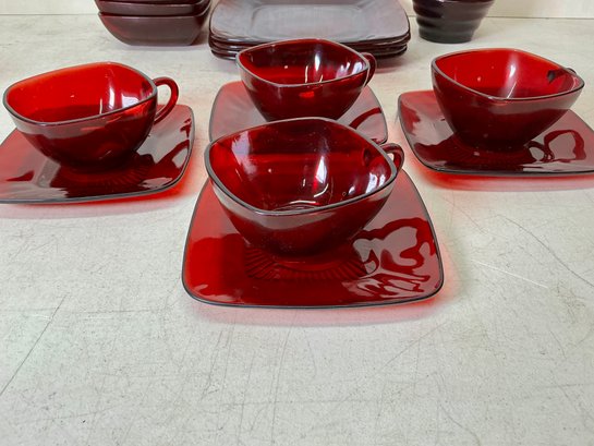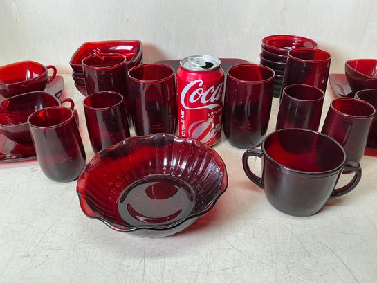 Vintage Ruby Red Anchor Hawking Luncheon Set. 4 sets of plates, teacups, saucers, big bowls, little bowls, large cups, and small cups. 2 bowls and 1 double handled cup extra. 31 pieces in total. Excellent condition, no chips or cracks. Large plates are approx. 8.5”x8.5”. See photos for details.