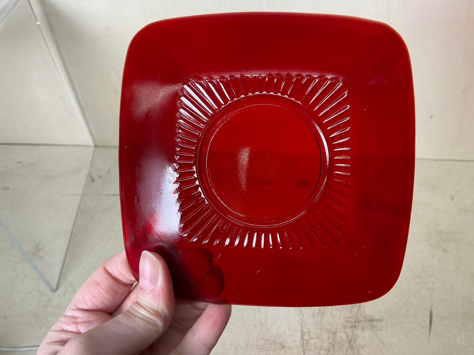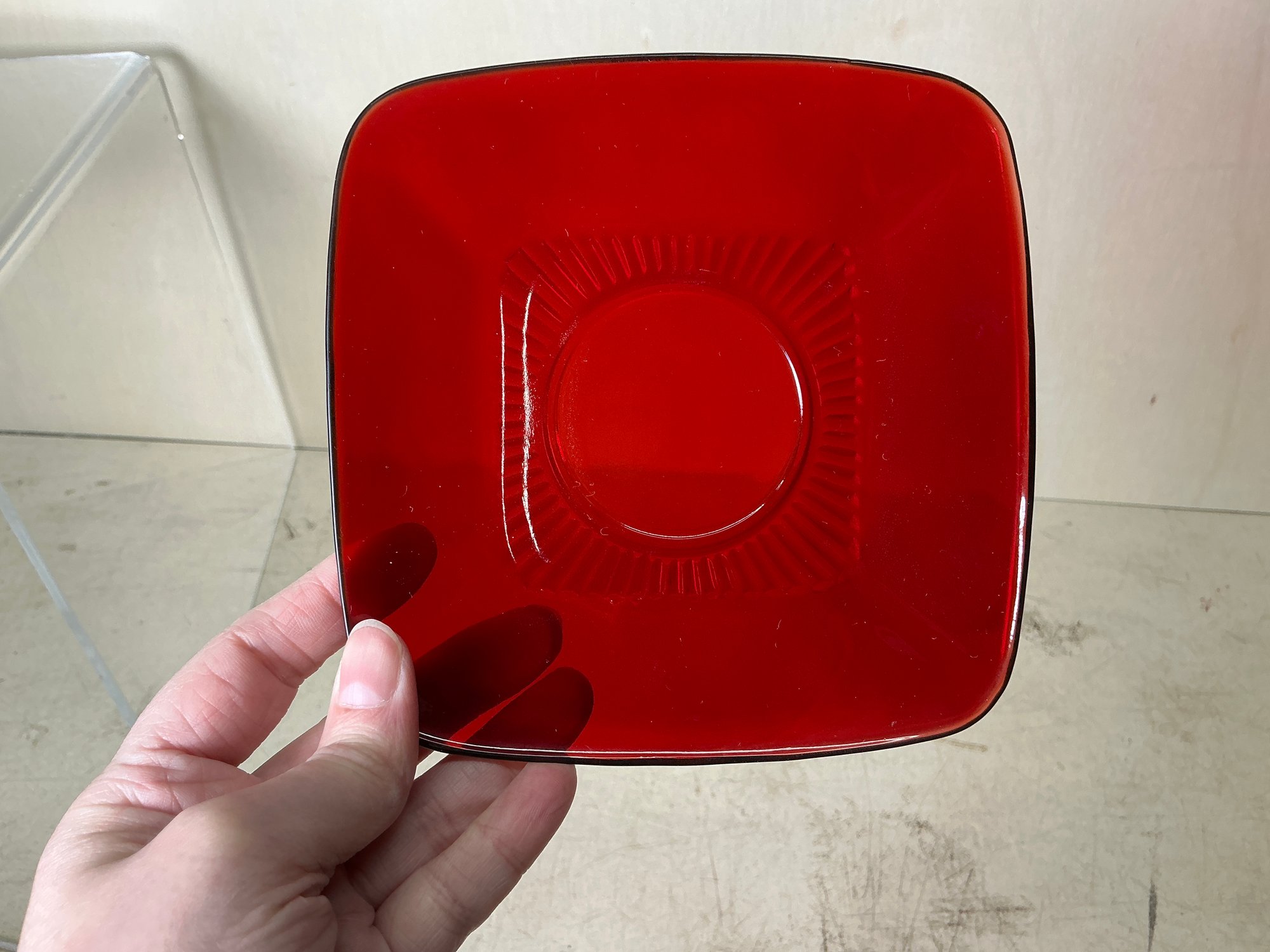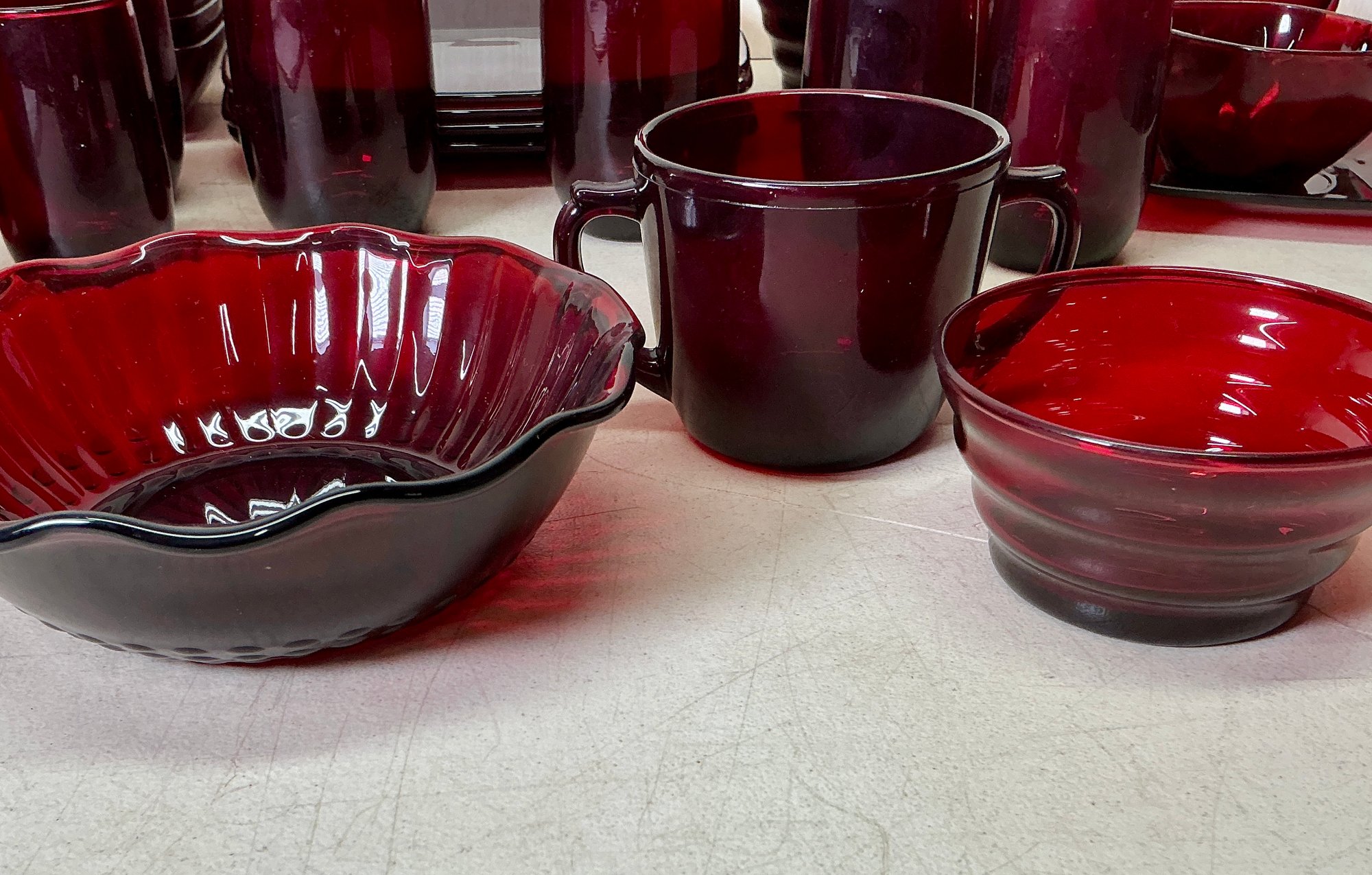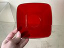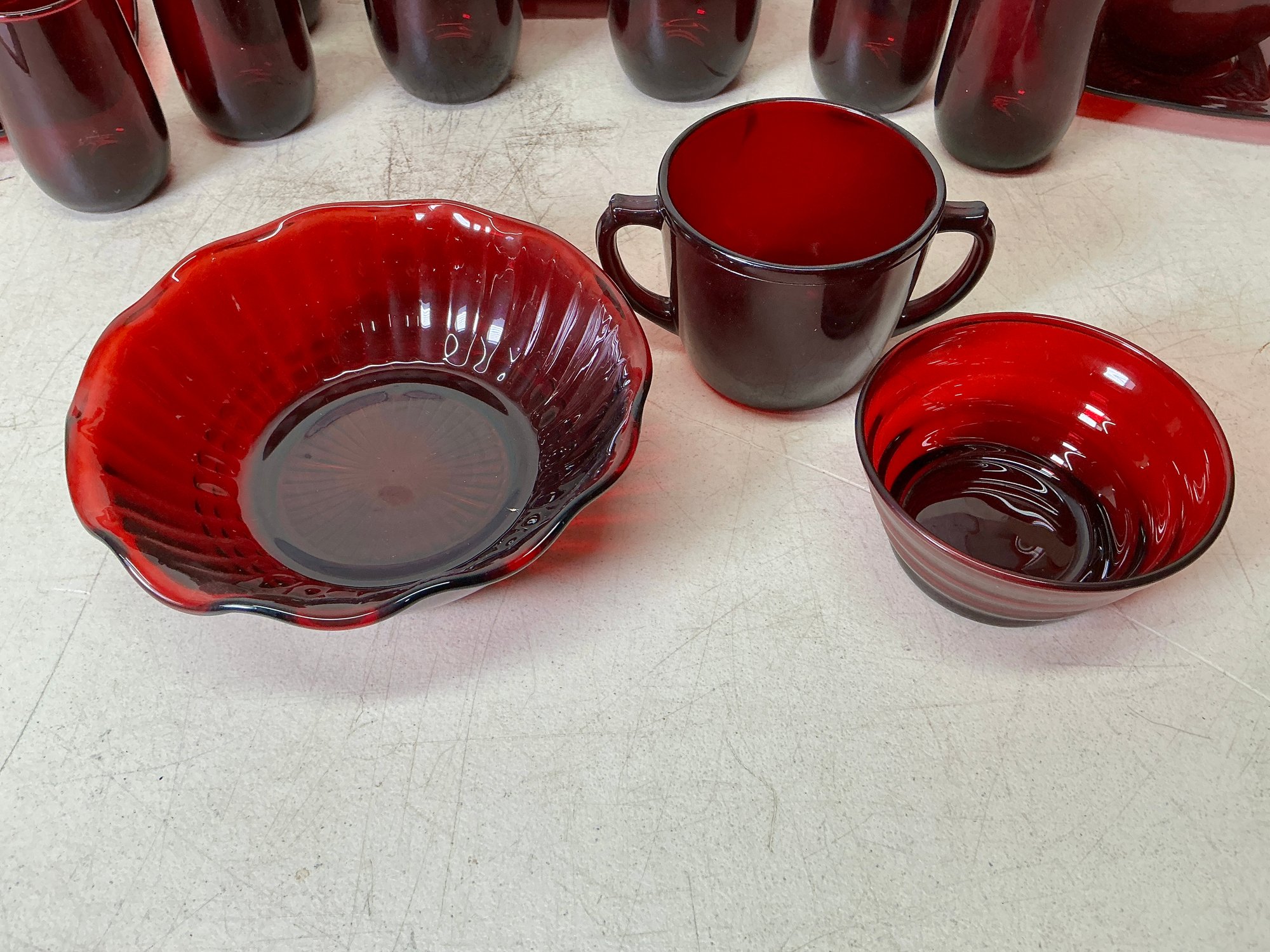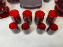 Vintage Ruby Red Anchor Hawking Luncheon Set. 4 sets of plates, teacups, saucers, big bowls, little bowls, large cups, and small cups. 2 bowls and 1 double handled cup extra. 31 pieces in total. Excellent condition, no chips or cracks. Large plates are approx. 8.5”x8.5”. See photos for details.