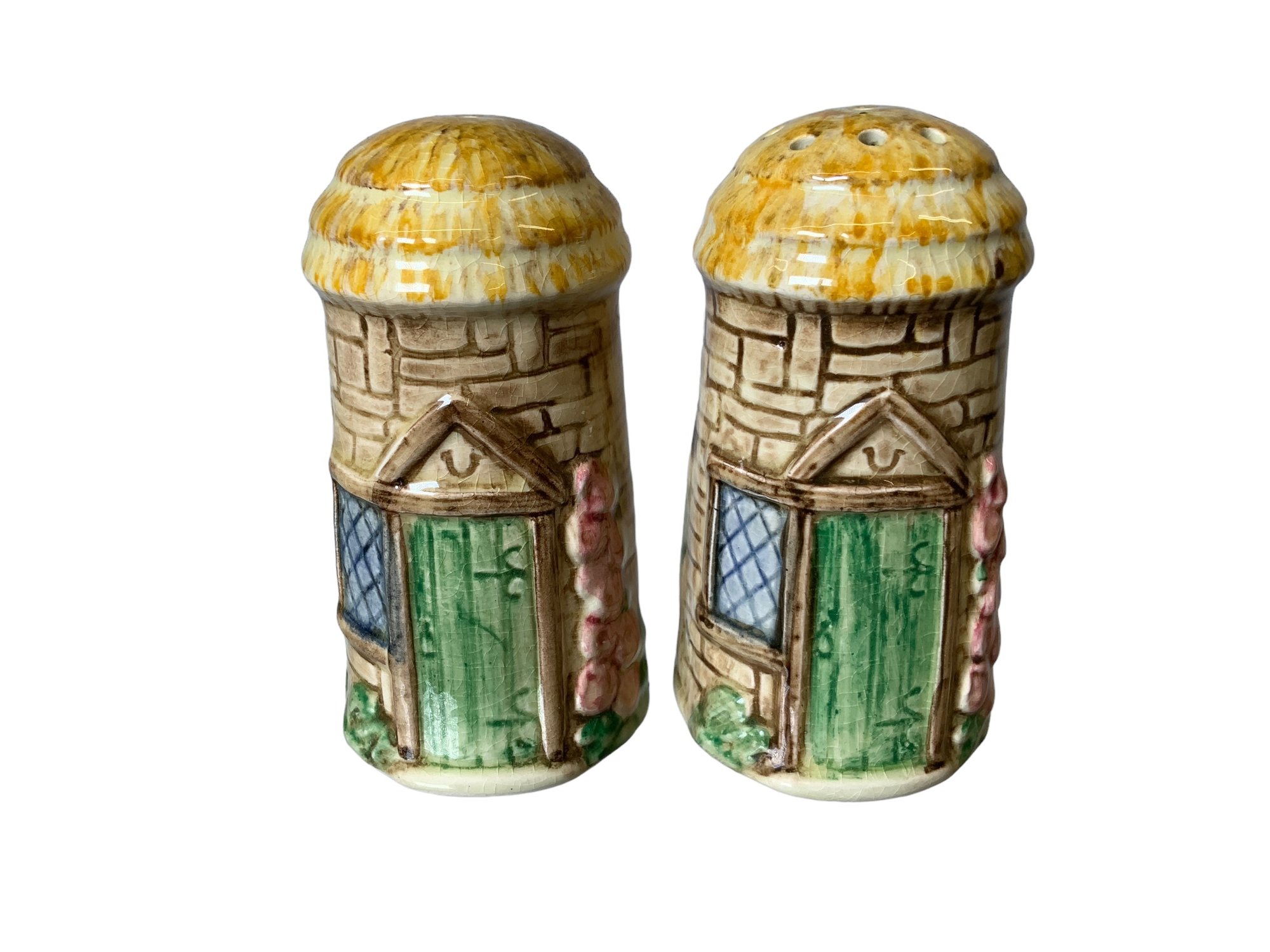 Vintage Thatched Cottage Salt And Pepper Shakers Glazed Porcelain Marked England. In good used condition. They are each approx. 3.5” tall.