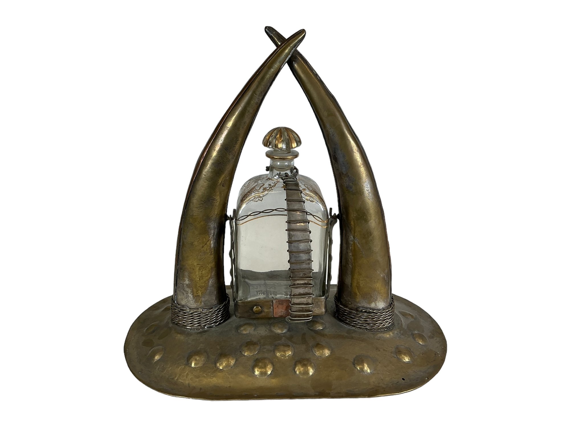 Vintage Tin Horn Form Decanter Set. In very good condition. The bottle is marked Jerez, Spain and the tin base is signed “B. Kwik”. It is approx. 14” tall and 15” wide.