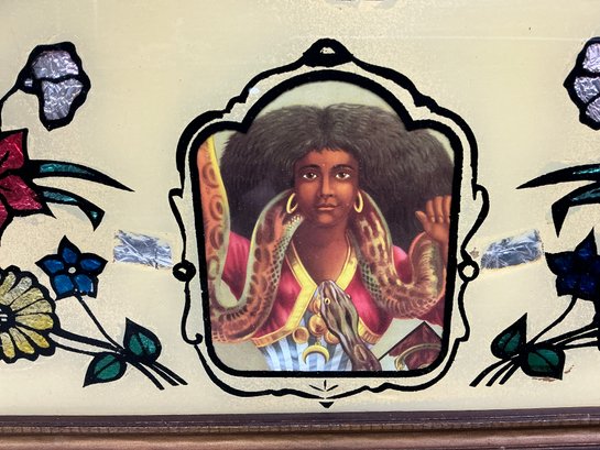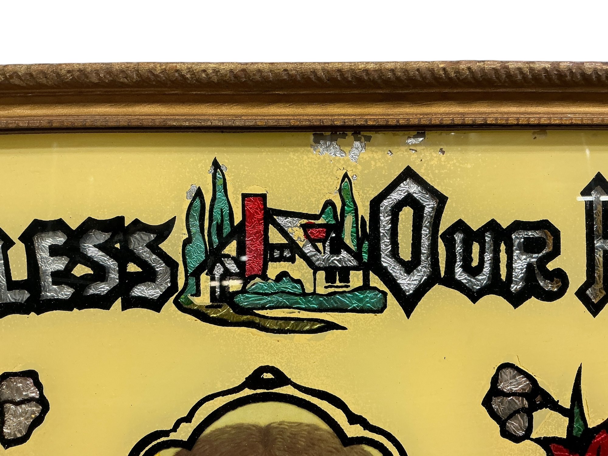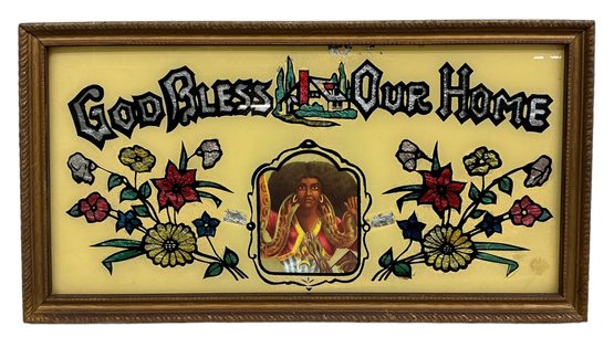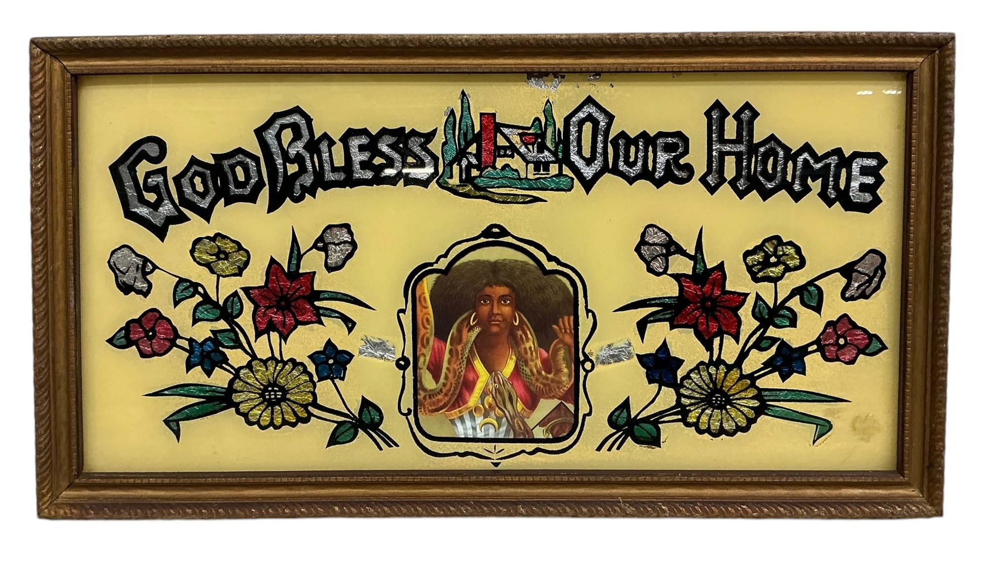 Vintage Voodoo Vodun African God Bless Our Home Reverse Painted Picture. See photos for condition, a small amount of paint loss in the upper center. Frame size is approx. 9” by 17.”