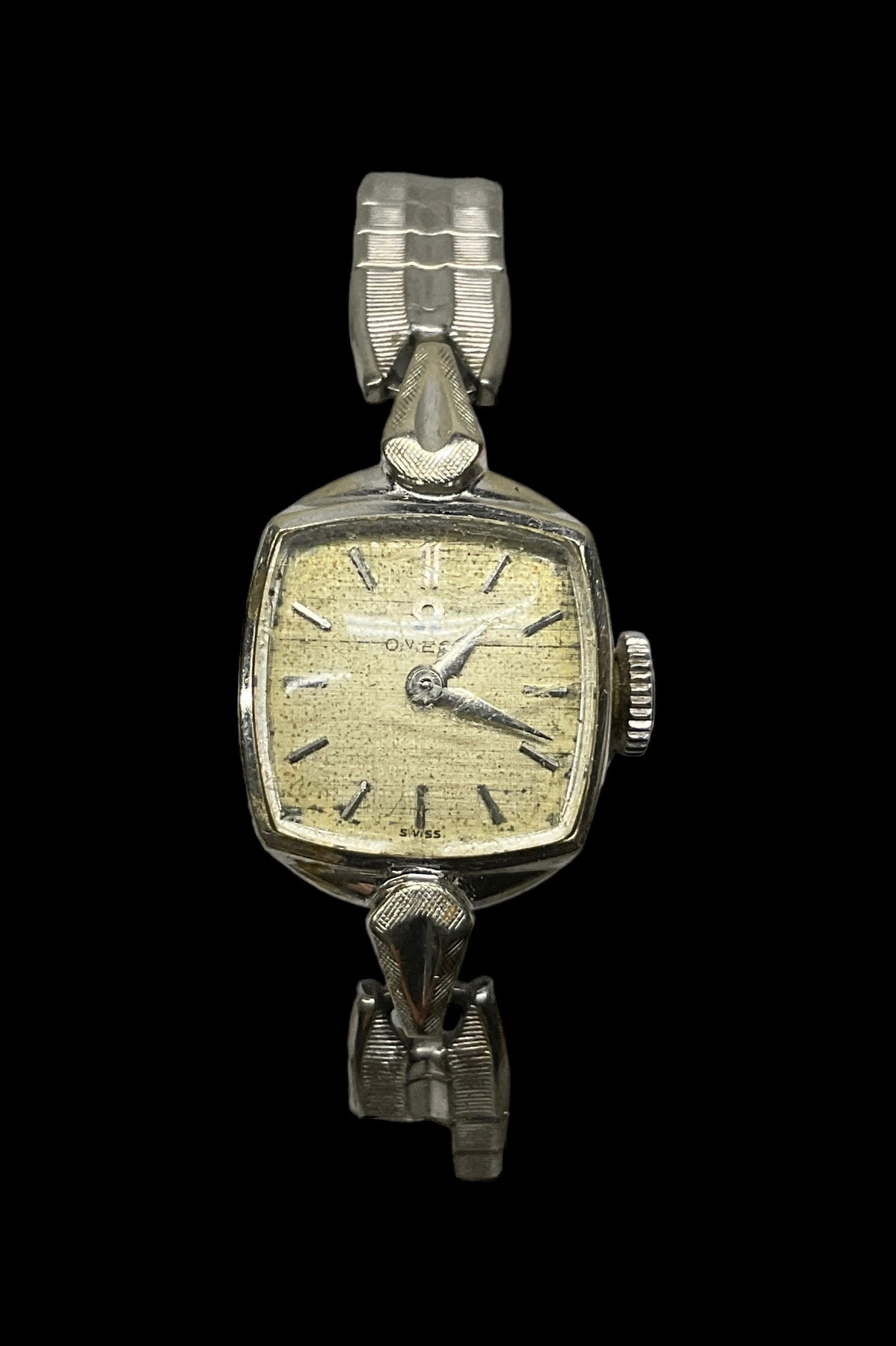 Vintage Omega Wristwatch, working, but not timed for accuracy. The watch face is solid 14K White Gold, the band is not. Minor scratches to the metal, but some slightly deeper scratches on the glass.