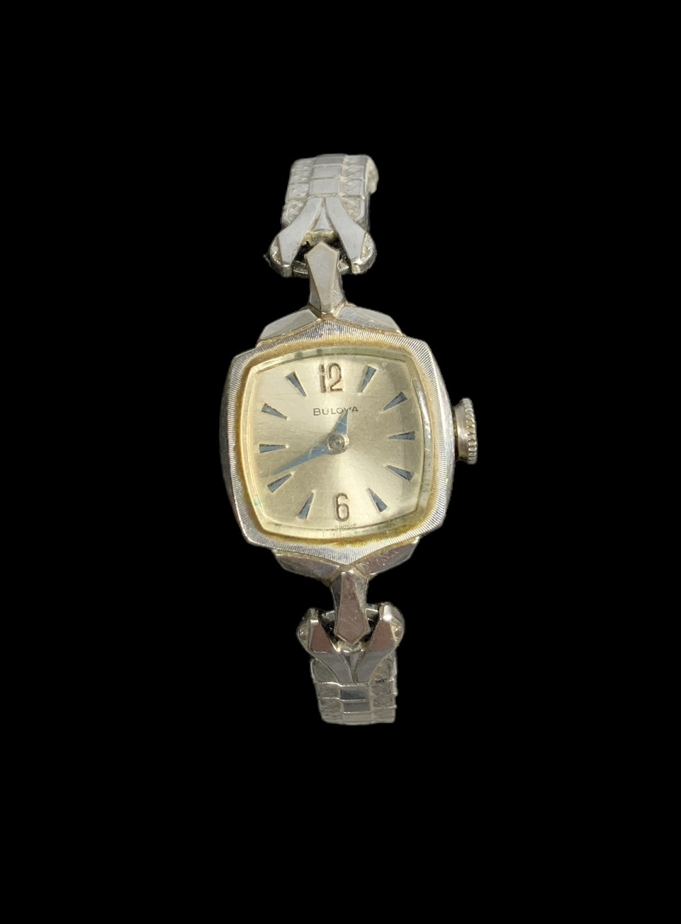 Vintage Womens Bulova Mechanical Watch 10K Rolled Gold Plate Bezel Running Condition. Currently winds and runs but no guarantee is made. The bracelet is a stretch Speidel and has a diameter of approx. 2”.