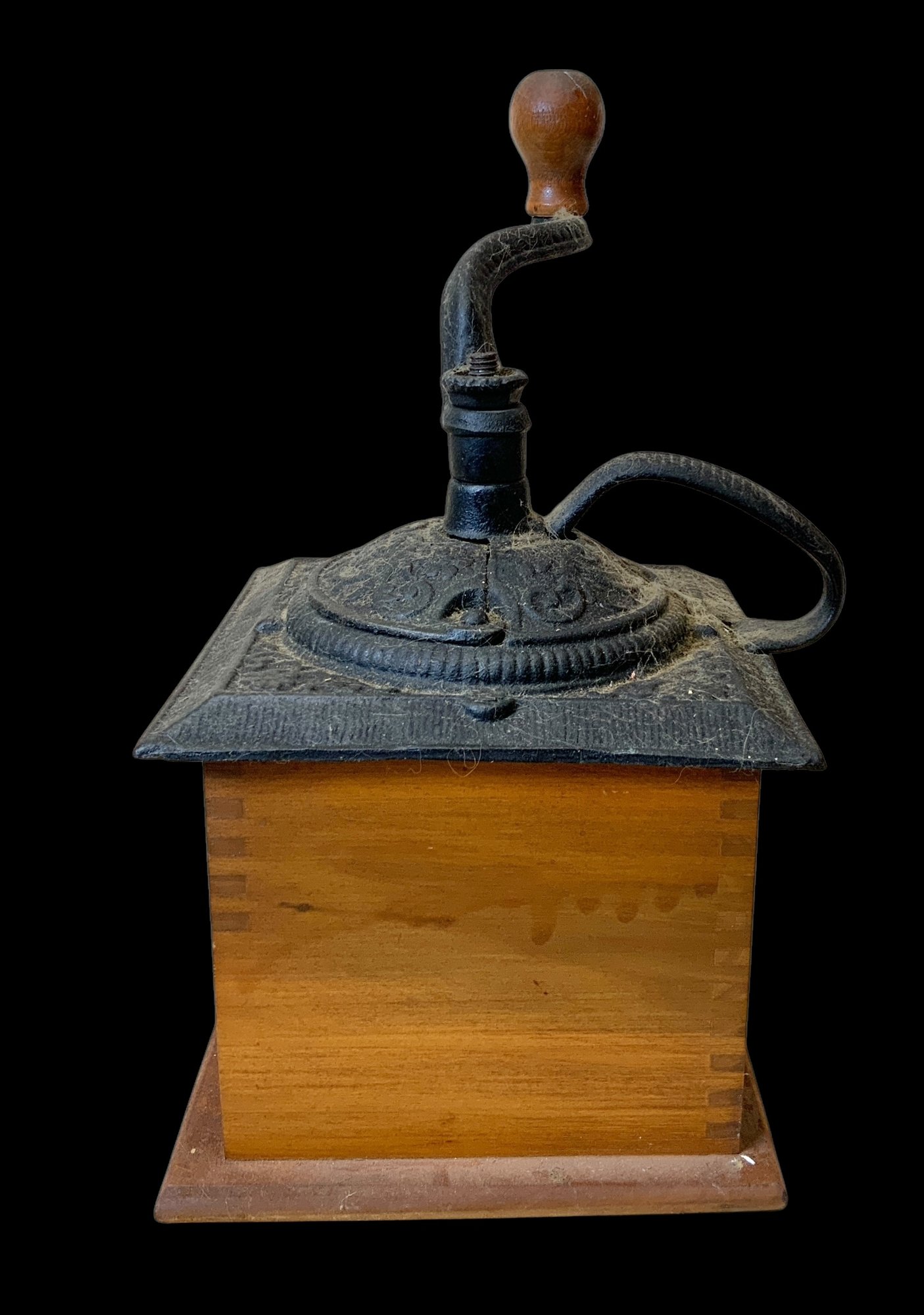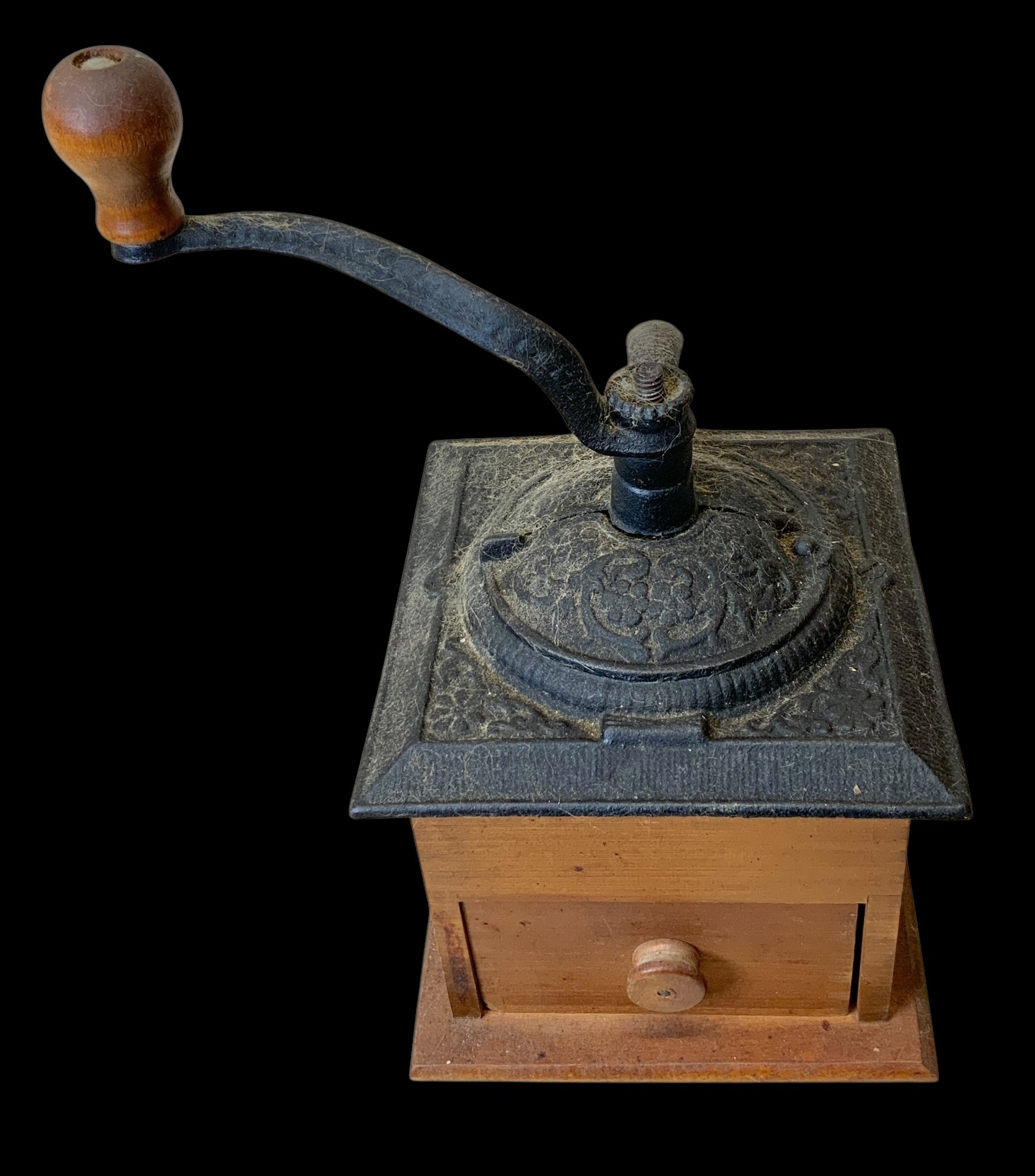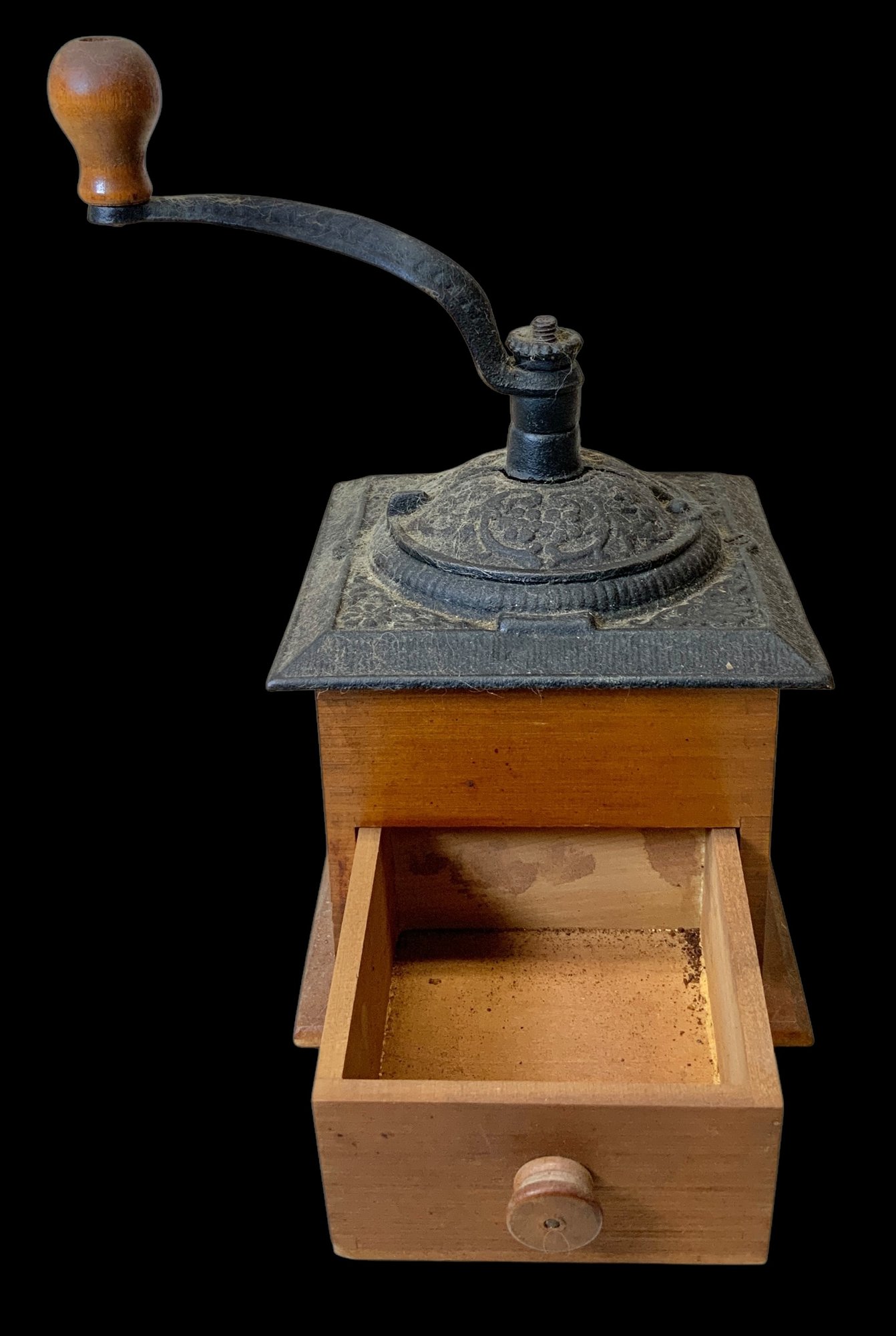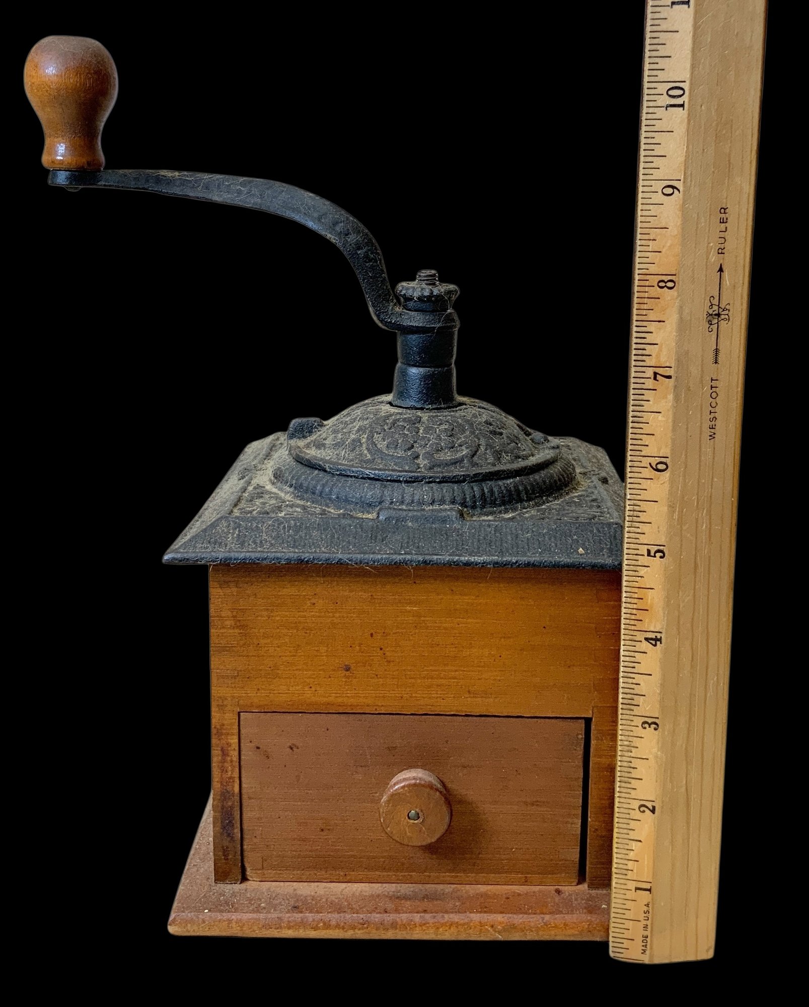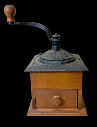 Vintage Wooden And Cast Iron Coffee Grinder. Manual cast iron coffee grinder with a wooden base and drawer. No visible cracks or chips, please see photos for more details. Measures approximately 10.75” high and 5.75” wide at the base. Quite heavy.