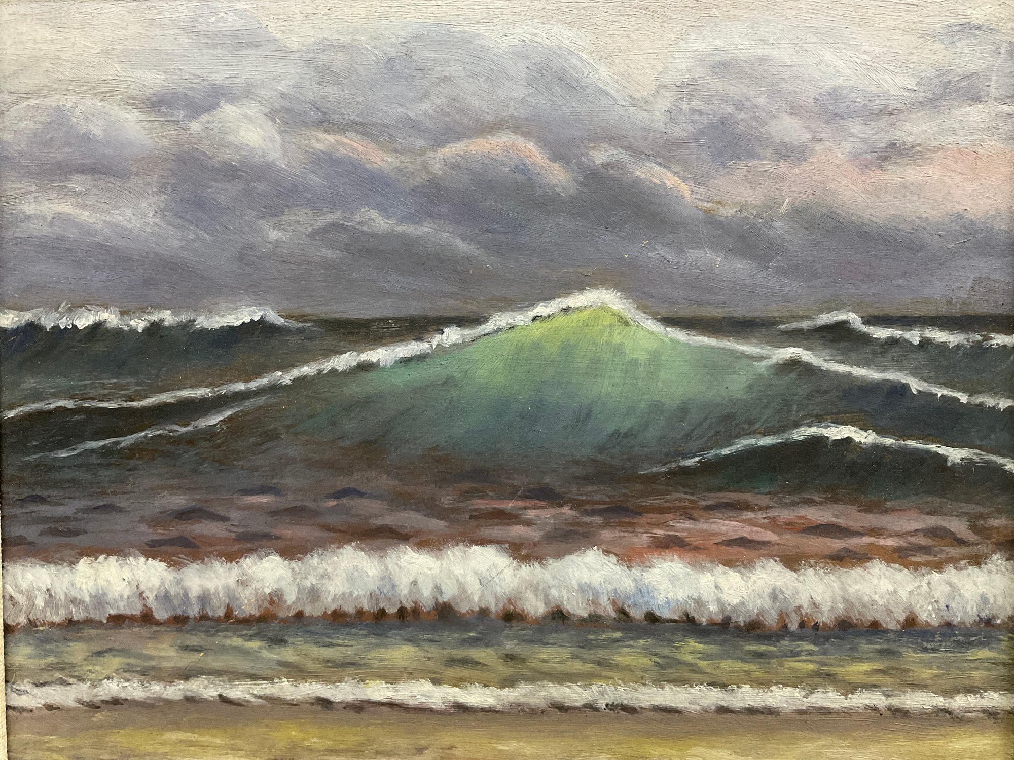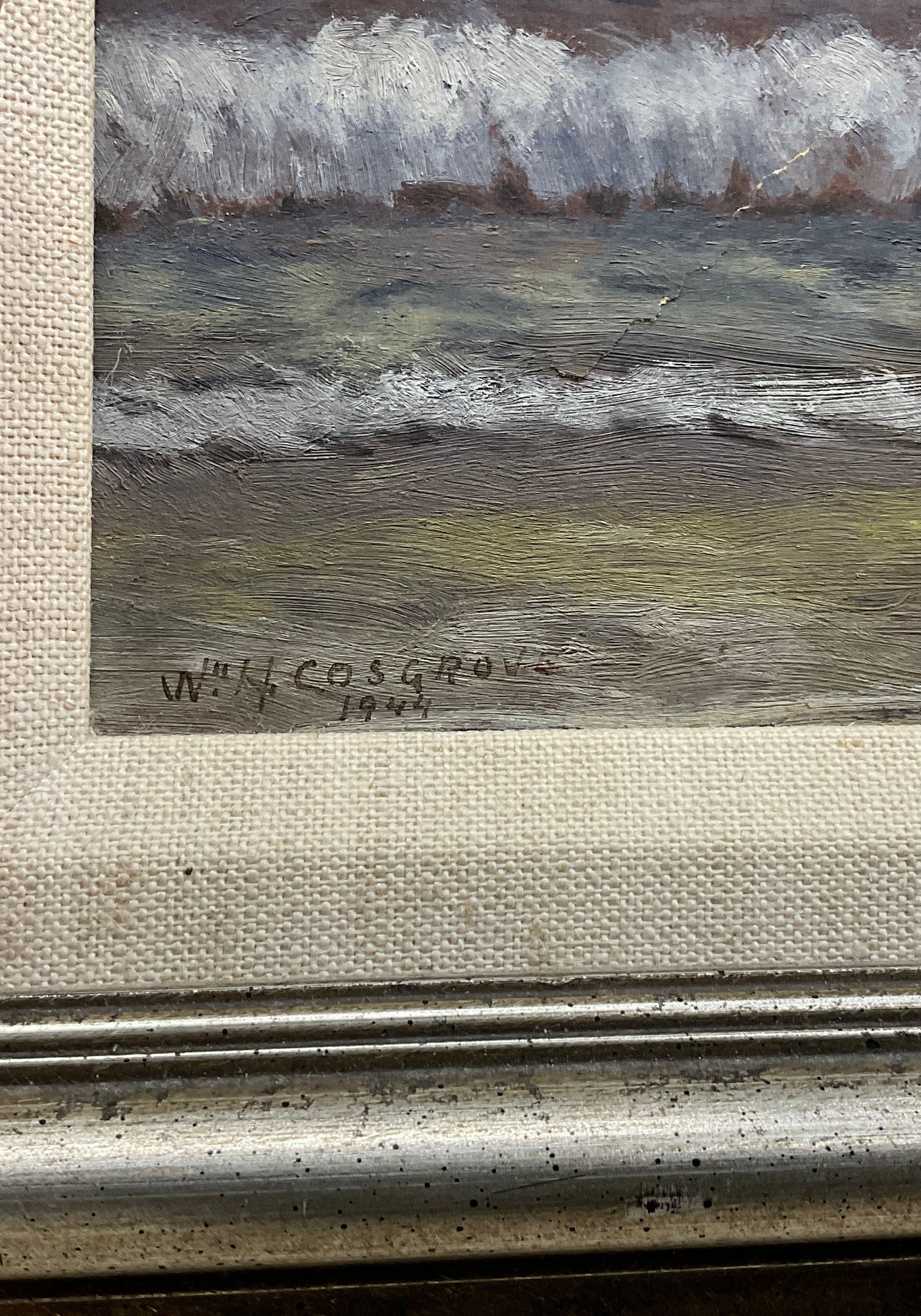W H Cosgrove Oil On Board Of Crashing Surf. In fair condition with one slight crack near signature and upper right, please see photos. Sight size is approx. 8.25” by 10.25” and frame size is approx. 13” by 15”.