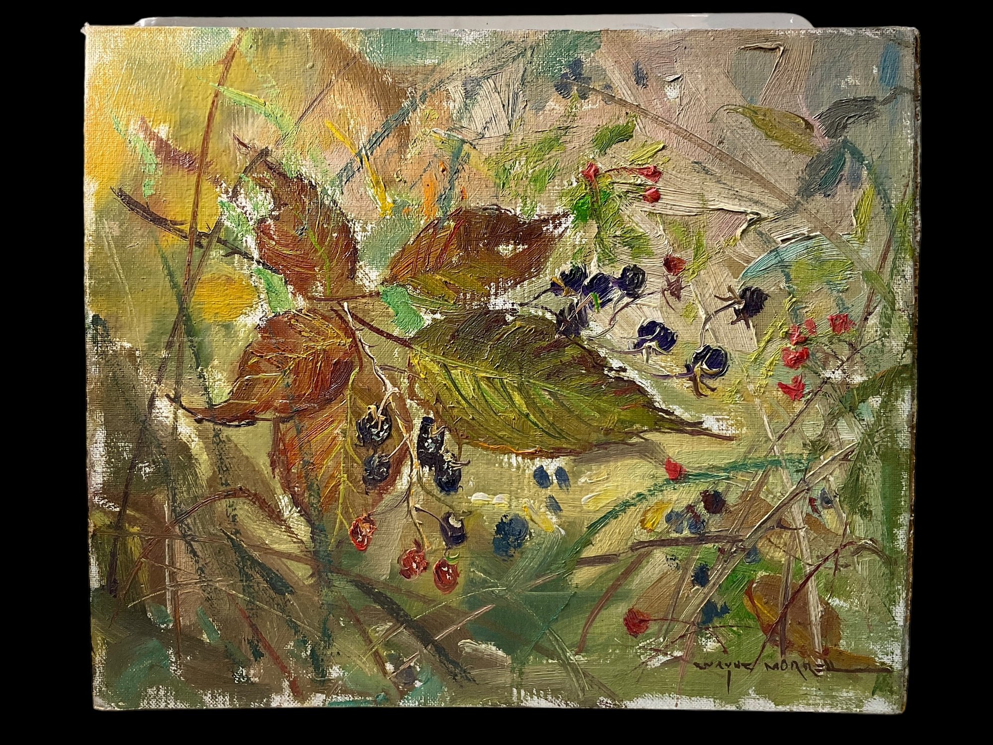 Wayne Morrell Oil Painting Leaves And Berries, oil on canvas board, canvas board appears to be affixed to Masonite. Measures 10” x 12.” Board is very slightly warped, but there is no damage to the painting itself, although the paint is thin in some places so that the white canvas peaks through, this was intentional.